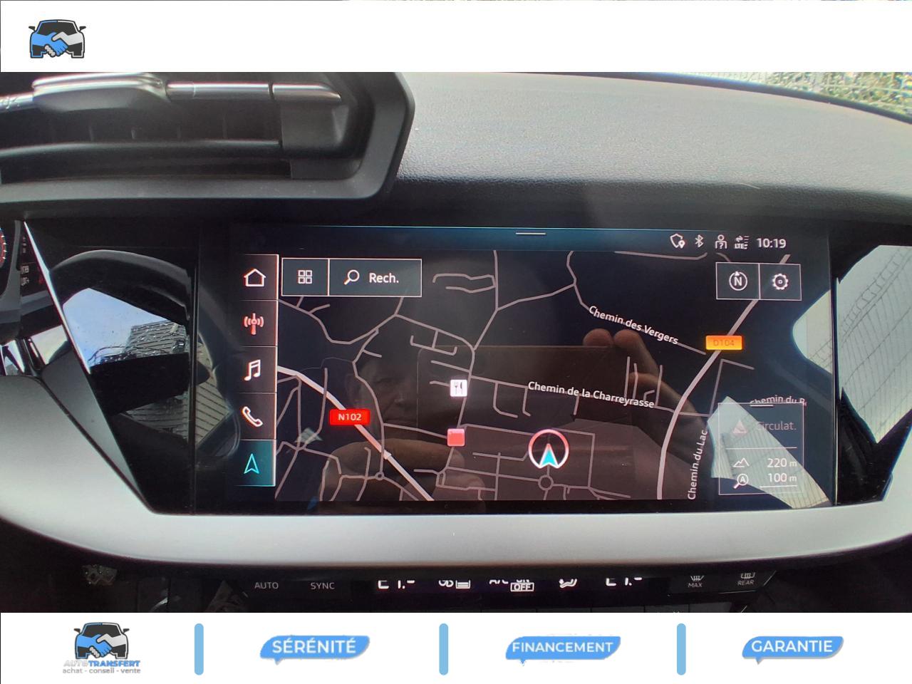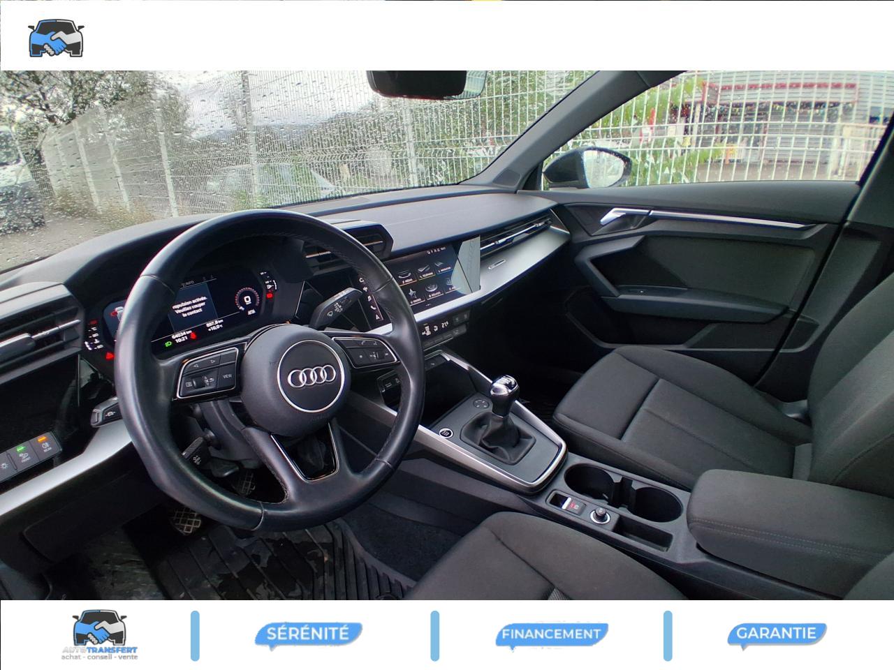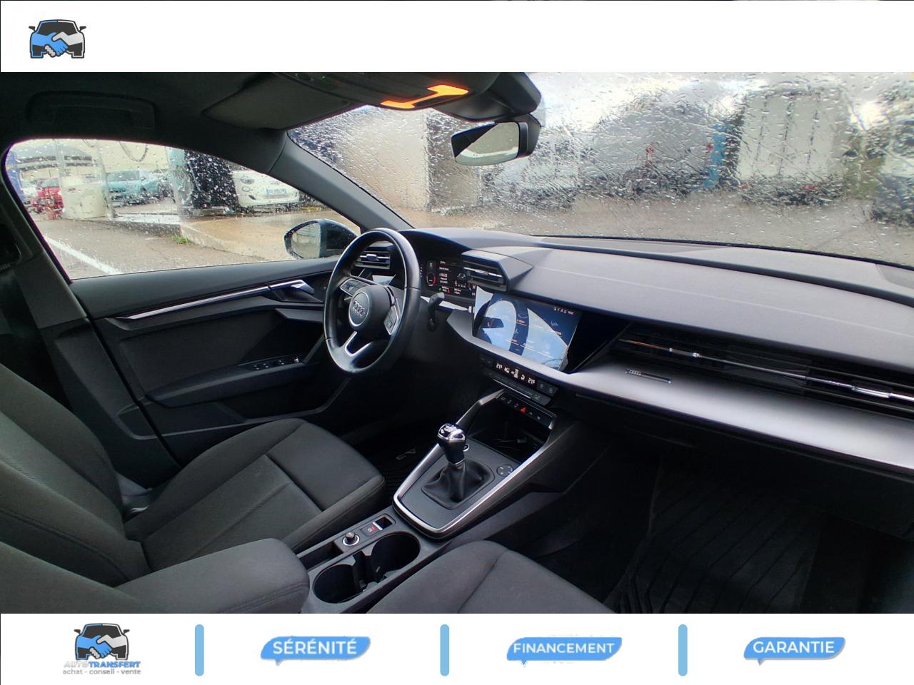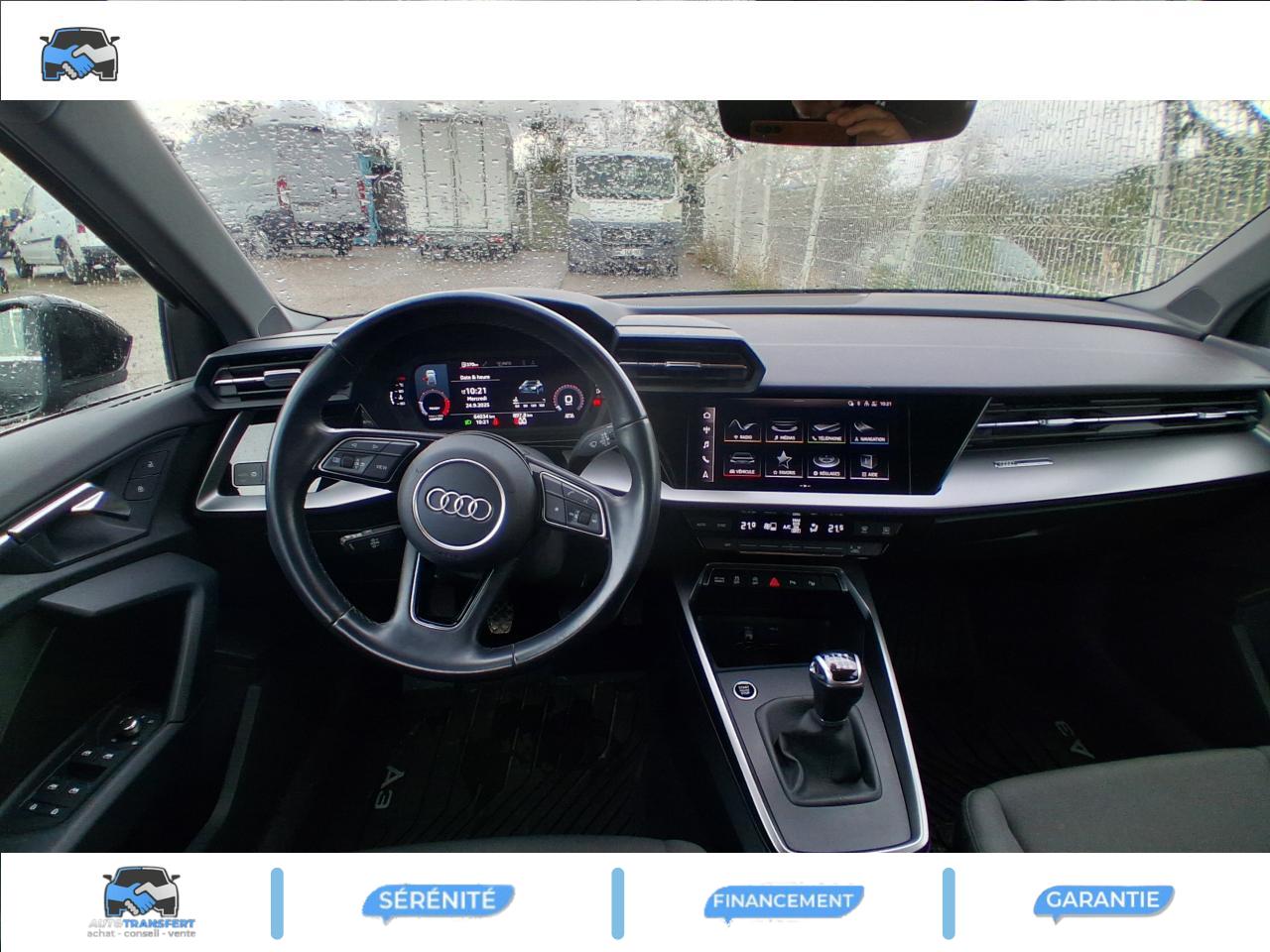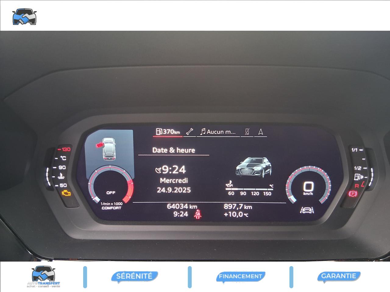 6 haut-parleurs (passifs)Accoudoir central coulissant en longueur, avec inclinaison réglableAppui lombaire à 4 axes avec réglage électrique, pour les sièges conducteur et passager avant, réglage horizontal et verticalAudi virtual cockpit : combiné d'instruments entièrement numérique de 10,25"Avertissement de sortie de voieCaméra de reculClimatisation automatique confort 2 zonesContrôle de la pression des pneumatiquesDétecteur de pluie et allumage automatique des projecteursInterface BluetoothKit anticrevaison (compresseur et produit de colmatage)Limiteur de vitessePare-brise avec isolation acoustiqueRéception radio numérique (DAB)Régulateur de vitesseSellerie tissu IndexTapis de sol avant et arrière