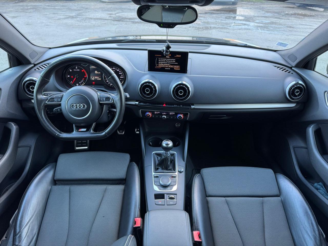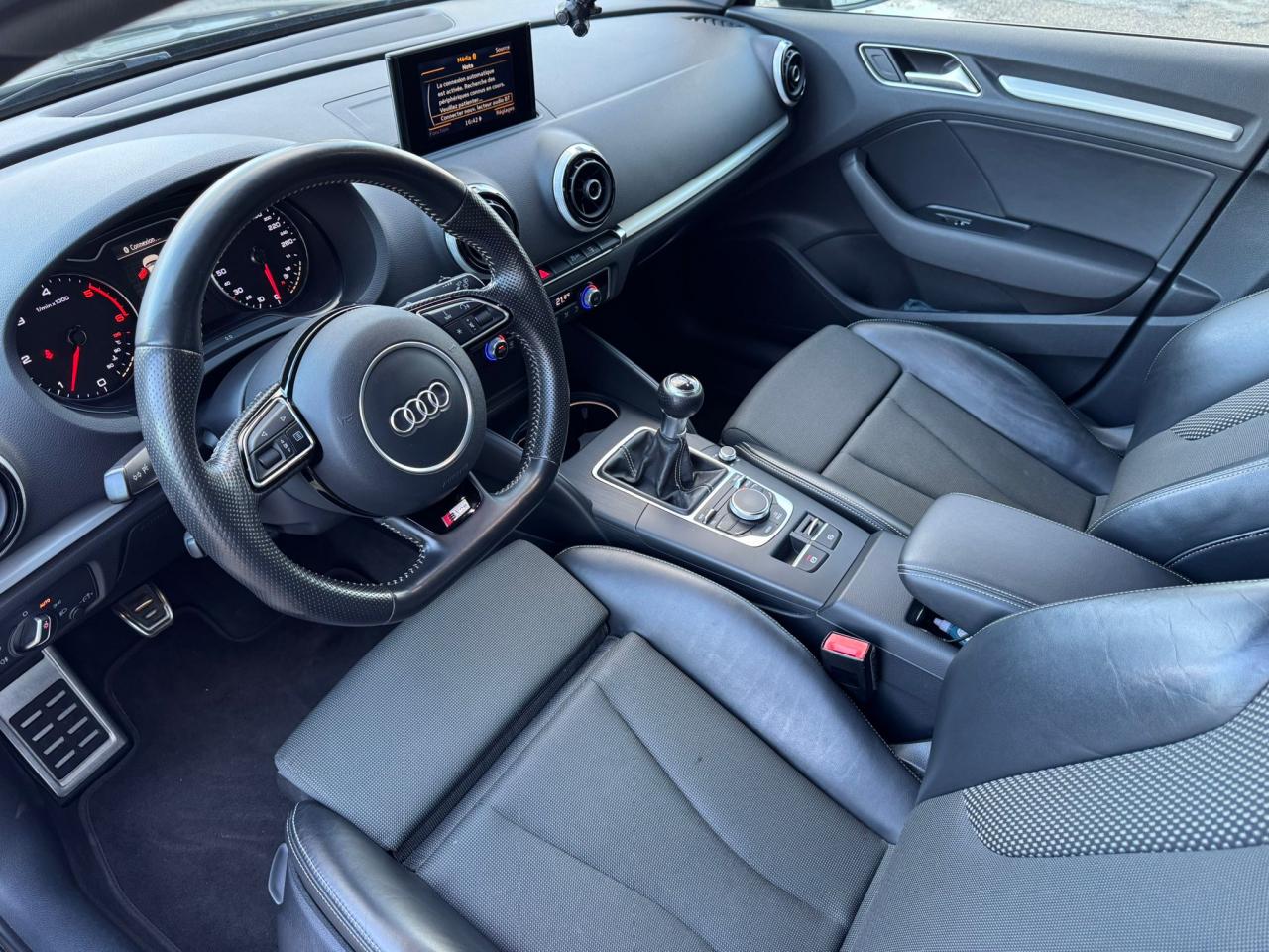 Accoudoir central avant coulissant en longueur, avec vide-poches relevable et inclinaison réglableAirbag genoux conducteurAirbags grand volume pour le conducteur et le passagerAirbags latéraux à l'avant intégrés au dossier des siègesAllume-cigare et cendrier amovible, couvercle chromé avec anneaux AudiAntipatinage (ASR)Applications décoratives sur les contre-portes et tableau de bord “Aluminium brossé mat”Audi drive select, permet différents réglages:Efficience, Confort, Dynamique, Auto et IndividuelAudi Singleframe avec encadrement chromé de la calandreBecquet de pavillon laqué dans la couleur de la carrosserie, avec inserts aérodynamiques latéraux noir brillantBlocage électronique de différentiel (EDS)Boîte à gants grand volume côté passager avant, éclairéeCache-bagages amovibleCarrosserie galvaniséeCeintures de sécurité 3 points automatiques pour toutes les places, prétensionneurs pyrotechniques, réglage des ceintures en hauteur à l'avant ; limiteurs de tension sur toutes les places extérieuresChâssis Sport, carrosserie surbaissée de 15 mm, avec suspension et amortisseurs plus fermesCiel de pavillon en tissu noirClimatisation automatique Confort avec réglage asservi à la position du soleilContrôle de ceinture attachée pour toutes les placesContrôle de pression des pneus ( TPMS )Contrôle électronique de stabilisation (ESC) avec blocage transversal électroniqueContrôle électronique de stabilisation (ESC) désactivable, avec amplificateur hydraulique de freinage d'urgenceDétecteur de pluie et de luminosité incluant bande grise dans la partie supérieure du pare-briseDirection assistée électromécanique avec assistance asservie à la vitesse (servotronic)Dossier de banquette arrière rabattable en deux parties 40/60 ou complètementEclairage intérieur à l'avant et à l'arrièreEcrous antivolEssuie-glace arrière avec déclenchement automatique en marche arrièreFeux arrière avec feux de recul blancs et feux de brouillard arrière, incluant troisième feu stop surélevé et éclairage de plaque à LEDFeux de freinage adaptatifsFixation pour sièges enfants ISOFIX et Top Tether pour les places arrière extérieuresIdentification du modèle/technologie sur le capot de coffreInscription “S line” sur les ailes avantJantes en aluminium coulé style 5 branches parallèles partiellement polies, 7,5 J x 18" avec pneus 225/40 R 18"Lave-essuie-glace 2 vitesses, 4 intervalles de balayage réglablesLève-vitres à l'avant et à l'arrière, électriques, avec protection antipincement, ouverture/fermeture par le verrouillage centralisé, fonction ouverture/fermeture par impulsionLunette arrière dégivrante, avec minuterieMiroir de courtoisie éclairéMMI RadioMoulures de seuils avec insert en aluminium et inscription “S line”Œilletons de fixation, 4 dans le coffre, pour maintenir les bagages et objets dans le coffre, points de fixation pour le filet mixte en optionOutillage de bord dans le coffre incluant un cricPack aluminium extérieurPack rangement et coffrePack rangement et coffrePare-brise acoustique, améliore l'isolation phonique du pare-brise et réduit les bruits extérieursPare-chocs dans la couleur de la carrosseriePare-soleil rabattables et pivotants, côtés conducteur et passager avant, avec miroir de courtoisie occultablePatères à vêtements sur les montants de pavillon centraux, à gauche et à droite, simplesPhares antibrouillard halogènes, intégrés à la jupe avantPoignées de maintien. 4 poignées avec mécanisme amortisseur, rabattables, encastrées dans le pavillonPommeau du levier/sélecteur de vitesses en cuir perforé noirPréparation pour téléphone portable (Bluetooth)Prise de courant 12 volts sur la console centrale à l'avantProtection antidémarrage électronique, intégrée à la gestion du moteur, activation automatique par la clé du véhiculeProtection latérale anticollision avec barres extrêmement rigides dans les portières et une structure latérale de carrosserie renforcéeRecommandation de repos qui analyse le comportement routier au moyen de différents capteursRégulateur de vitesseRétroviseur intérieur électrochromeRétroviseurs extérieurs avec clignotants à LED intégrés réglables électriquement et dégivrants, miroir asphérique à gauche, convexe à droite. Buses de lave-glace dégivrantesRoue de secours temporaire de type galetteSellerie mixte en tissu Biathlon et cuirSièges à l'avant avec positionnement en longueur et inclinaison de dossier réglables manuellementSièges conducteur et passager avant réglables en hauteurSièges Sport à l'avant avec bourrelets latérauxSignal sonore pour oubli d'extinction des feuxSorties d'échappement doubles à gauche chroméesSupport pour téléphone portable et clé avec compatiment séparé pour le rangement du téléphone portable et la clé du véhicule. Rangement intégré avec encadrement chromé sur la console centraleSystème d'airbags de têteSystème d'information du conducteur avec écran couleur haute résolution de 3,5 poucesSystème de freinage avec antiblocage (ABS) et répartiteur électronique de freinage (EBV)Système de ventilation et chauffage 4 diffuseurs d'air rondsTapis complémentaires à l'avant et à l'arrière assortis à la couleur de la moquetteTémoins de contrôle pour, entre autres : airbag, ABS, ESC/ASR, frein de stationnement serré, électronique EDS, phares, clignotants, circuit de freinage, pression d'huile moteur, fermeture du coffre, système électrique du moteur, système de pr&eacuTriangle de présignalisation fixé sur l'intérieur du capot du coffreTrousse de secours dans le vide-poches sous le siège passagerVerrouillage centralisé à télécommandeVide-poches sur les habillages des portières ainsi que sur la console centrale avec porte-boissonVolant réglable en hauteur et en profondeurVolant Sport 3 branches multifonction en cuir badgé S line avec méplat et poignées de volant en cuir perfor