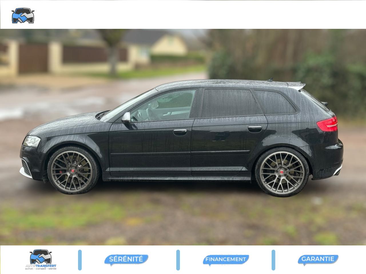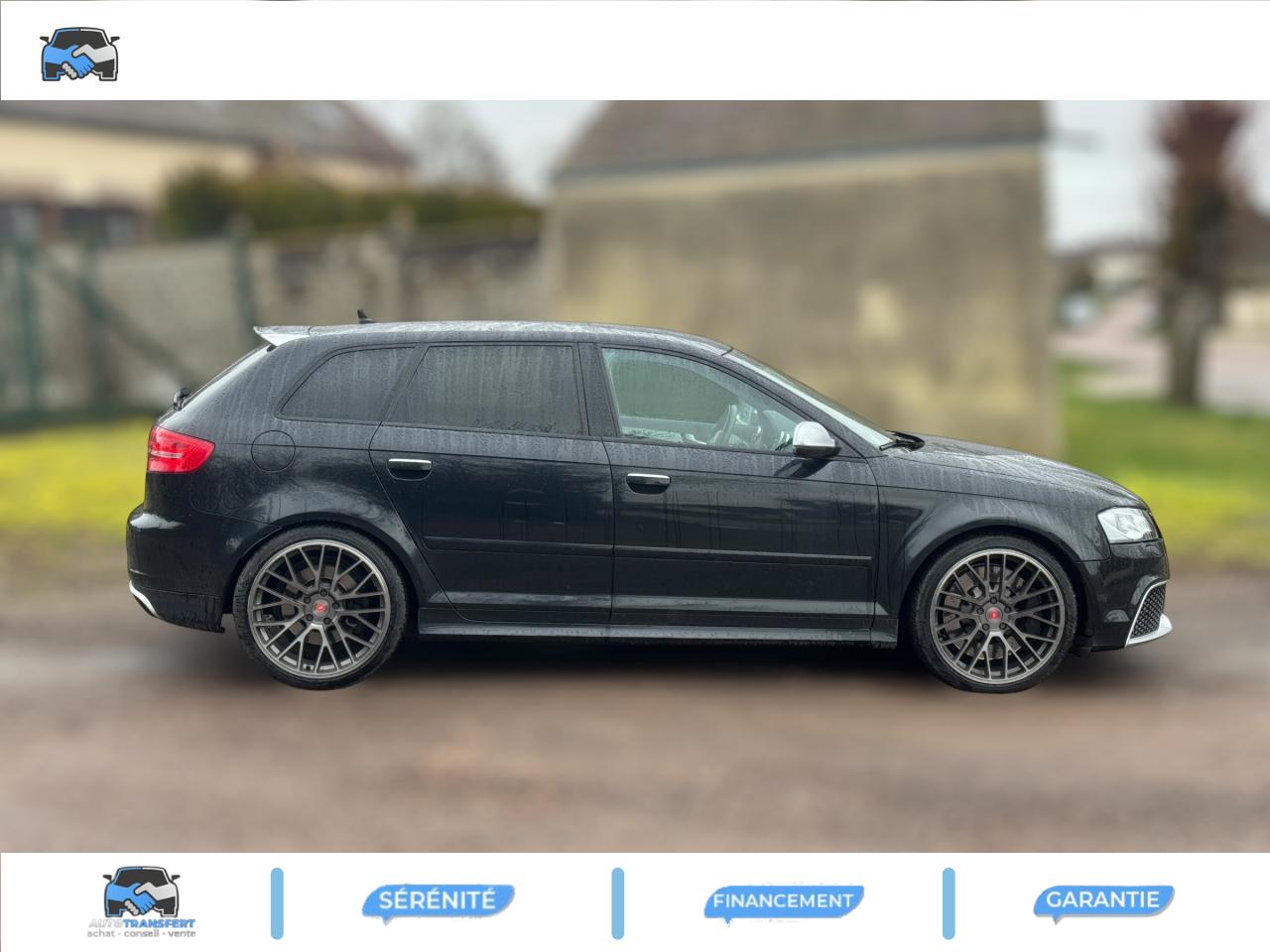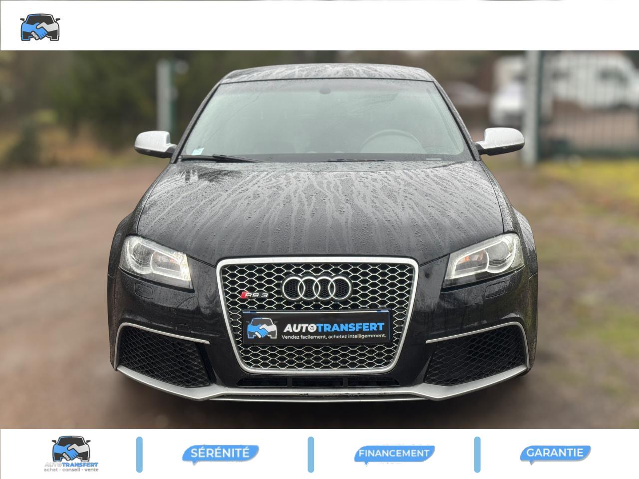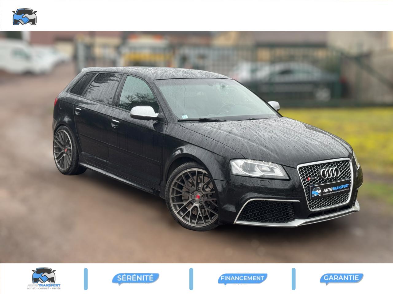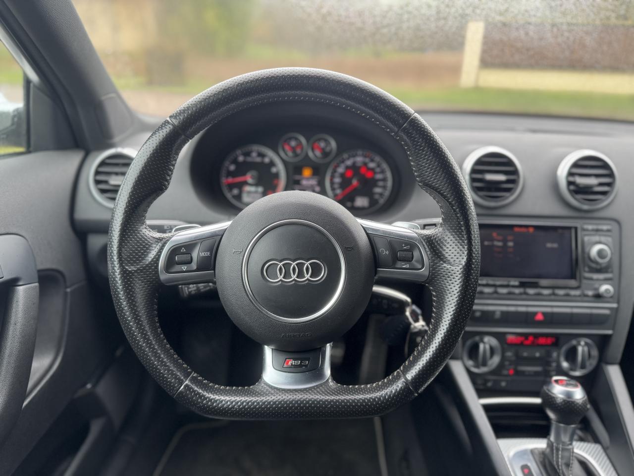 ABS (Antiblocage de roues)Accoudoir central avant en une seule partie et rabattable avec vide-pochesAirbags : airbags grand volume côtés conducteur et passager avant, deux niveaux de gonflement, airbag passager avant désactivable ; airbags latéraux (tête/thorax) à l'avant, intégrés au dossier des siègesAlarme antivol, avec protection antiremorquage, incluant protection volumétrique de l'habitacleApplications décoratives en piano laqué noir sur les contre-portes et la console centraleAppuie-têtes à toutes les places, actifs à l'avant ; réglables à l'avant et à l'arrièreASR (antipatinage)Audi BackguardAudi Hill Hold AssistAudi Premium Tracking System : système de localisation et d'immobilisation par satellite couplé à l'alarme antivolAudi SingleframeAutoradio symphony, avec changeur 6 CD en façade et compatibilité MP3, prise AUX-INAvertisseur ''2 tons''Baguettes latérales dans la couleur de la carrosserieBAS : amplificateur hydraulique de freinage d'urgenceBecquet de pavillon RS 3 sur le hayonBoîte à gants grand volume côté passager avant, éclairéeBose Sound SystemCache-bagagesCarrosserie galvaniséeCatadioptres de portière passifsCeintures de sécurité : ceintures trois points à enrouleur à toutes les places, avec prétensionneurs et limiteurs de tension à l'avantChâssis Sport RS 3 avec suspension et amortisseurs dynamiques et cinématique élastique adaptéeCiel de pavillon en tissu noirClimatisation automatique Confort avec réglage asservi à la position du soleil, réglage de température gauche/droite séparéColonne de direction de sécurité, complète le potentiel de protection de la ceinture et de l'airbagCommande des feux pour feux de stationnement, feux de route et feu arrière de brouillardConsole centrale avec commandes du chauffage et vide-pochesContre-portes avec partie centrale en Alcantara et accoudoirs intégrésCrochets pour sacs à gauche et à droite dans le coffreDétecteur d'occupation du siège conducteurDétecteur de luminositéDéverrouillage du coffre par touche assistée électriquement, commande supplémentaire pour déverrouiller le coffre depuis la place conducteurDiffuseurs d'air ronds avec cerclage style aluminiumDirection assistée électromécanique, assistance asservie à la vitesse, avec rappel de direction actif, correction automatique de trajectoire en ligne droiteDirection électromécanique à assistance variableEBV : Répartiteur électronique de freinageEclairage blanc, réglable, sur les instruments ; éclairage rouge sur les commandes et le tableau de la climatisationEclairage dans le coffreEclairage intérieur à temporisation avec contacteur sur toutes les portières ; éclairage pour le conducteur, le passager avant et dans le coffreEcrous antivolEDS (blocage électronique de différentiel)Essuie-glace arrière avec commande de lavage-balayage automatiqueEssuie-glace deux vitessesExtensions de passage de roue à l'avant en plastique renforcé de fibres de carboneFeux arrière rouges, avec auréole de lumière continue en tubes de fi bre optique éclairés par LED, feu de recul blanc, avec feu arrière de brouillardInscription RS 3 sur la calandre, le capot de coffre, les baguettes des seuils de portes, les étriers de freins avant, le volant Sport, le pommeau de levier de vitesses et le compte-toursInstrumentation avec cadrans noirsInstrumentation style RSJantes en aluminium coulé style 5 branches en hélice finition titane, polies brillant, 8 J x 19” avec pneus 225/35 R 19” à l'arrièreJantes en aluminium coulé style 5 branches en hélice finition titane, polies brillant, 8 J x 19” avec pneus 235/35 R 19” à l'avantLunette arrière dégivrante avec minuterie, dégivrage complémentaire en fi n de balayage de l'essuie-glaceMiroir de courtoisie côté conducteur et passagerOeilletons de fixation dans le coffreOutillage de bordPack EclairagePare-chocs arrière spécifique avec diffuseur d'air de couleur noirePare-chocs avant spécifique avec larges prises d'air à l'avantPare-chocs dans la couleur de la carrosseriePare-soleil gauche et droite rabattables et pivotants, avec miroir de courtoisie occultable, troisième pare-soleil rabattable au-dessus du rétroviseur intérieurPare-soleil pour la lunette arrièrePatères sur les montants de pavillon centraux, 2 patèresPédalier en aluminiumPoignées de maintien, rabattables avec amortisseur, intégrées au pavillon, 4 poignéesPoignées de portières affleurantes dans la couleur de carrosseriePommeau de levier de vitesses RS 3 en cuir perforé avec anneau décoratif style aluminiumPorte-boissons avant avec jalousie, double, sur le tunnel centralPréparation pour iPodPréparation pour téléphone 2 W bi-bande (D et E)Prise de courant à l'avant, avec vide-poches sur la console centraleProgramme électronique de stabilisation ESP avec mode Sport, désactivable sur 2 niveaux, assure davantage de stabilité en agissant de manière ciblée sur le freinage individuel des roues et sur la gestion du moteurProtection anticollision latérale dans les portières, constituée de profilés d'aluminium rigidesProtection antidémarrage intégrée à la commande du moteur, activation automatique par la clé de contactProtection durable sous le plancher et dans les passages de roueQuattro : transmission intégrale permanente avec répartition asymétrique et dynamique de coupleRécupération durant les phases de décélération et de freinage, l'énergie cinétique est convertie en énergie électrique utilisable ; cette énergie permet de soulager l'alternateur lorsque la voiture accélèreRégulateur de vitesseRepose-piedRéservoir situé dans une zone protégéeRétroviseurs extérieurs style aluminium mat avec rappels de clignotant à diodes, asphérique côté conducteur, convexe côté passager avant, dégivrants et escamotables électriquementSeuils de portes avec inserts en aluminium et emblème RS 3Sideguard, système d'airbags de tête grand format, se d
