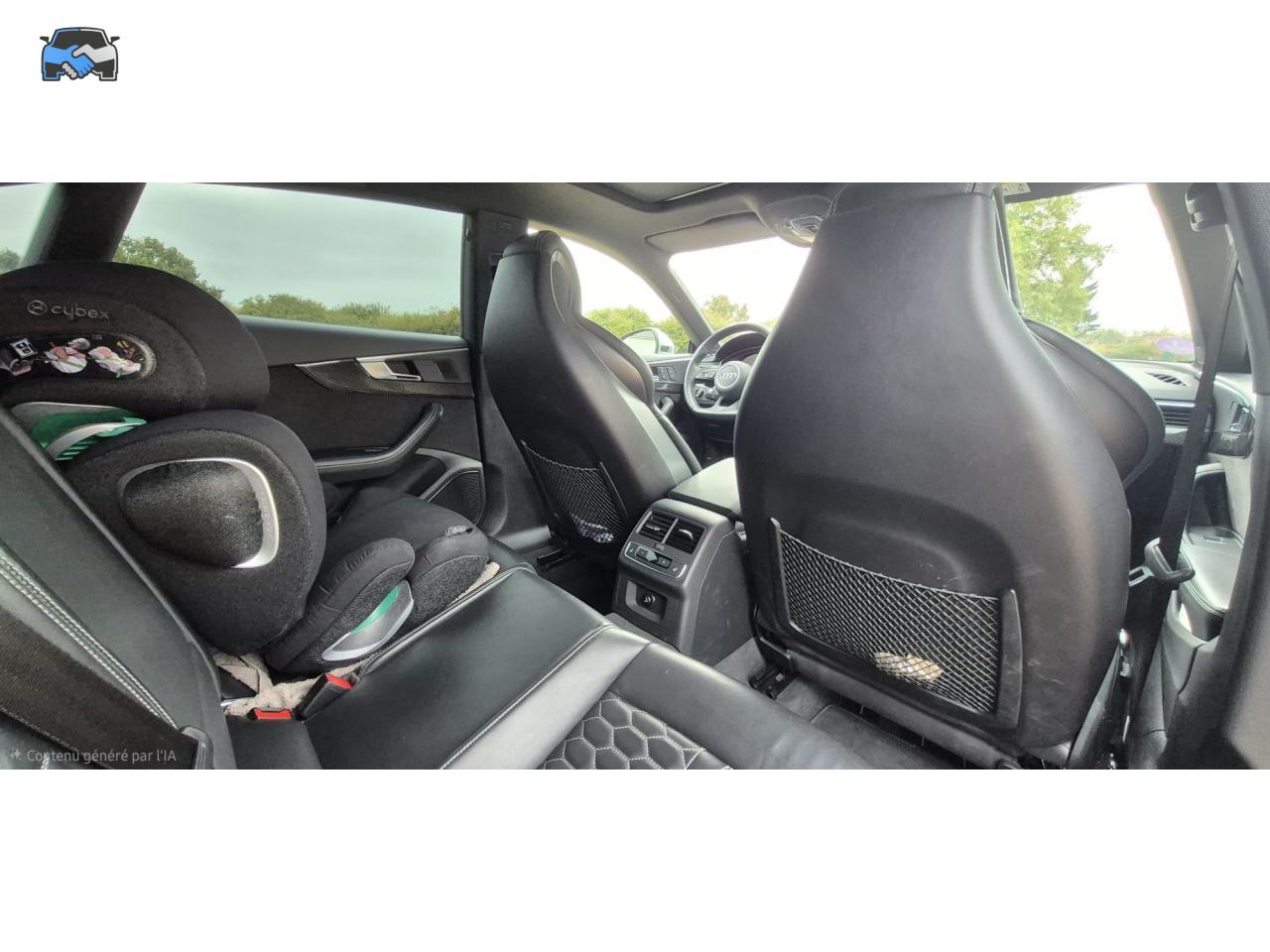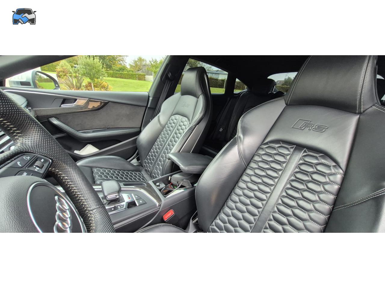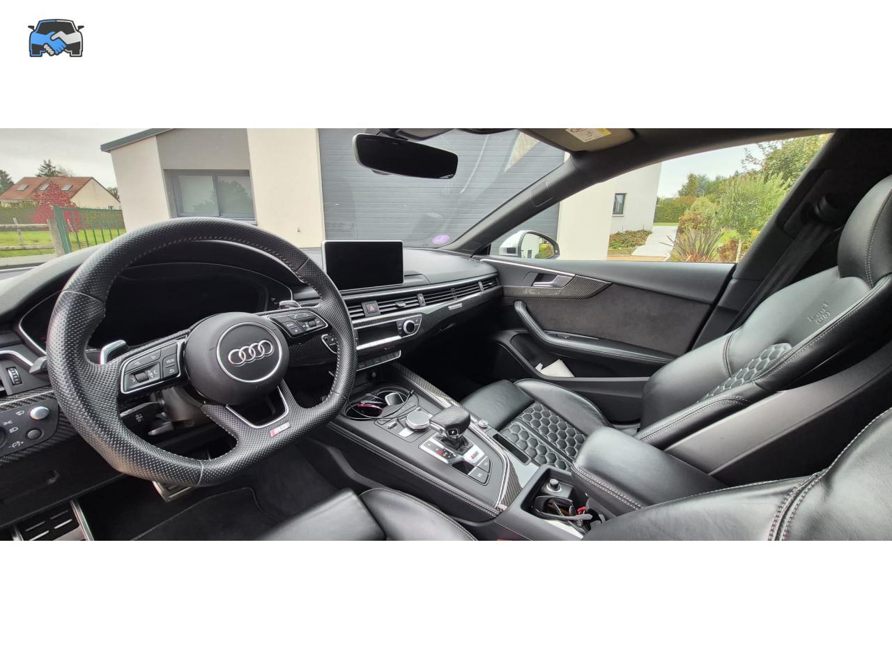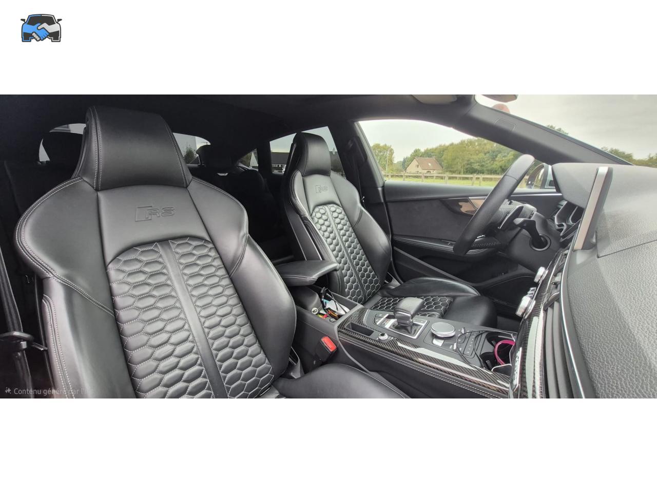 Accès ConfortAccoudoir central confort à l'avant avec inclinaison réglable et coulissant en longueurAffichage du contrôle de la pression des pneumatiquesAirbags grand volume pour le conducteur et le passagerAirbags latéraux à l'avant et système d'airbags de têteAntipatinage ASR pour une motricité optimale, empêche le patinage des roues motricesApplications décoratives en aluminium RacingAudi connectAudi connect "Sécurité et Service"Audi Drive SelectAudi Hold AssistAudi phone box avec chargeur sans filAudi smartphone interfaceAudi sound system : 10 haut-parleurs incluant un haut-parleur central et un subwoofer ; amplificateur à 6 canaux avec une puissance totale de 180 wattsAudi Tracking System : système d'immobilisation et de localisation du véhicule par satelliteAudi virtual cockpit avec menu spécifique RSBanquette arrière 3 placesBlocage électronique de différentiel (EDS)Câbles de recharge pour téléphone portable, compatibles iPhone et AndroidCalandre singleframe structure nid d'abeilles noir brillant avec cadre en aluminium mat, inscription quattro en noir et logo RS 5Ceinture de sécurité réglable en hauteurCeintures de sécurité automatiques à trois points pour tous les sièges et contrôle de port de ceinture à l’avantChâssis Sport RSCiel de pavillon en tissu noirClé confortClimatisation automatique Confort Plus 3 zones à fonctionnalités étendues et affichage numériqueColonne de direction de sécurité, contient un système mécanique de déplacement avec fonction d'amortissement qui complète le potentiel de sécurité de la ceinture et de l'airbagContrôle électronique de stabilisation (ESC) avec mode SportCoques de rétroviseurs extérieurs en aluminiumDésactivation de l'airbag du passager avantDétecteur de pluie et allumage automatique des projecteursDirection assistée électromécaniqueDossier de banquette arrière 2 places, rabattable à distance et en trois parties 40 : 20 : 40 ou complètementEcrous antivolFixation pour sièges enfants ISOFIX et Top Tether pour les places arrière extérieuresFrein de stationnement electromécaniqueGrilles d'entrée d'air latérales et applications en aluminium mat, spoiler avant noir, baguettes latérales en noir, diffuseur arrière noir et baguette horizontale en aluminium matHayon à ouverture et fermeture automatiquesInscriptions RS 5 sur les ailes avantInterface BluetoothJantes aluminium forgé 10 branches, 19''Lave-pharesLimiteur de vitesse réglable et régulateur de vitesseNavigation MMI plus avec MMI touchPack Assistance CityPack EclairagePare-chocs spécifiques RS style dynamique et sportifPare-soleilPhares à LED avec clignotants arrière à LED dynamiquesProjecteurs avant et phares arrière foncésQuattro : transmission intégrale permanente avec répartition asymétrique et dynamique de coupleRétroviseur intérieur électrochrome sans contourRétroviseurs extérieurs avec clignotants à LED intégrésRétroviseurs extérieurs réglables et escamotables électriquement, jour/nuit automatique, dégivrants des deux côtés et buses de lave-glaces dégivrantesRecommandation de repos qui analyse le comportement routier au moyen de différents capteursSellerie cuir / Alcantara avec surpiqûres contrastées et embossé RSSièges AV avec massage lombaireSièges avant chauffantsSièges avant réglables électriquement avec fonction mémoires pour le siège conducteurSièges Sport RS à l'avant avec appuie-tête intégrésSorties d'échappement chromées doubles, une à gauche et une à droiteSystème Stop & StartTapis complémentaires à l'avant et à l'arrièreTeinte vernie Gris NardoTiptronic : boîte automatique 8 rapports avec programme de commande dynamique (DSP)Tire Mobility System : compresseur et produit de colmatage en cas de crevaisonTriangle de présignalisation et trousse de secoursVitres athermiquesVolant 3 branches multifonctions plus en cuir avec méplat avec logo RS