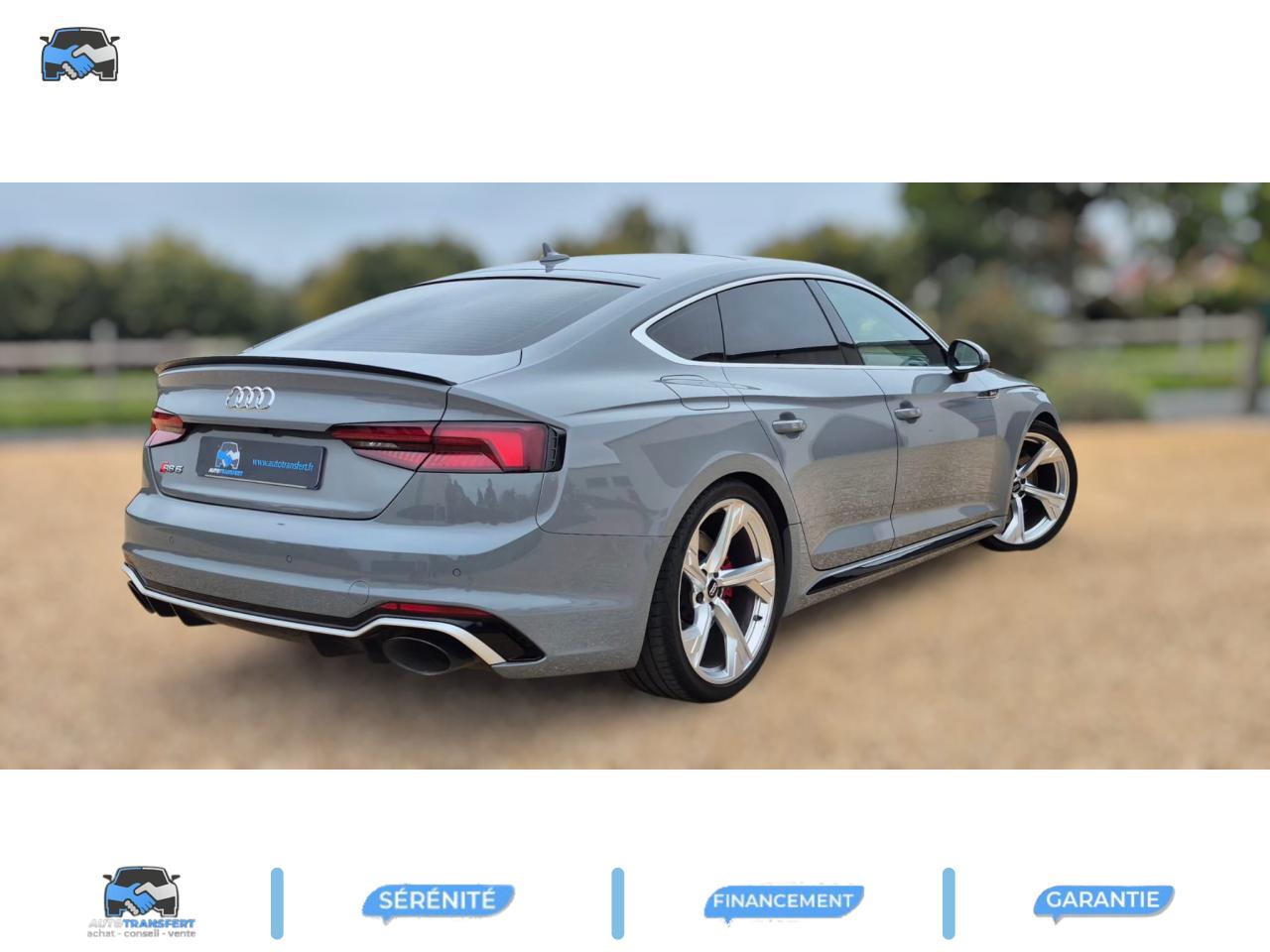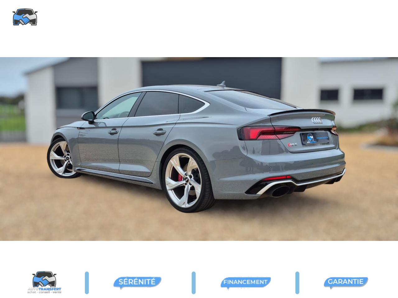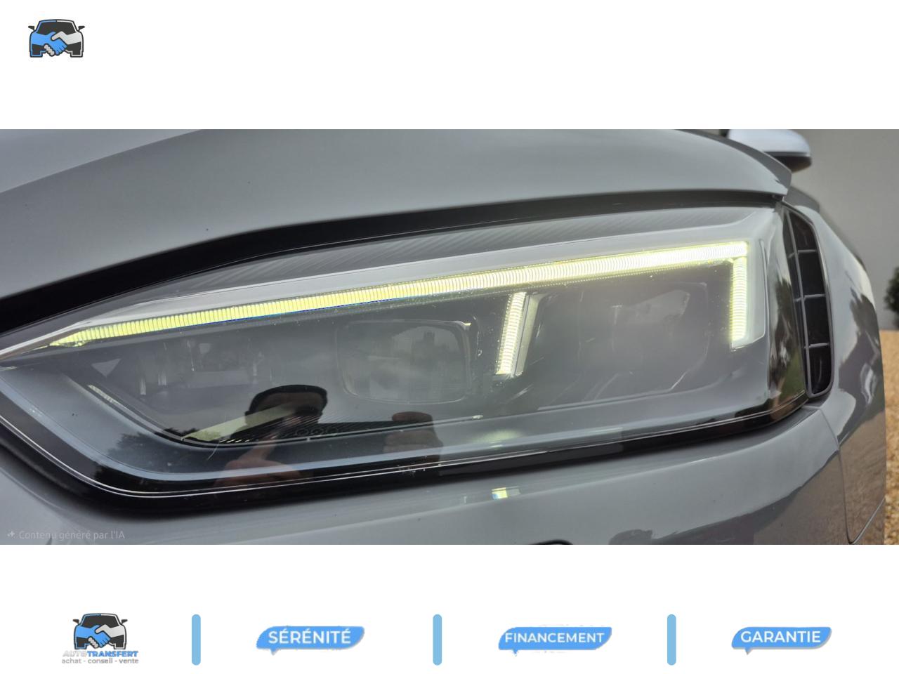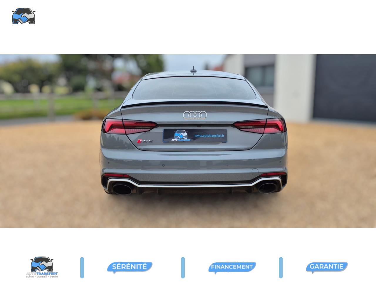 Accès ConfortAccoudoir central confort à l'avant avec inclinaison réglable et coulissant en longueurAffichage du contrôle de la pression des pneumatiquesAirbags grand volume pour le conducteur et le passagerAirbags latéraux à l'avant et système d'airbags de têteAntipatinage ASR pour une motricité optimale, empêche le patinage des roues motricesApplications décoratives en aluminium RacingAudi connectAudi connect "Sécurité et Service"Audi Drive SelectAudi Hold AssistAudi phone box avec chargeur sans filAudi smartphone interfaceAudi sound system : 10 haut-parleurs incluant un haut-parleur central et un subwoofer ; amplificateur à 6 canaux avec une puissance totale de 180 wattsAudi Tracking System : système d'immobilisation et de localisation du véhicule par satelliteAudi virtual cockpit avec menu spécifique RSBanquette arrière 3 placesBlocage électronique de différentiel (EDS)Câbles de recharge pour téléphone portable, compatibles iPhone et AndroidCalandre singleframe structure nid d'abeilles noir brillant avec cadre en aluminium mat, inscription quattro en noir et logo RS 5Ceinture de sécurité réglable en hauteurCeintures de sécurité automatiques à trois points pour tous les sièges et contrôle de port de ceinture à l’avantChâssis Sport RSCiel de pavillon en tissu noirClé confortClimatisation automatique Confort Plus 3 zones à fonctionnalités étendues et affichage numériqueColonne de direction de sécurité, contient un système mécanique de déplacement avec fonction d'amortissement qui complète le potentiel de sécurité de la ceinture et de l'airbagContrôle électronique de stabilisation (ESC) avec mode SportCoques de rétroviseurs extérieurs en aluminiumDésactivation de l'airbag du passager avantDétecteur de pluie et allumage automatique des projecteursDirection assistée électromécaniqueDossier de banquette arrière 2 places, rabattable à distance et en trois parties 40 : 20 : 40 ou complètementEcrous antivolFixation pour sièges enfants ISOFIX et Top Tether pour les places arrière extérieuresFrein de stationnement electromécaniqueGrilles d'entrée d'air latérales et applications en aluminium mat, spoiler avant noir, baguettes latérales en noir, diffuseur arrière noir et baguette horizontale en aluminium matHayon à ouverture et fermeture automatiquesInscriptions RS 5 sur les ailes avantInterface BluetoothJantes aluminium forgé 10 branches, 19''Lave-pharesLimiteur de vitesse réglable et régulateur de vitesseNavigation MMI plus avec MMI touchPack Assistance CityPack EclairagePare-chocs spécifiques RS style dynamique et sportifPare-soleilPhares à LED avec clignotants arrière à LED dynamiquesProjecteurs avant et phares arrière foncésQuattro : transmission intégrale permanente avec répartition asymétrique et dynamique de coupleRétroviseur intérieur électrochrome sans contourRétroviseurs extérieurs avec clignotants à LED intégrésRétroviseurs extérieurs réglables et escamotables électriquement, jour/nuit automatique, dégivrants des deux côtés et buses de lave-glaces dégivrantesRecommandation de repos qui analyse le comportement routier au moyen de différents capteursSellerie cuir / Alcantara avec surpiqûres contrastées et embossé RSSièges AV avec massage lombaireSièges avant chauffantsSièges avant réglables électriquement avec fonction mémoires pour le siège conducteurSièges Sport RS à l'avant avec appuie-tête intégrésSorties d'échappement chromées doubles, une à gauche et une à droiteSystème Stop & StartTapis complémentaires à l'avant et à l'arrièreTeinte vernie Gris NardoTiptronic : boîte automatique 8 rapports avec programme de commande dynamique (DSP)Tire Mobility System : compresseur et produit de colmatage en cas de crevaisonTriangle de présignalisation et trousse de secoursVitres athermiquesVolant 3 branches multifonctions plus en cuir avec méplat avec logo RS