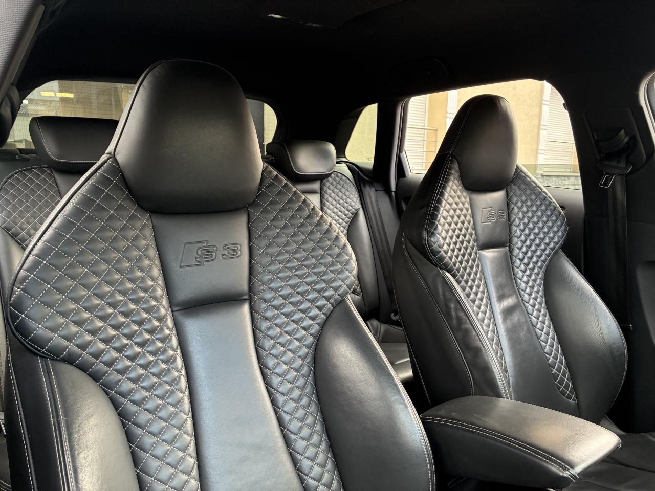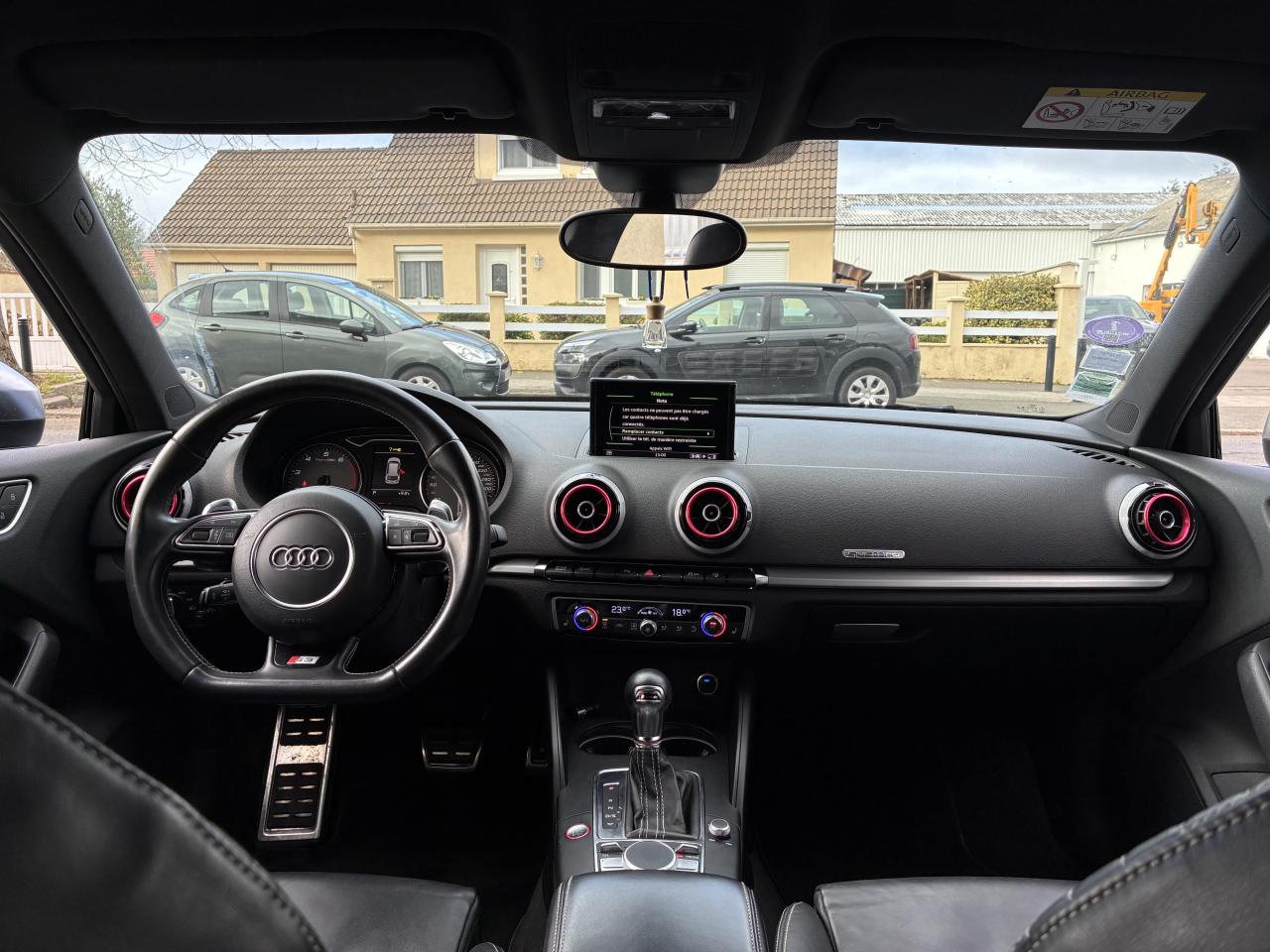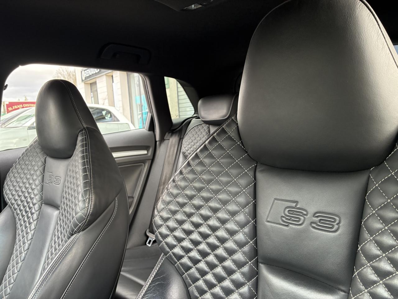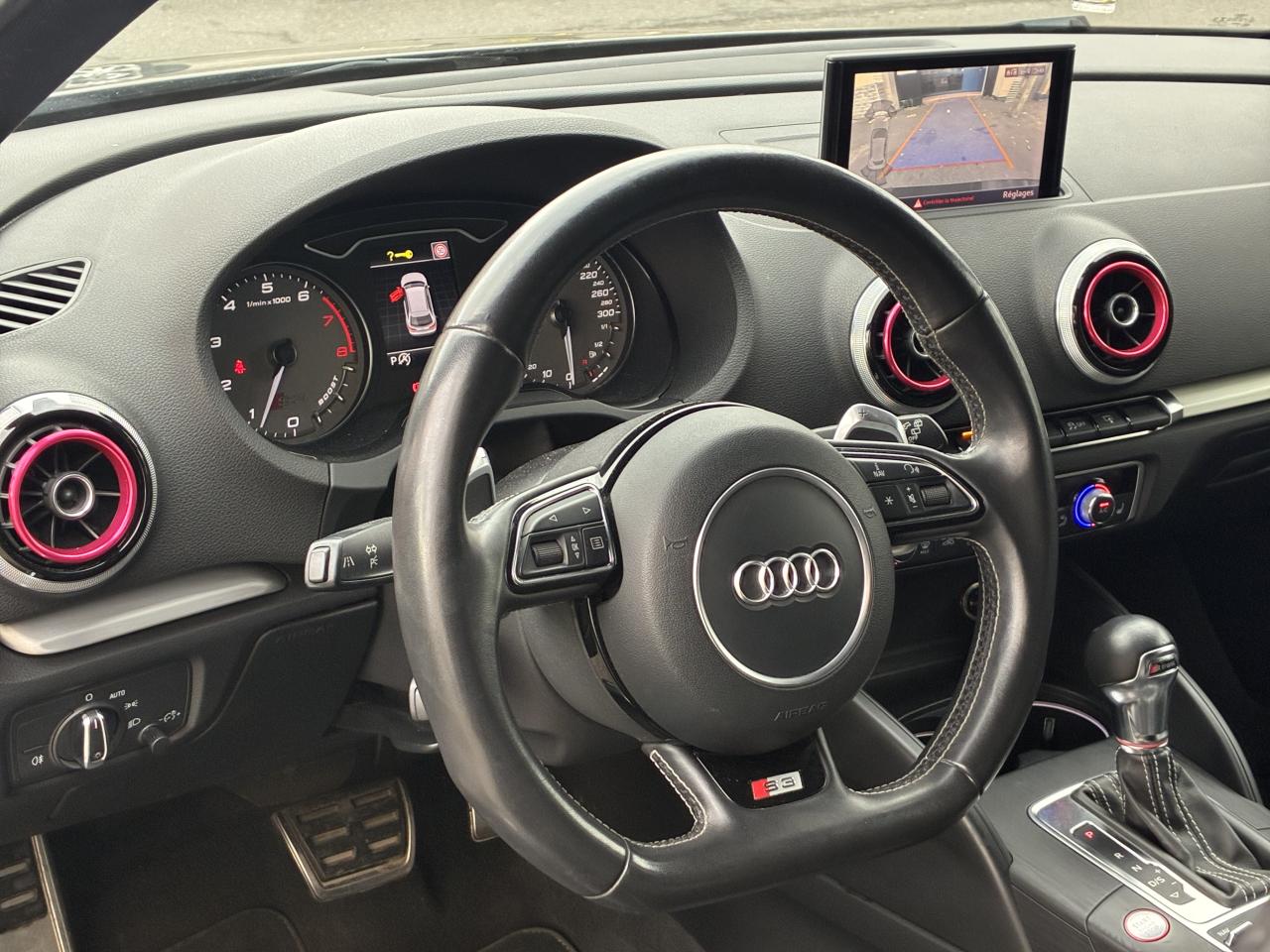 Accoudoir central avant coulissant en longueur, avec vide-poches relevable et inclinaison réglableAirbag genoux conducteurAirbags grand volume pour le conducteur et le passagerAirbags latéraux à l'avant intégrés au dossier des siègesAlarme antivol : avec protection anti-remorquage par capteur d'angle d'inclinaisonAllume-cigare et cendrier amovible, couvercle chromé avec anneaux Audi, allume-cigare sur la console centrale au lieu de la prise 12 volts de sérieAntipatinage (ASR) : empêche le patinage des roues motrices en réduisant la puissance du moteur, assure davantage de stabilité et une meilleure tractionApplications décoratives sur les contre-portes et tableau de bord "Aluminium brossé mat"Audi Drive Select, permet différents réglagesAudi parking system à l'arrière facilitant le stationnement dans les limites du système à l'aide d'un signal sonoreAudi Premium Tracking SystemAudi Sound System avec 10 haut-parleursBecquet de pavillon S3, laqué dans la couleur de la carrosserie, avec inserts aérodynamiques latéraux noir brillantBlocage électronique de différentiel (EDS) : freine automatiquement les roues motrices sur route glissante et inégalement adhérente, assurant ainsi une excellente motricitéBoîte à gants grand volume côté passager avant, éclairéeCache-bagages amovibleCalandre Audi singleframe gris platine avec entretoises horizontales chromées, avec anneaux Audi chromés au centreCarrosserie galvanisée (entièrement galvanisée aux endroits sensibles à la corrosion)Ceintures de sécurité 3 points automatiques pour toutes les placesChâssis Sport S surbaissé de 25 mm, avec suspension et amortisseurs plus fermesCiel de pavillon en tissu noirClé avec emblème S3Climatisation automatique Confort avec réglage asservi à la position du soleilContrôle de ceinture attachée pour toutes les placesContrôle de pression des pneus ( TPMS )Contrôle électronique de stabilisation (ESC) désactivable, avec amplificateur hydraulique de freinage d'urgenceDétecteur de pluie et allumage automatique des projecteursDirection progressive contribuant à une augmentation de la dynamique de conduiteDossier de banquette arrière rabattable en deux parties 40/60 ou complètementFeux arrière avec feux de recul blancs et feux de brouillard arrière, incluant troisième feu stop surélevé et éclairage de plaque à LEDFeux de freinage adaptatifsInscriptions S3 sur la calandre, le capot de coffre, les baguettes des seuils de portes, les étriers de freins avant, le volant Sport, le pommeau de levier de vitesses et le compte-toursLave-essuie-glace 2 vitesses, 4 intervalles de balayage réglablesLève-vitres à l'avant et à l'arrièreLunette arrière dégivrante, avec minuterie; chauffage supplémentaire de l'extrémité inférieure de l'essuie-glace arrièreMiroir de courtoisie côté conducteur et passagerMMI GPS plus avec données de navigationPack aluminium intérieurPack EclairagePare-brise acoustique, améliore l'isolation phonique du pare-brise et réduit les bruits extérieursPare-chocs dans la couleur de la carrosseriePare-chocs laqués dans la couleur de carrosserie avec prises d'air latérales accentuées, extension de bas de caisse ainsi que diffuseur S à l'arrière au design résolument sportifPare-soleil rabattables et pivotants, côtés conducteur et passager avant, avec miroir de courtoisie occultablePédalier en acier inoxydable brosséPoignées de maintien. 4 poignées avec mécanisme amortisseur, rabattables, encastrées dans le pavillonPréparation pour téléphone portable (Bluetooth), commande sur volant multifonction, mains libres et audiostreamingPrise de courant 12 volts sur la console centrale à l'avantProtection antidémarrage électronique, intégrée à la gestion du moteur, activation automatique par la clé du véhiculeProtection latérale anticollision avec barres extrêmement rigides dans les portières et une structure latérale de carrosserie renforcéeRangements dans les contre-portes à l'avant avec casier de rangement pour boissons, rangements dans les contre-portes arrièreRecommandation de repos qui analyse le comportement routier au moyen de différents capteursRégulateur de vitesse avec maintien constant de la vitesse souhaitée à partir d'environ 30 km/hRétroviseur intérieur électrochromeRétroviseurs extérieurs avec clignotants à LED intégrés réglables électriquement et dégivrantsRétroviseurs extérieurs style aluminium avec rappels de clignotant à diodes, asphérique côté conducteur, convexe côté passager avant, dégivrants et escamotables électriquementSièges conducteur et passager avant réglables en hauteurSièges Sport à l'avant avec estampillage SSignal sonore pour oubli d'extinction des feuxSorties d'échappement chromées, visibles et doubles, 2 sorties ovales chromées à gauche et à droiteSystème d'information du conducteur (écran couleur)Système d'information du conducteur avec écran couleur haute résolution de 3,5 poucesSystème de freinage avec antiblocage (ABS) et répartiteur électronique de freinage (EBV) ; amplificateur hydraulique de freinage d'urgence à 2 rapports (Dual Rate)Système de ventilation et chauffage 4 diffuseurs d'air rondsTémoins de contrôle pour, entre autres Airbag, ABS, ESC/ASR, frein de stationnement serré, électronique EDS, phares, clignotants, circuit de freinage, pression d'huile moteur, fermeture du coffre, système électrique du moteurTransmission intégrale permanente avec répartition asymétrique et dynamique de coupleVerrouillage centralisé avec télécommande à fréquence radio intégrée à la clé du véhicule et code modifiableVolant réglable en hauteur et en profondeurVolant Sport 3 branches multifonction en cuir badgé S3 avec méplat et surpiqûres décoratives de couleur contrastéeXénon plus : réglage automatique du site des phares, lave-phares, feux de jour, feux arrière et feux d'éclairage de la plaque d'immatriculation arrière