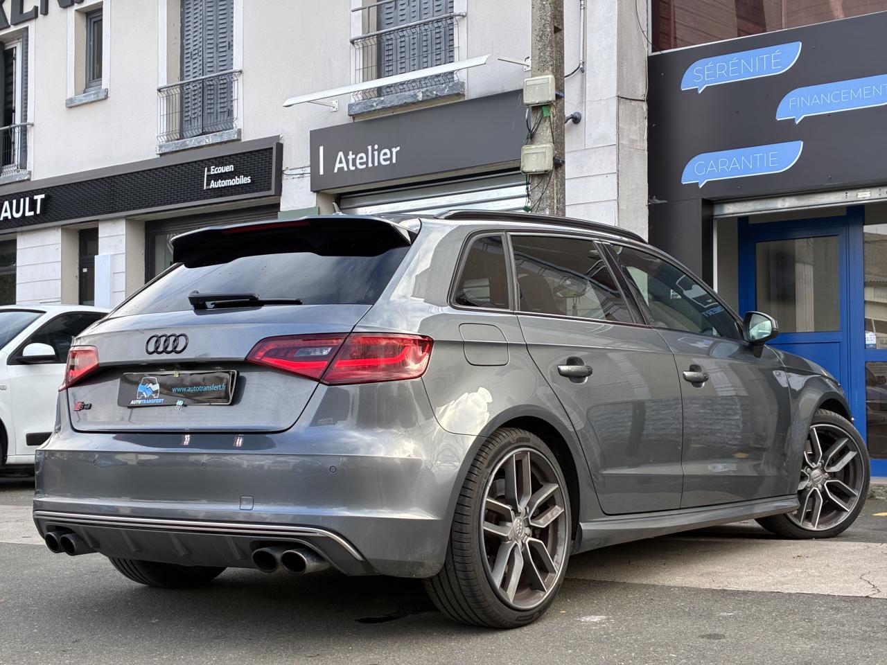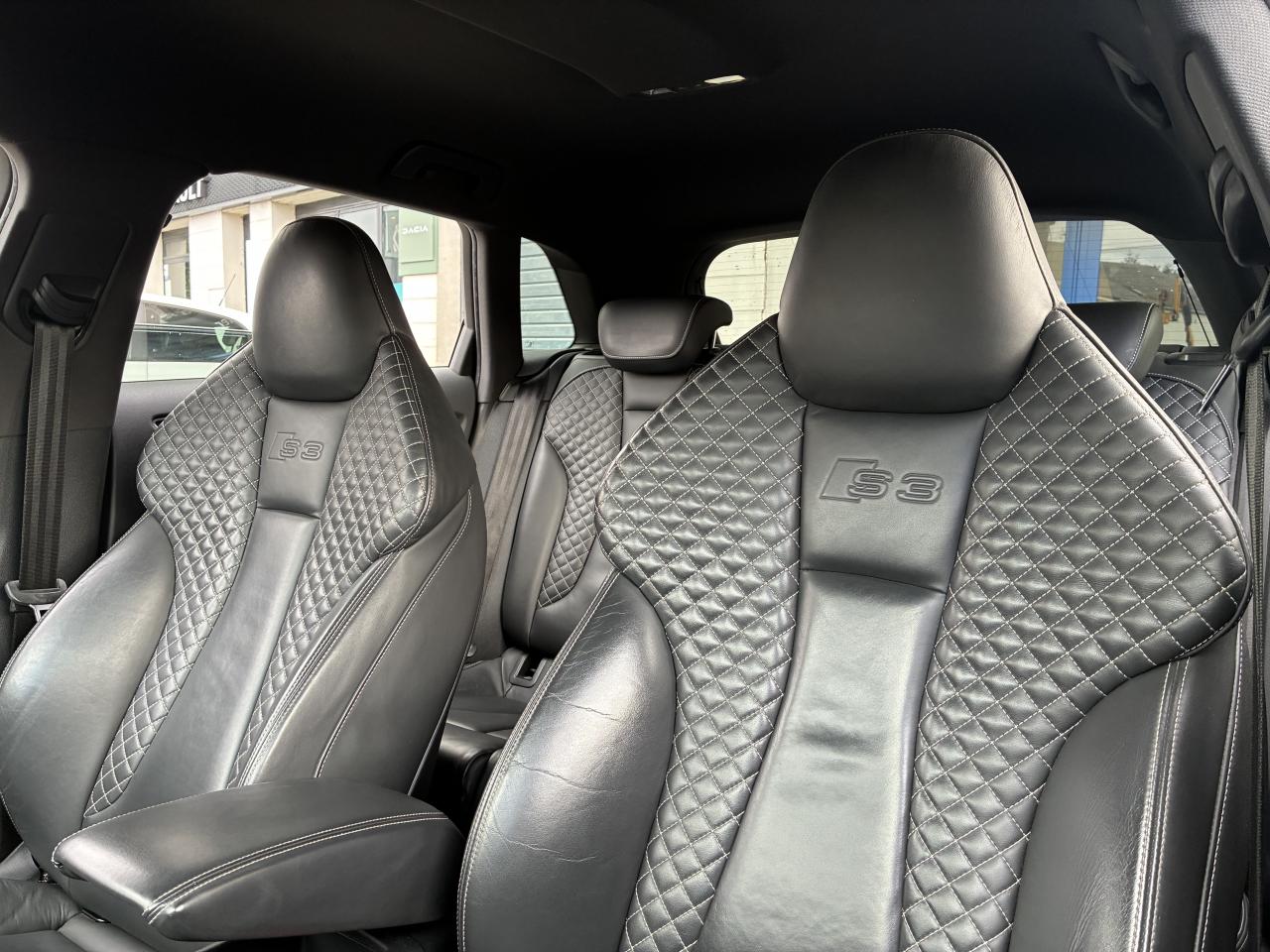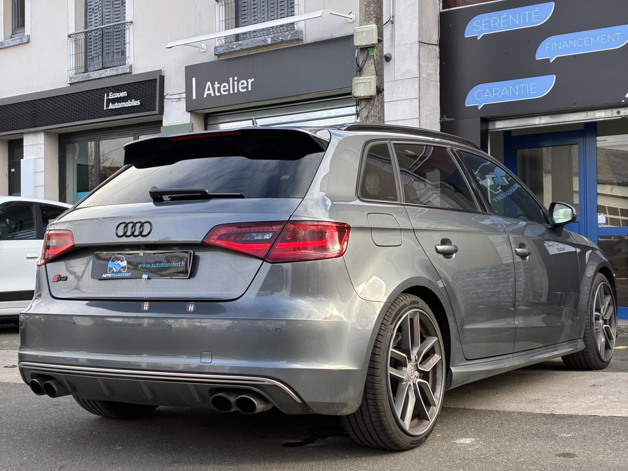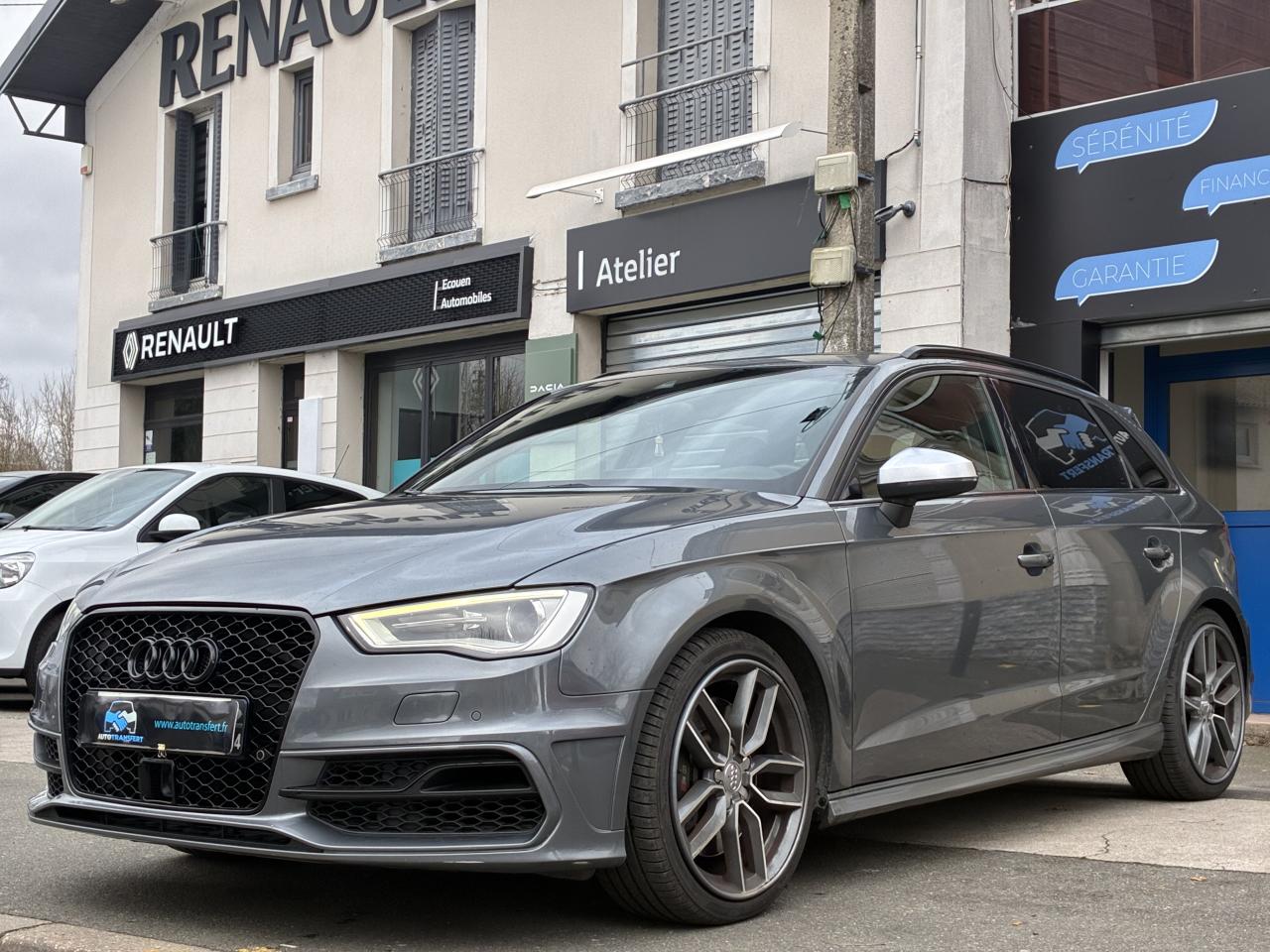 Accoudoir central avant coulissant en longueur, avec vide-poches relevable et inclinaison réglableAirbag genoux conducteurAirbags grand volume pour le conducteur et le passagerAirbags latéraux à l'avant intégrés au dossier des siègesAlarme antivol : avec protection anti-remorquage par capteur d'angle d'inclinaisonAllume-cigare et cendrier amovible, couvercle chromé avec anneaux Audi, allume-cigare sur la console centrale au lieu de la prise 12 volts de sérieAntipatinage (ASR) : empêche le patinage des roues motrices en réduisant la puissance du moteur, assure davantage de stabilité et une meilleure tractionApplications décoratives sur les contre-portes et tableau de bord "Aluminium brossé mat"Audi Drive Select, permet différents réglagesAudi parking system à l'arrière facilitant le stationnement dans les limites du système à l'aide d'un signal sonoreAudi Premium Tracking SystemAudi Sound System avec 10 haut-parleursBecquet de pavillon S3, laqué dans la couleur de la carrosserie, avec inserts aérodynamiques latéraux noir brillantBlocage électronique de différentiel (EDS) : freine automatiquement les roues motrices sur route glissante et inégalement adhérente, assurant ainsi une excellente motricitéBoîte à gants grand volume côté passager avant, éclairéeCache-bagages amovibleCalandre Audi singleframe gris platine avec entretoises horizontales chromées, avec anneaux Audi chromés au centreCarrosserie galvanisée (entièrement galvanisée aux endroits sensibles à la corrosion)Ceintures de sécurité 3 points automatiques pour toutes les placesChâssis Sport S surbaissé de 25 mm, avec suspension et amortisseurs plus fermesCiel de pavillon en tissu noirClé avec emblème S3Climatisation automatique Confort avec réglage asservi à la position du soleilContrôle de ceinture attachée pour toutes les placesContrôle de pression des pneus ( TPMS )Contrôle électronique de stabilisation (ESC) désactivable, avec amplificateur hydraulique de freinage d'urgenceDétecteur de pluie et allumage automatique des projecteursDirection progressive contribuant à une augmentation de la dynamique de conduiteDossier de banquette arrière rabattable en deux parties 40/60 ou complètementFeux arrière avec feux de recul blancs et feux de brouillard arrière, incluant troisième feu stop surélevé et éclairage de plaque à LEDFeux de freinage adaptatifsInscriptions S3 sur la calandre, le capot de coffre, les baguettes des seuils de portes, les étriers de freins avant, le volant Sport, le pommeau de levier de vitesses et le compte-toursLave-essuie-glace 2 vitesses, 4 intervalles de balayage réglablesLève-vitres à l'avant et à l'arrièreLunette arrière dégivrante, avec minuterie; chauffage supplémentaire de l'extrémité inférieure de l'essuie-glace arrièreMiroir de courtoisie côté conducteur et passagerMMI GPS plus avec données de navigationPack aluminium intérieurPack EclairagePare-brise acoustique, améliore l'isolation phonique du pare-brise et réduit les bruits extérieursPare-chocs dans la couleur de la carrosseriePare-chocs laqués dans la couleur de carrosserie avec prises d'air latérales accentuées, extension de bas de caisse ainsi que diffuseur S à l'arrière au design résolument sportifPare-soleil rabattables et pivotants, côtés conducteur et passager avant, avec miroir de courtoisie occultablePédalier en acier inoxydable brosséPoignées de maintien. 4 poignées avec mécanisme amortisseur, rabattables, encastrées dans le pavillonPréparation pour téléphone portable (Bluetooth), commande sur volant multifonction, mains libres et audiostreamingPrise de courant 12 volts sur la console centrale à l'avantProtection antidémarrage électronique, intégrée à la gestion du moteur, activation automatique par la clé du véhiculeProtection latérale anticollision avec barres extrêmement rigides dans les portières et une structure latérale de carrosserie renforcéeRangements dans les contre-portes à l'avant avec casier de rangement pour boissons, rangements dans les contre-portes arrièreRecommandation de repos qui analyse le comportement routier au moyen de différents capteursRégulateur de vitesse avec maintien constant de la vitesse souhaitée à partir d'environ 30 km/hRétroviseur intérieur électrochromeRétroviseurs extérieurs avec clignotants à LED intégrés réglables électriquement et dégivrantsRétroviseurs extérieurs style aluminium avec rappels de clignotant à diodes, asphérique côté conducteur, convexe côté passager avant, dégivrants et escamotables électriquementSièges conducteur et passager avant réglables en hauteurSièges Sport à l'avant avec estampillage SSignal sonore pour oubli d'extinction des feuxSorties d'échappement chromées, visibles et doubles, 2 sorties ovales chromées à gauche et à droiteSystème d'information du conducteur (écran couleur)Système d'information du conducteur avec écran couleur haute résolution de 3,5 poucesSystème de freinage avec antiblocage (ABS) et répartiteur électronique de freinage (EBV) ; amplificateur hydraulique de freinage d'urgence à 2 rapports (Dual Rate)Système de ventilation et chauffage 4 diffuseurs d'air rondsTémoins de contrôle pour, entre autres Airbag, ABS, ESC/ASR, frein de stationnement serré, électronique EDS, phares, clignotants, circuit de freinage, pression d'huile moteur, fermeture du coffre, système électrique du moteurTransmission intégrale permanente avec répartition asymétrique et dynamique de coupleVerrouillage centralisé avec télécommande à fréquence radio intégrée à la clé du véhicule et code modifiableVolant réglable en hauteur et en profondeurVolant Sport 3 branches multifonction en cuir badgé S3 avec méplat et surpiqûres décoratives de couleur contrastéeXénon plus : réglage automatique du site des phares, lave-phares, feux de jour, feux arrière et feux d'éclairage de la plaque d'immatriculation arrière