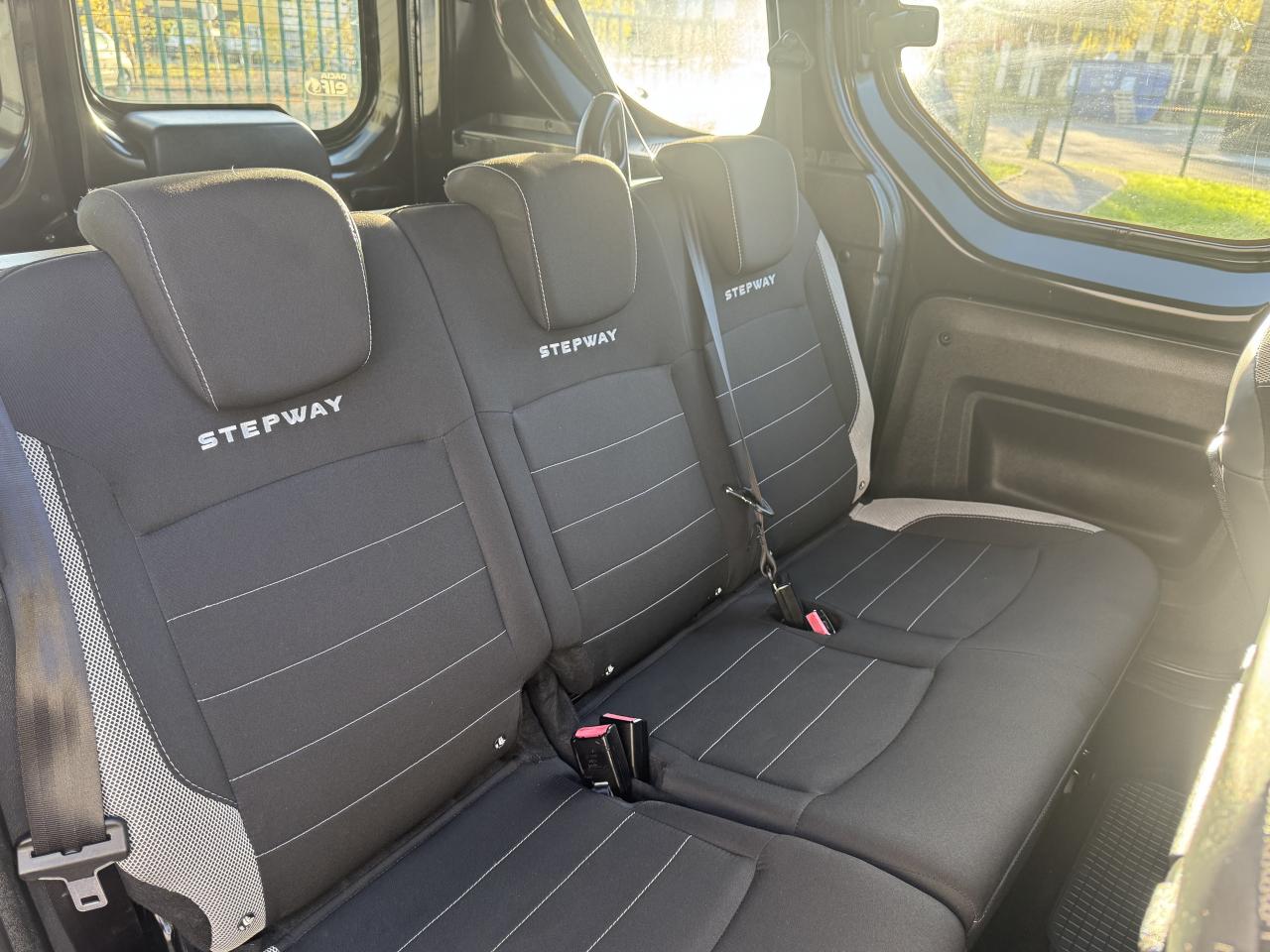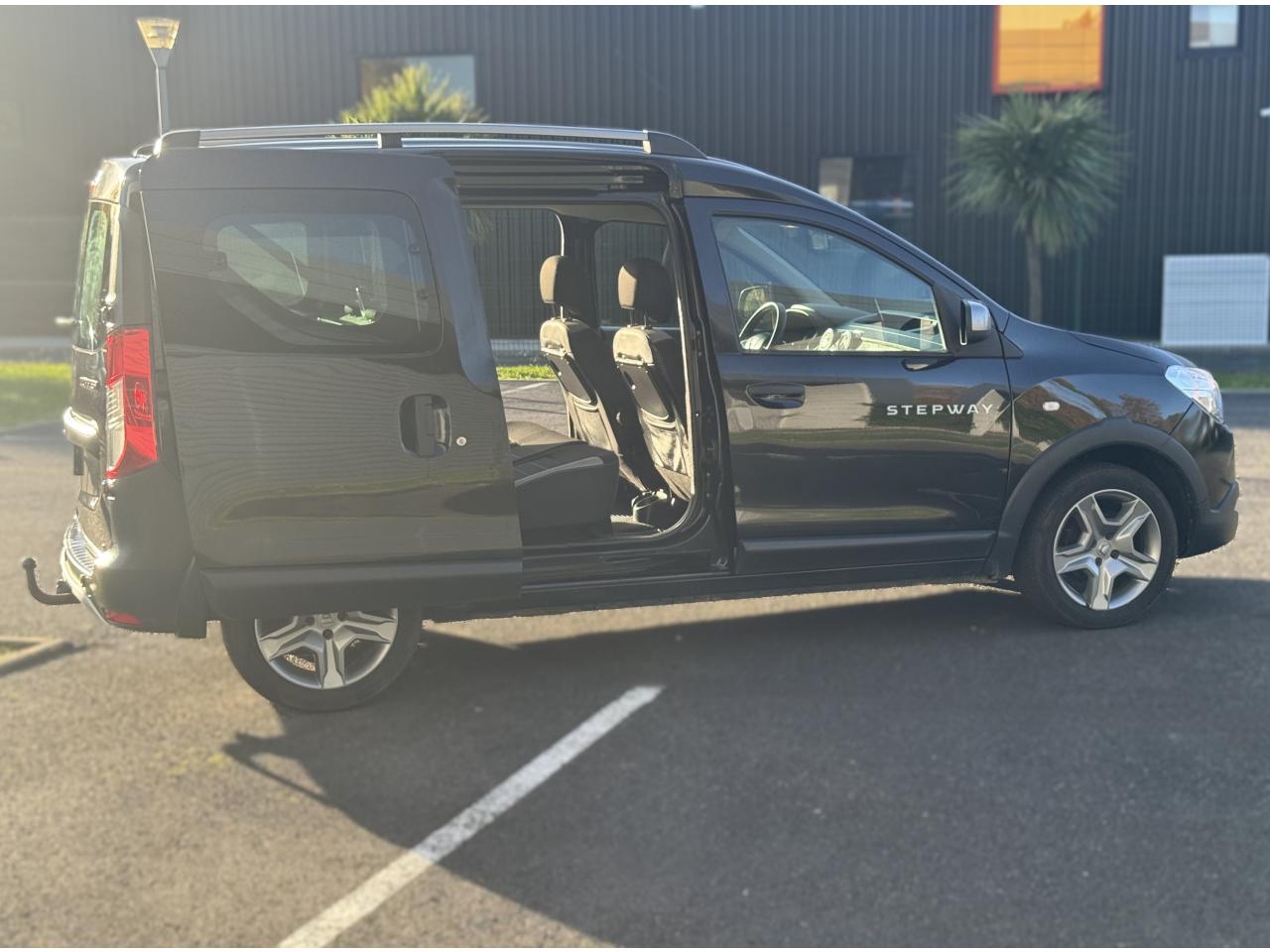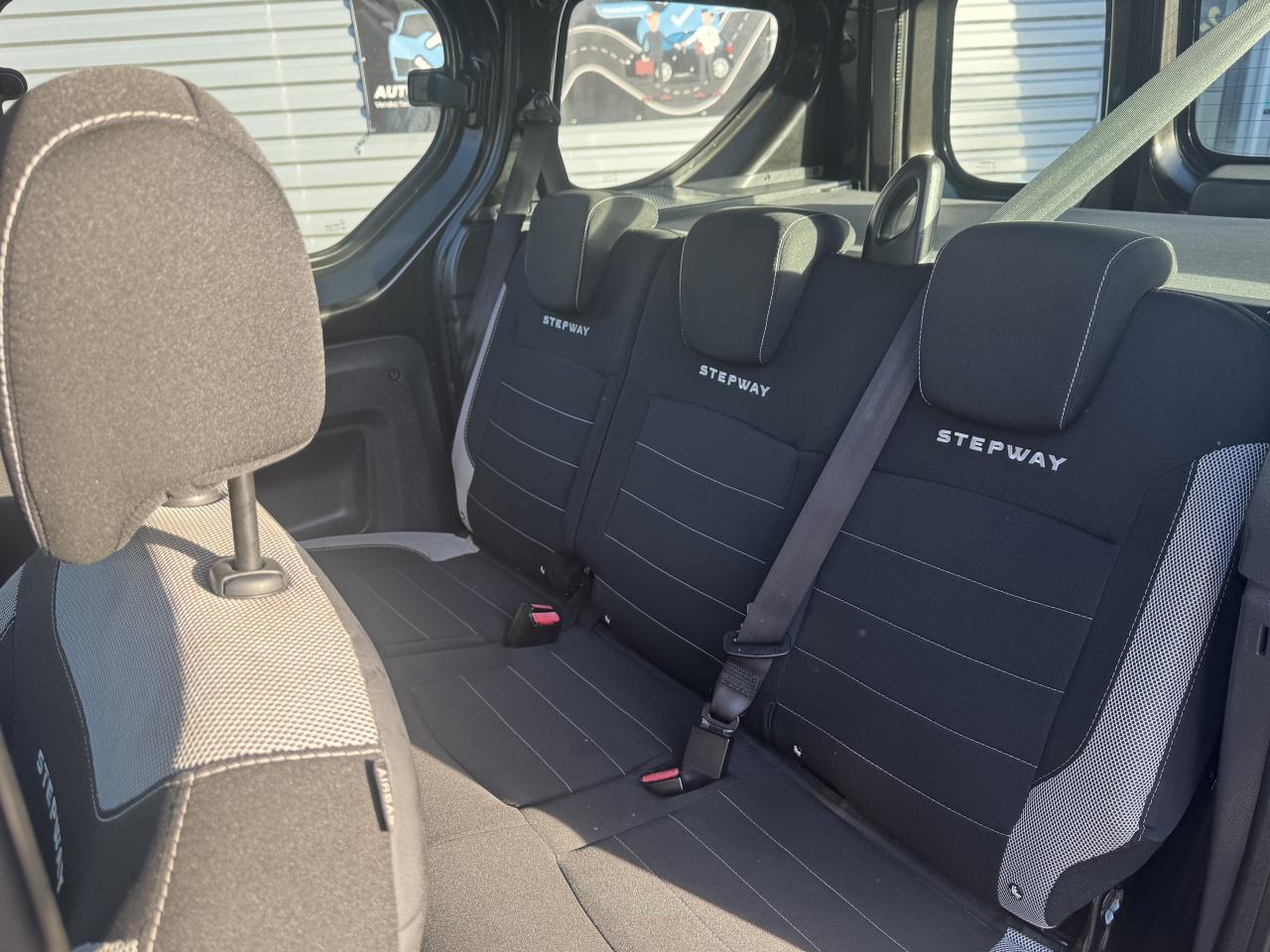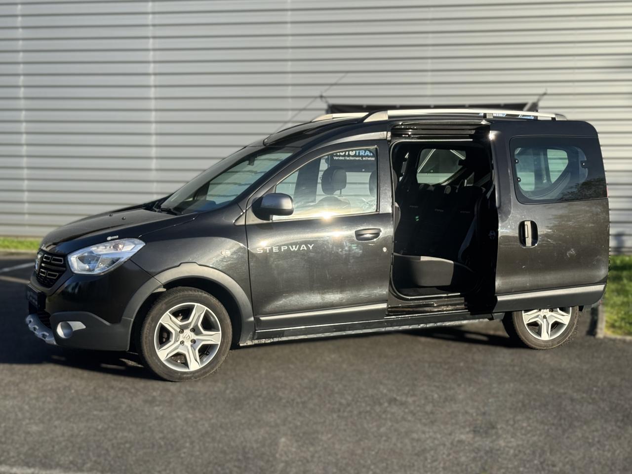 Attelage à rotule monoblocABS avec aide au freinage d'urgenceAccoudoir conducteurAide au démarrage en côteAntidémarrage codéBanquette de 2e rangée 1/3-2/3 dossier rabattable, mise en portefeuilleBarres de toit couleur Dark MetalBoîte à gants ferméeCapucineChauffage avec recyclage d'air et conduits d'air aux places arrièreClimatisation manuelleCondamnation centralisée des portes à distanceDirection assistéeMedia Nav Evolution (écran 7” tactile avec navigation, radio, prises jack et USB, téléphonie Bluetooth® avec commandes au volant, info-trafic TMC)Ordinateur de bordPack ConfortPorte latérale droite coulissante vitréePortes battantes arrière vitréesPrise 12 V à l'arrièrePrise 12V à l'avantProjecteurs antibrouillardRadar de reculRégulateur et limiteur de vitesseSellerie Stepway avec surjet et broderie "Stepway"Système de contrôle de trajectoire (ESC) avec fonction antipatinage (ASR)Système de détection de la pression des pneusSystème de fixation ISOFIX 3 points pour siège enfant aux places latérales arrièreTablettes aviation au dos des sièges avantVolant Dacia 4 branches Soft Feel