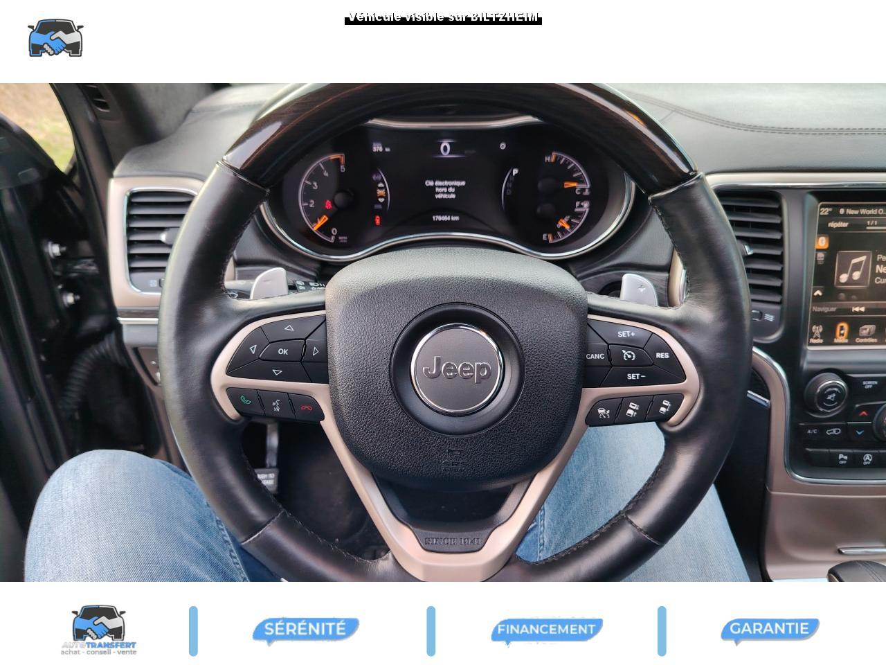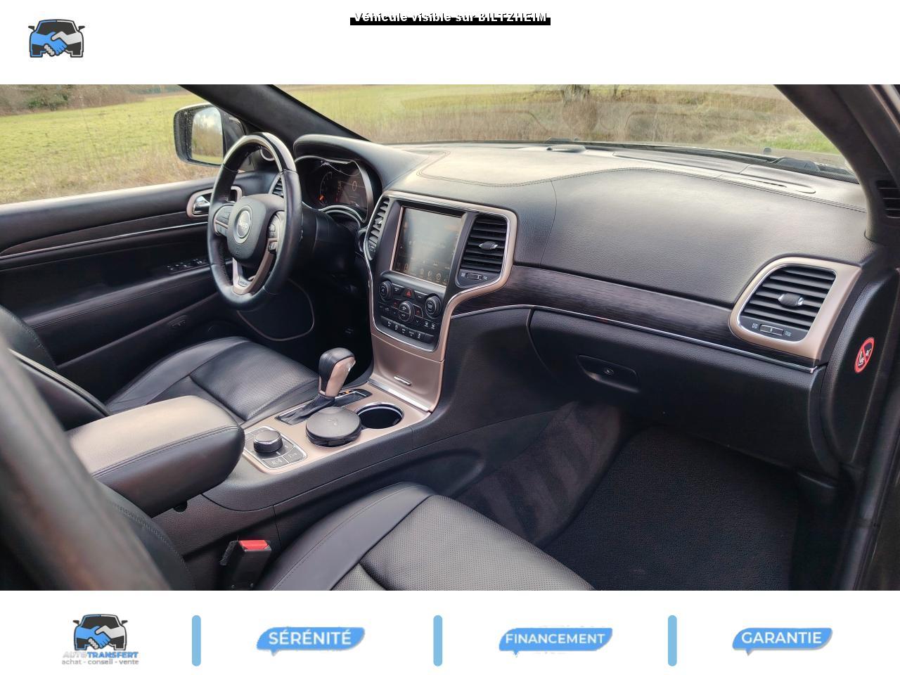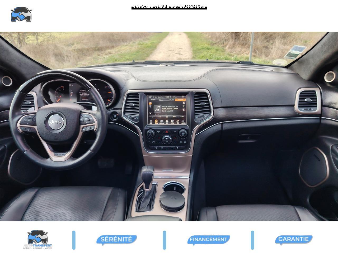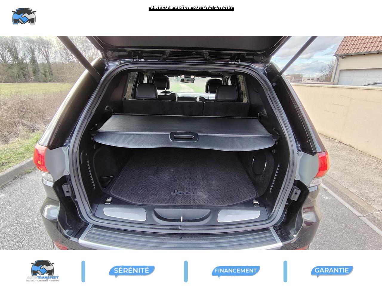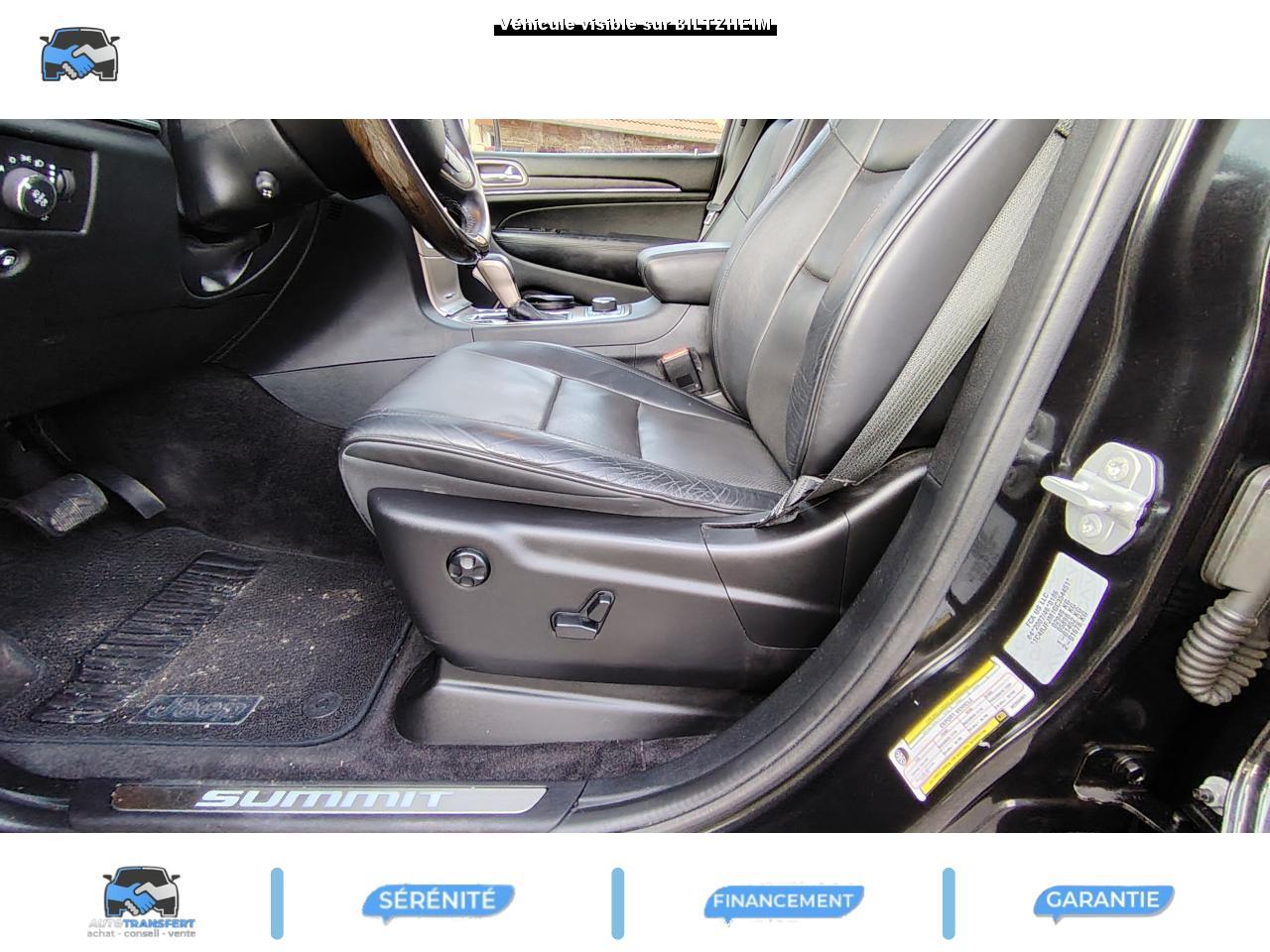 ABS - Système antiblocage des roues avec gestion différenciée en fonction de la nature du solAccoudoir central avant, coulissant avec bac de rangementAffichage de la pression des pneusAide aux secouristes - Coupure de l'arrivée de carburant ; déverrouillage automatique des portes pour faciliter l'accès des secouristes ; éclairage de l'habitacle pour voir les occupants de l'extérieurAirbag genoux conducteurAirbags frontaux (conducteur et passager) nouvelle génération à déploiement variableAirbags latéraux additionnels (dans les sièges conducteur et passager)Airbags latéraux de type rideau avant et arrièreAlarme périmétrique de contrôle des ouverturesAlarme volumétriqueAllumage automatique des projecteursAntenne de toit « aileron de requin »Appuie-tête actifs à l'avantBaguette de seuil de chargement chroméeBanquette arrière fractionnée 60/40 rabattable à plat et inclinable à 12°Barres de toit longitudinales chroméesBoîte de vitesse automatique à 8 rapports et levier de vitesse "E-Shift "Cache-bagages amovible à enrouleurCalandre Jeep couleur carrosserie avec croisillons chromésCeintures de sécurité arrière 3 pointsCeintures de sécurité avant réglables en hauteur avec prétensionneur et limiteur d'effortChrome line au niveau des bas de caisseCiel de toit et piliers avec capitonage luxueuxClignotants à impulsionClimatisation automatique bi-zoneCommandes de l'autoradio au volantConnexionsDesign Extérieur Summit : pare-chocs avant et arrière, bas de caisse peint couleur carrosserieDirection assistée à crémaillère avec pompe électrohydraulique (EHPS)Double sortie d'échappement rectangulaire "Summit"Eclairage extérieur de courtoisieEclairage intérieur à LEDEnter-N-Go : système d'ouverture et de démarrage sans cléESP - Système de régulation du comportement dynamiqueEssuie-glace à déclenchement automatiqueFeux antibrouillard arrièreFeux arrière à LEDFeux de jour à LEDFilet de coffreFiltre à air pour l'habitacleFiltre à particulesFreins à disques ventilés de 350 mm à l'avant et freins à disques de 330 mm à l'arrièreGarnissage en cuir sur le tableau de bord, les contreportes et l'accoudoir centralGrilles de haut-parleur en métalHayon arrière à ouverture et fermeture électriqueInserts décoratifs en bois de chêneJantes en alliage 20” design Summit (20”x8” et pneumatiques 265/50 R20)Mode EcoOrdinateur de bord : affichage digital sur écran 7 ” TCM (800 x 454)Palettes de changement de rapports au volantPare-chocs avant « Summit »Pare-soleil coulissants avec miroir de courtoisie illuminéPassages de roues élargisPoignées de porte chroméesPommeau de levier de vitesses gainé de CuirPorte-gobelets rétro-éclairésPrises auxiliaires 12 V (console centrale et accoudoir central)Projecteurs adaptatifsProjecteurs antibrouillardProjecteurs bi-xénon avec lave-phares intégrés et réglage automatique de niveauRéglage lombaires électrique (sièges conducteur et passager)Régulateur de vitesse auto-adaptif avec fonction embouteillage (disponibilité ultérieure)Rétroviseur intérieur photochromatique avec microphone intégréRétroviseurs extérieurs à réglages électrique et dégivrantsRétroviseurs extérieurs photochromatique rabattables électriquement avec fonction mémorisationRoue de secours taille réelleSellerie en cuir Natura Plus perforéSeuils de porte rétro-éclairésSiège central arrière équipé d'une ceinture de sécurité 3 pointsSièges arrières chauffantsSièges avant chauffantsSièges avant électriques avec réglages 8 points conducteur et passagerSièges avant ventilésSpoiler arrière couleur carrosserieSuspension arrière autonivelanteSuspension sport (-17 mm)Suspensions pneumatiques Quadra-LiftSystème anti-démarrage Sentry KeySystème antipatinage 4 roues par action sur les freinsSystème audio Harman Kardon High PerformanceSystème d'aide au démarrage en côteSystème d'aide au freinage d'urgence (prépositionnement des plaquettes de freins en anticipation)Système d'avertissement anticollision actifSystème de commutation automatique feux de route/feux de croisementSystème de contrôle de la descenteSystème de contrôle de la stabilité en condition de remorquageSystème de détection de présence arrièreSystème de fixations pour siège enfant IsofixSystème de gestion de la motricité Selec-TerrainSystème de guidage GPS avec cartographie Europe de l'Ouest (affichage des bâtiments en 3D, information trafic)Système de réduction actifs des bruitsSystème de séchage des freins et répartiteur électronique de freinageSystème de surveillance des angles mortsSystème de téléphonie mains-libres Uconnect avec reconnaissance vocaleSystème multimédia UConnectSystème ParkSense : aide au stationnement avec capteurs avant et arrièreSystème ParkView : Caméra de recul avec affichage sur l'écran multimédiaSystème préventif antiretournementTapis de coffre PremiumTapis de sol premium avec logo à l'avant et à l'arrièreToit ouvrant CommandView panoramiqueTransmission intégrale Quadra-Drive IITrappe de carburant « capless » (sans bouchon) à verrouillage électriqueVerrouillage centralisé à télécommandeVerrouillage des portes au-dessus de 30 km/hVitres arrières surteintéesVitres électriques, avec commande séquentielle à l'avantVolant chauffantVolant Jeep gainé de cuir avec insert en boisVolant réglable électriquement en hauteur et en profondeur