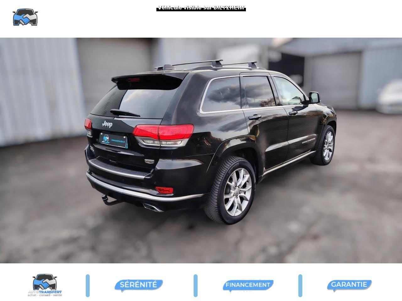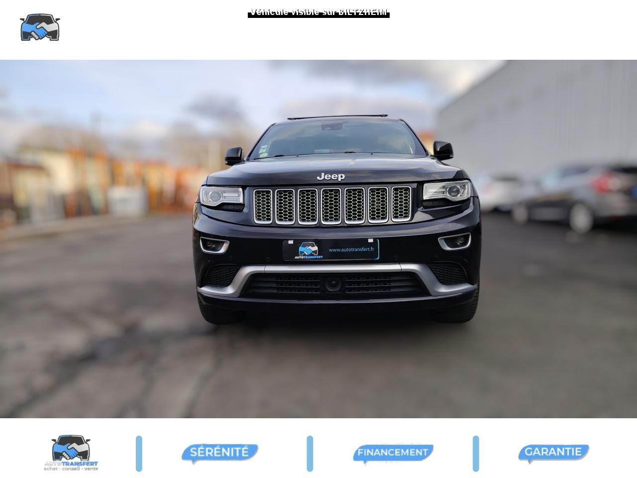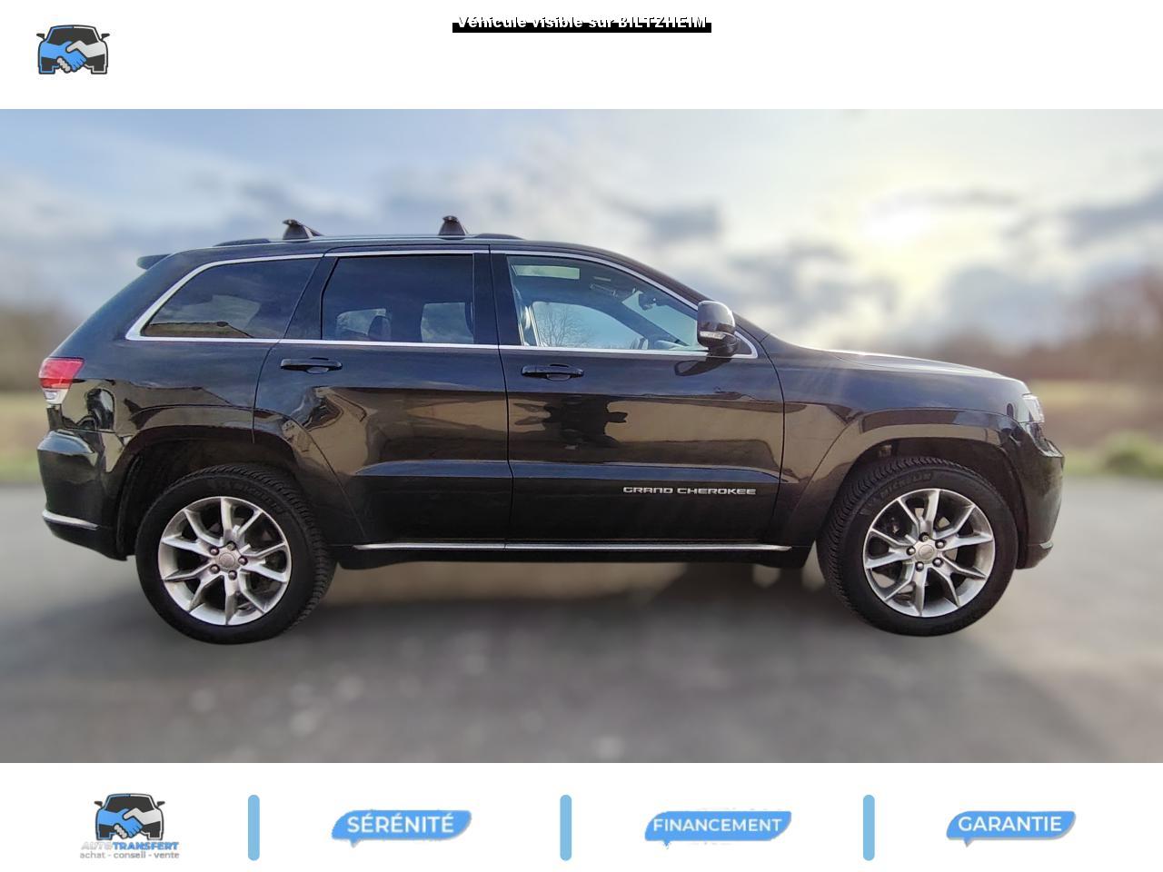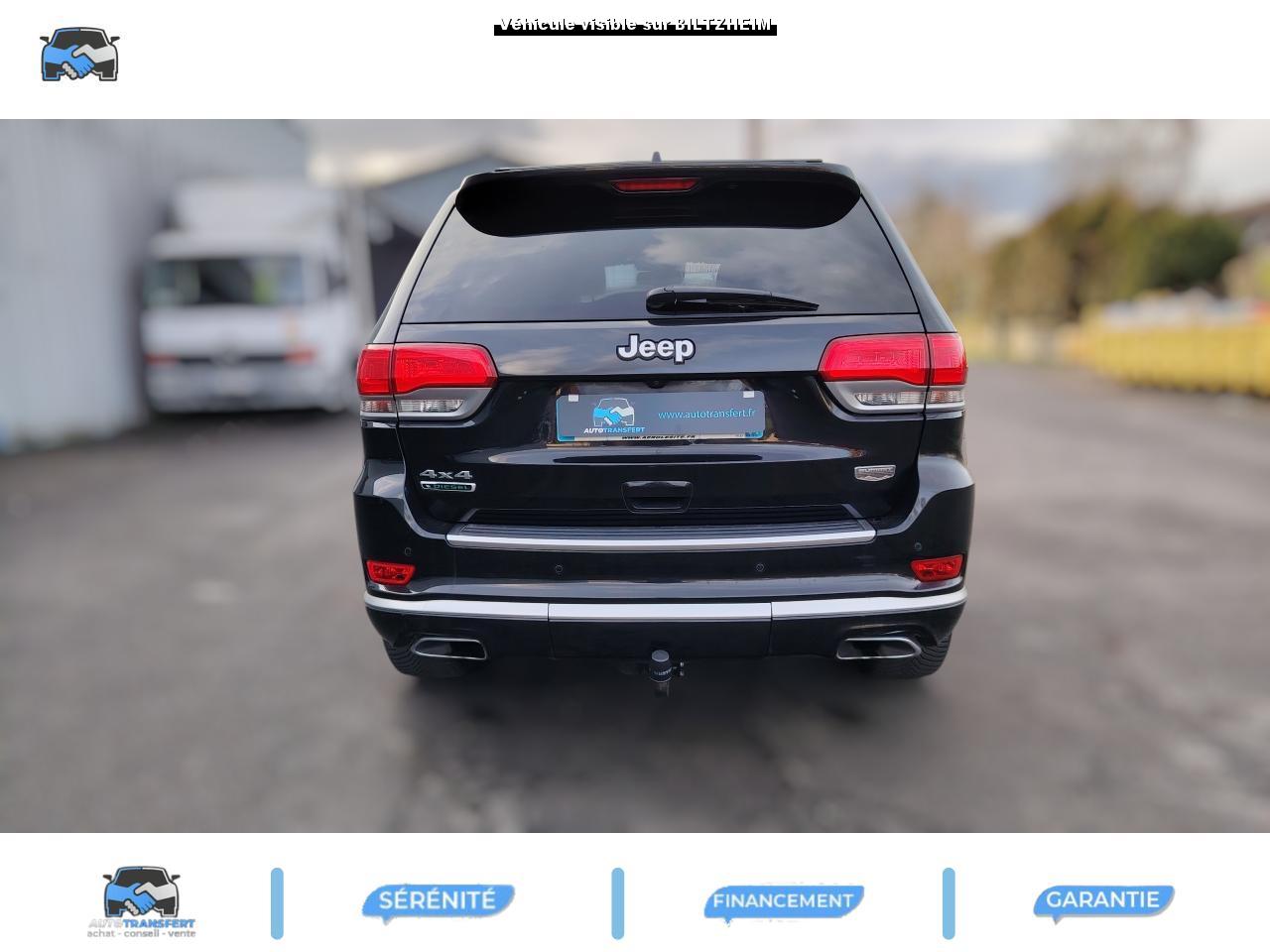 ABS - Système antiblocage des roues avec gestion différenciée en fonction de la nature du solAccoudoir central avant, coulissant avec bac de rangementAffichage de la pression des pneusAide aux secouristes - Coupure de l'arrivée de carburant ; déverrouillage automatique des portes pour faciliter l'accès des secouristes ; éclairage de l'habitacle pour voir les occupants de l'extérieurAirbag genoux conducteurAirbags frontaux (conducteur et passager) nouvelle génération à déploiement variableAirbags latéraux additionnels (dans les sièges conducteur et passager)Airbags latéraux de type rideau avant et arrièreAlarme périmétrique de contrôle des ouverturesAlarme volumétriqueAllumage automatique des projecteursAntenne de toit « aileron de requin »Appuie-tête actifs à l'avantBaguette de seuil de chargement chroméeBanquette arrière fractionnée 60/40 rabattable à plat et inclinable à 12°Barres de toit longitudinales chroméesBoîte de vitesse automatique à 8 rapports et levier de vitesse "E-Shift "Cache-bagages amovible à enrouleurCalandre Jeep couleur carrosserie avec croisillons chromésCeintures de sécurité arrière 3 pointsCeintures de sécurité avant réglables en hauteur avec prétensionneur et limiteur d'effortChrome line au niveau des bas de caisseCiel de toit et piliers avec capitonage luxueuxClignotants à impulsionClimatisation automatique bi-zoneCommandes de l'autoradio au volantConnexionsDesign Extérieur Summit : pare-chocs avant et arrière, bas de caisse peint couleur carrosserieDirection assistée à crémaillère avec pompe électrohydraulique (EHPS)Double sortie d'échappement rectangulaire "Summit"Eclairage extérieur de courtoisieEclairage intérieur à LEDEnter-N-Go : système d'ouverture et de démarrage sans cléESP - Système de régulation du comportement dynamiqueEssuie-glace à déclenchement automatiqueFeux antibrouillard arrièreFeux arrière à LEDFeux de jour à LEDFilet de coffreFiltre à air pour l'habitacleFiltre à particulesFreins à disques ventilés de 350 mm à l'avant et freins à disques de 330 mm à l'arrièreGarnissage en cuir sur le tableau de bord, les contreportes et l'accoudoir centralGrilles de haut-parleur en métalHayon arrière à ouverture et fermeture électriqueInserts décoratifs en bois de chêneJantes en alliage 20” design Summit (20”x8” et pneumatiques 265/50 R20)Mode EcoOrdinateur de bord : affichage digital sur écran 7 ” TCM (800 x 454)Palettes de changement de rapports au volantPare-chocs avant « Summit »Pare-soleil coulissants avec miroir de courtoisie illuminéPassages de roues élargisPoignées de porte chroméesPommeau de levier de vitesses gainé de CuirPorte-gobelets rétro-éclairésPrises auxiliaires 12 V (console centrale et accoudoir central)Projecteurs adaptatifsProjecteurs antibrouillardProjecteurs bi-xénon avec lave-phares intégrés et réglage automatique de niveauRéglage lombaires électrique (sièges conducteur et passager)Régulateur de vitesse auto-adaptif avec fonction embouteillage (disponibilité ultérieure)Rétroviseur intérieur photochromatique avec microphone intégréRétroviseurs extérieurs à réglages électrique et dégivrantsRétroviseurs extérieurs photochromatique rabattables électriquement avec fonction mémorisationRoue de secours taille réelleSellerie en cuir Natura Plus perforéSeuils de porte rétro-éclairésSiège central arrière équipé d'une ceinture de sécurité 3 pointsSièges arrières chauffantsSièges avant chauffantsSièges avant électriques avec réglages 8 points conducteur et passagerSièges avant ventilésSpoiler arrière couleur carrosserieSuspension arrière autonivelanteSuspension sport (-17 mm)Suspensions pneumatiques Quadra-LiftSystème anti-démarrage Sentry KeySystème antipatinage 4 roues par action sur les freinsSystème audio Harman Kardon High PerformanceSystème d'aide au démarrage en côteSystème d'aide au freinage d'urgence (prépositionnement des plaquettes de freins en anticipation)Système d'avertissement anticollision actifSystème de commutation automatique feux de route/feux de croisementSystème de contrôle de la descenteSystème de contrôle de la stabilité en condition de remorquageSystème de détection de présence arrièreSystème de fixations pour siège enfant IsofixSystème de gestion de la motricité Selec-TerrainSystème de guidage GPS avec cartographie Europe de l'Ouest (affichage des bâtiments en 3D, information trafic)Système de réduction actifs des bruitsSystème de séchage des freins et répartiteur électronique de freinageSystème de surveillance des angles mortsSystème de téléphonie mains-libres Uconnect avec reconnaissance vocaleSystème multimédia UConnectSystème ParkSense : aide au stationnement avec capteurs avant et arrièreSystème ParkView : Caméra de recul avec affichage sur l'écran multimédiaSystème préventif antiretournementTapis de coffre PremiumTapis de sol premium avec logo à l'avant et à l'arrièreToit ouvrant CommandView panoramiqueTransmission intégrale Quadra-Drive IITrappe de carburant « capless » (sans bouchon) à verrouillage électriqueVerrouillage centralisé à télécommandeVerrouillage des portes au-dessus de 30 km/hVitres arrières surteintéesVitres électriques, avec commande séquentielle à l'avantVolant chauffantVolant Jeep gainé de cuir avec insert en boisVolant réglable électriquement en hauteur et en profondeur