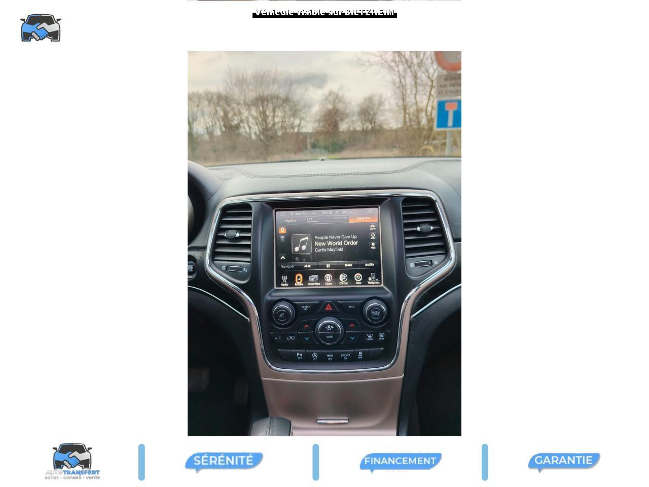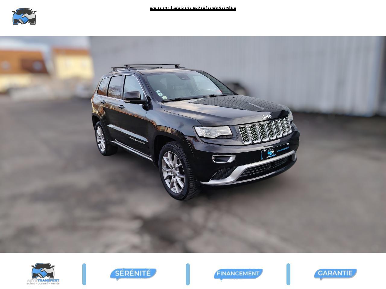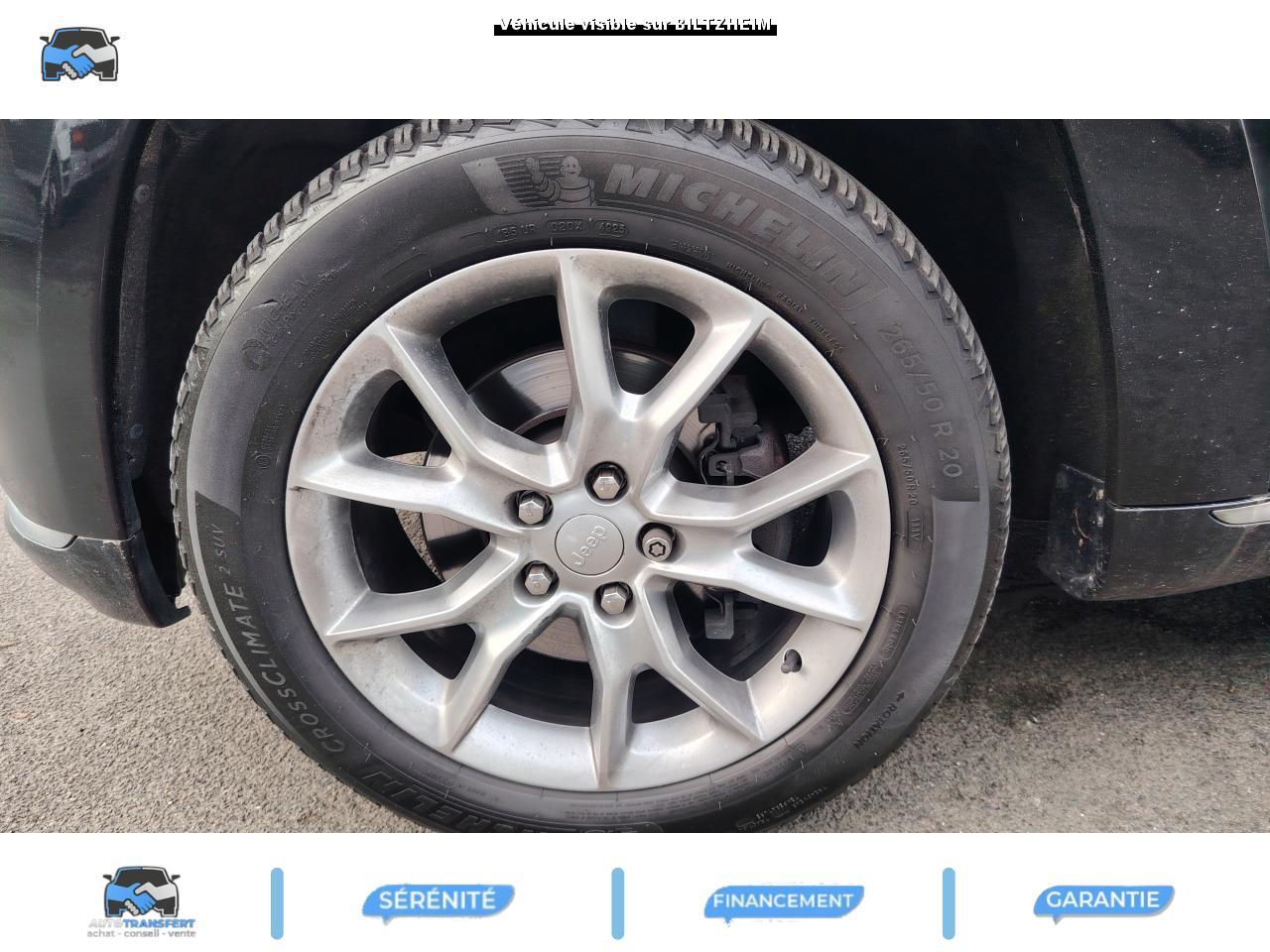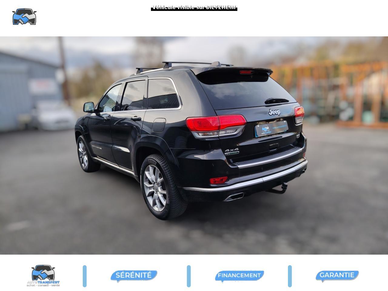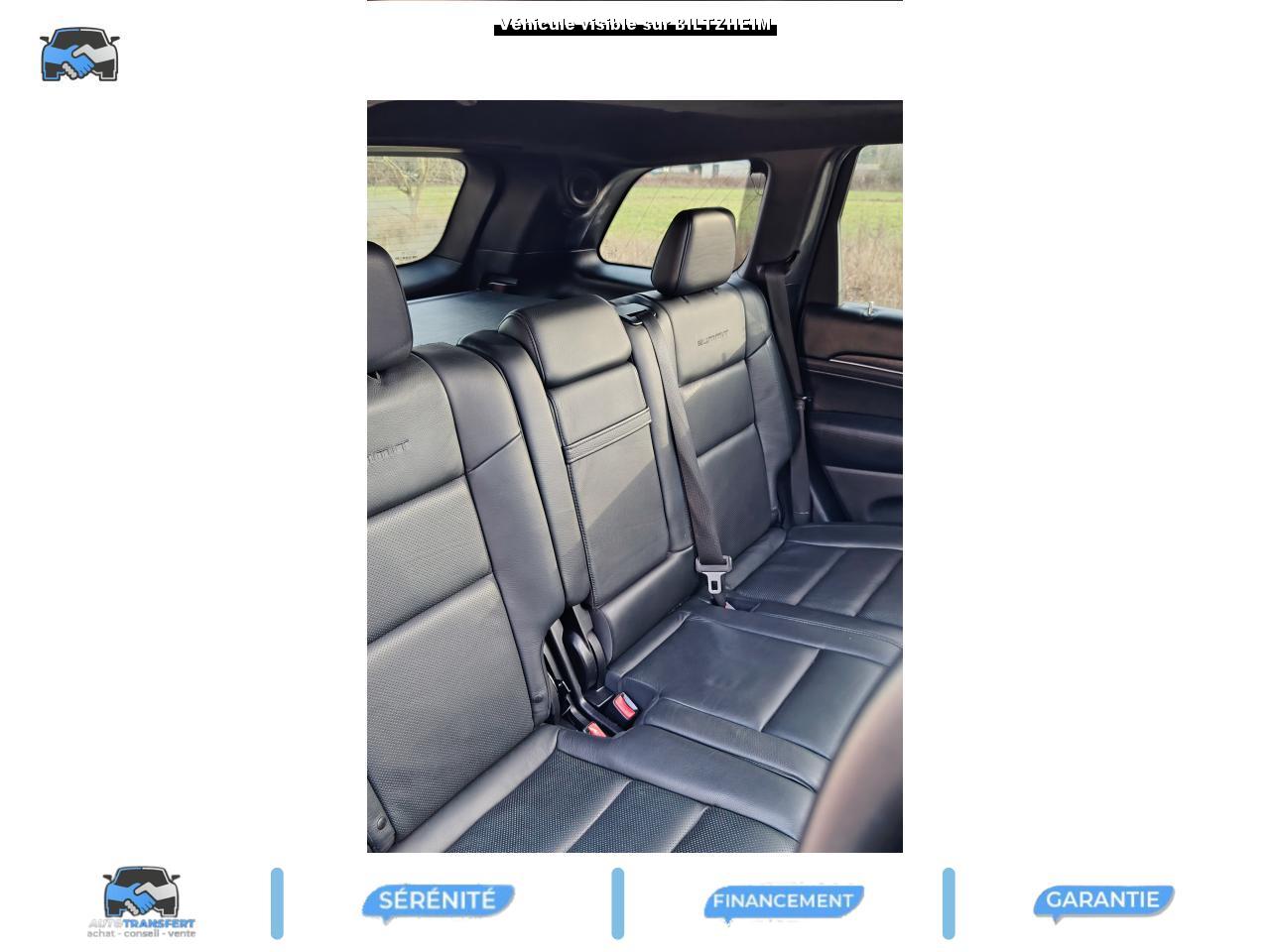 ABS - Système antiblocage des roues avec gestion différenciée en fonction de la nature du solAccoudoir central avant, coulissant avec bac de rangementAffichage de la pression des pneusAide aux secouristes - Coupure de l'arrivée de carburant ; déverrouillage automatique des portes pour faciliter l'accès des secouristes ; éclairage de l'habitacle pour voir les occupants de l'extérieurAirbag genoux conducteurAirbags frontaux (conducteur et passager) nouvelle génération à déploiement variableAirbags latéraux additionnels (dans les sièges conducteur et passager)Airbags latéraux de type rideau avant et arrièreAlarme périmétrique de contrôle des ouverturesAlarme volumétriqueAllumage automatique des projecteursAntenne de toit « aileron de requin »Appuie-tête actifs à l'avantBaguette de seuil de chargement chroméeBanquette arrière fractionnée 60/40 rabattable à plat et inclinable à 12°Barres de toit longitudinales chroméesBoîte de vitesse automatique à 8 rapports et levier de vitesse "E-Shift "Cache-bagages amovible à enrouleurCalandre Jeep couleur carrosserie avec croisillons chromésCeintures de sécurité arrière 3 pointsCeintures de sécurité avant réglables en hauteur avec prétensionneur et limiteur d'effortChrome line au niveau des bas de caisseCiel de toit et piliers avec capitonage luxueuxClignotants à impulsionClimatisation automatique bi-zoneCommandes de l'autoradio au volantConnexionsDesign Extérieur Summit : pare-chocs avant et arrière, bas de caisse peint couleur carrosserieDirection assistée à crémaillère avec pompe électrohydraulique (EHPS)Double sortie d'échappement rectangulaire "Summit"Eclairage extérieur de courtoisieEclairage intérieur à LEDEnter-N-Go : système d'ouverture et de démarrage sans cléESP - Système de régulation du comportement dynamiqueEssuie-glace à déclenchement automatiqueFeux antibrouillard arrièreFeux arrière à LEDFeux de jour à LEDFilet de coffreFiltre à air pour l'habitacleFiltre à particulesFreins à disques ventilés de 350 mm à l'avant et freins à disques de 330 mm à l'arrièreGarnissage en cuir sur le tableau de bord, les contreportes et l'accoudoir centralGrilles de haut-parleur en métalHayon arrière à ouverture et fermeture électriqueInserts décoratifs en bois de chêneJantes en alliage 20” design Summit (20”x8” et pneumatiques 265/50 R20)Mode EcoOrdinateur de bord : affichage digital sur écran 7 ” TCM (800 x 454)Palettes de changement de rapports au volantPare-chocs avant « Summit »Pare-soleil coulissants avec miroir de courtoisie illuminéPassages de roues élargisPoignées de porte chroméesPommeau de levier de vitesses gainé de CuirPorte-gobelets rétro-éclairésPrises auxiliaires 12 V (console centrale et accoudoir central)Projecteurs adaptatifsProjecteurs antibrouillardProjecteurs bi-xénon avec lave-phares intégrés et réglage automatique de niveauRéglage lombaires électrique (sièges conducteur et passager)Régulateur de vitesse auto-adaptif avec fonction embouteillage (disponibilité ultérieure)Rétroviseur intérieur photochromatique avec microphone intégréRétroviseurs extérieurs à réglages électrique et dégivrantsRétroviseurs extérieurs photochromatique rabattables électriquement avec fonction mémorisationRoue de secours taille réelleSellerie en cuir Natura Plus perforéSeuils de porte rétro-éclairésSiège central arrière équipé d'une ceinture de sécurité 3 pointsSièges arrières chauffantsSièges avant chauffantsSièges avant électriques avec réglages 8 points conducteur et passagerSièges avant ventilésSpoiler arrière couleur carrosserieSuspension arrière autonivelanteSuspension sport (-17 mm)Suspensions pneumatiques Quadra-LiftSystème anti-démarrage Sentry KeySystème antipatinage 4 roues par action sur les freinsSystème audio Harman Kardon High PerformanceSystème d'aide au démarrage en côteSystème d'aide au freinage d'urgence (prépositionnement des plaquettes de freins en anticipation)Système d'avertissement anticollision actifSystème de commutation automatique feux de route/feux de croisementSystème de contrôle de la descenteSystème de contrôle de la stabilité en condition de remorquageSystème de détection de présence arrièreSystème de fixations pour siège enfant IsofixSystème de gestion de la motricité Selec-TerrainSystème de guidage GPS avec cartographie Europe de l'Ouest (affichage des bâtiments en 3D, information trafic)Système de réduction actifs des bruitsSystème de séchage des freins et répartiteur électronique de freinageSystème de surveillance des angles mortsSystème de téléphonie mains-libres Uconnect avec reconnaissance vocaleSystème multimédia UConnectSystème ParkSense : aide au stationnement avec capteurs avant et arrièreSystème ParkView : Caméra de recul avec affichage sur l'écran multimédiaSystème préventif antiretournementTapis de coffre PremiumTapis de sol premium avec logo à l'avant et à l'arrièreToit ouvrant CommandView panoramiqueTransmission intégrale Quadra-Drive IITrappe de carburant « capless » (sans bouchon) à verrouillage électriqueVerrouillage centralisé à télécommandeVerrouillage des portes au-dessus de 30 km/hVitres arrières surteintéesVitres électriques, avec commande séquentielle à l'avantVolant chauffantVolant Jeep gainé de cuir avec insert en boisVolant réglable électriquement en hauteur et en profondeur