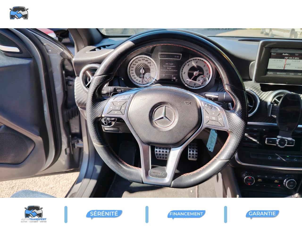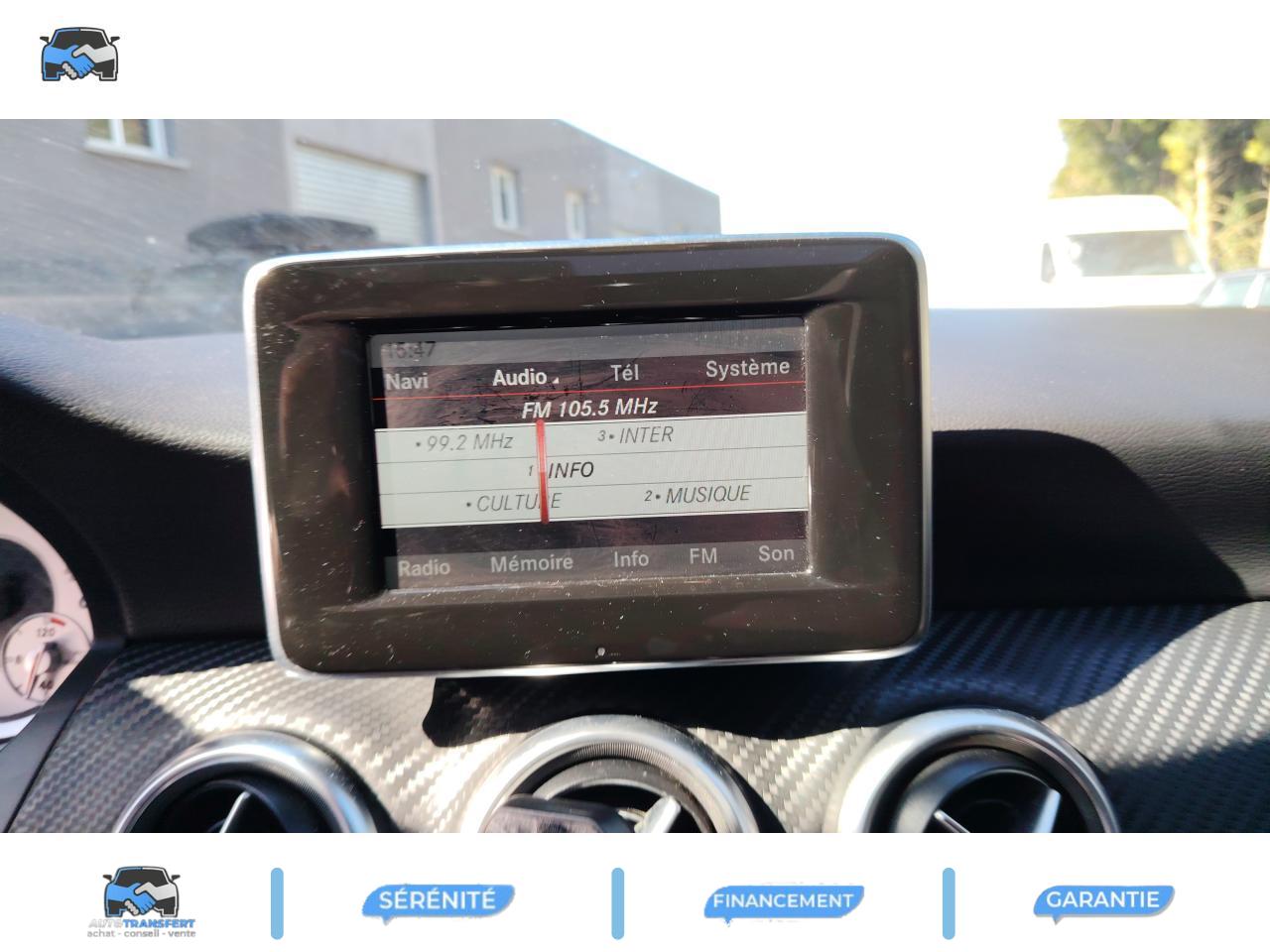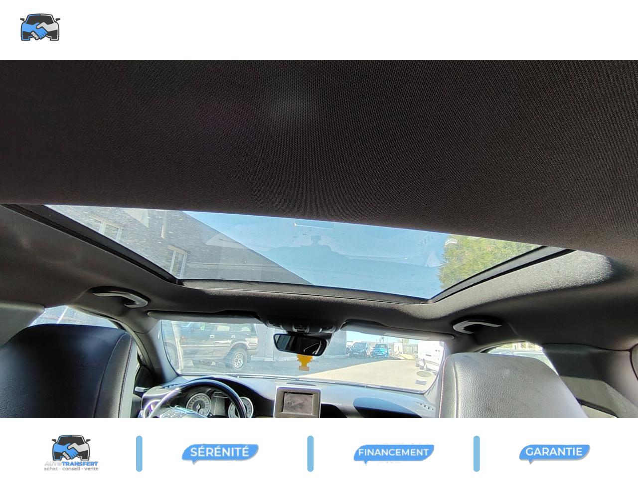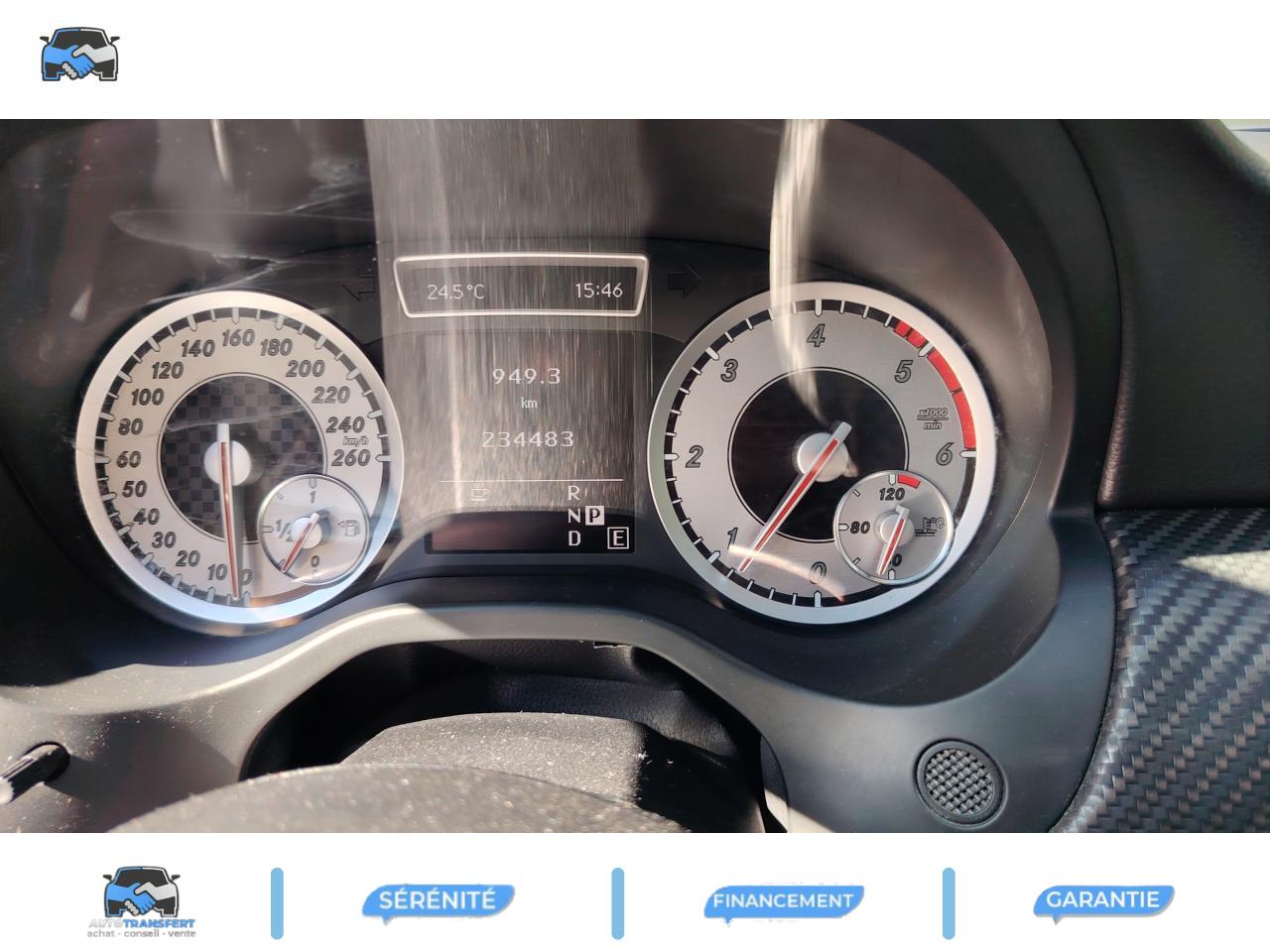 ABS (antiblocage de roues) et BAS (freinage d'urgence assisté)Accoudoir avant avec vide-pochesADAPTATIVE BRAKE avec fonction HOLD (aide au démarrage en côte)Airbag genoux conducteurAirbags bassin intégrés aux sièges conducteur et passager avantAirbags frontaux à plusieurs seuils de déclenchement pour le conducteur et le passager avantAirbags latéraux et airbags rideauxAllumage automatique des projecteursAPA (Aide au Parking Active) : système d'aide au stationnement avec radars de proximité avant/arrière et fonction manoeuvres automatiquesAttention Assist : système de détection de somnolenceAvertisseur de perte de pression des pneusBaguette de ligne de ceinture chroméeBanquette arrière rabattable 1/3-2/3BAS (freinage d'urgence assisté)Boîte à gants éclairéeBoîte automatique à double embrayage 7 rapports 7G-DCT avec palettes de commandes au volantCaméra de recul avec lignes de guidageCeintures de sécurité à 3 points à toutes les placesClé design chroméeClignotant avec fonction confortClimatisation automatique confort THERMOTRONIC à 2 zones avec affichage digital et réglages séparés conducteur/passagerCOLLISION PREVENTION ASSIST : système d'avertissement des risques de collisionColonne de direction réglable mécaniquement en hauteur et en profondeurCombiné d'instruments sportConnexion Bluetooth pour téléphone portable et clavier numérique intégréDétecteur d'occupation du siège passager avantDirection paramétrique asservie à la vitesseEclairage de secours en cas d'accidentÉléments décoratifs intérieurs et buses d'aération chromésESP (régulation de comportement dynamique)Feux arrière de brouillardFeux de stop adaptatifsFiltre à particulesFonction d'arrêt/redémarrage "Stop/Start ECO" avec commutateur de désactivation manuelleFonction sécurité piéton avec capot actifFrein de parking électriqueIndicateur de température extérieureIndicateur dynamique de maintenance (ASSYST PLUS)Interface USB dans l'accoudoir central avantISOFIX : fixations des sièges-enfants arrière (places extérieures)Lève-vitres électrique (x4) à commande séquentielle et dispositif anti-pincementNavigation Becker MAP PILOT : navigation 3D par disque dur avec information trafic TMC et affichage des limitations de vitesseOrdinateur de bordPack AMG Line ExtérieurPack AMG Line IntérieurPack d'éclairage intérieurPack de conduite dynamiquePack Sport BlackPare-chocs couleur carrosseriePneus avec possibilité de roulage à plat en liaison avec Jantes alliage AMGProjecteurs Bi-Xénon avec lave-phares, feux de jour,feux de position, clignotants, feux arrière et feux de stationnement à technologie LEDRadio Audio 20 avec écran couleur 15 cm (5,8"), double tuner et lecteur CD compatible MP3/WMA/AACRétroviseurs et poignées de portes de couleur carrosserieRétroviseurs extérieurs électriques chauffants et asphériques avec rappels de clignotant intégrésRétroviseurs extérieurs rabattables électriquement et rétroviseurs extérieur gauche et intérieur jour/nuit automatiqueSécurité enfant avec verrouillage manuel des portes arrière et électrique des vitres arrièreSiège conducteur réglable manuellement en hauteurSièges avant avec design spécifique et réglages manuel de l'inclinaison des assises et de la hauteur du siège passagerSièges Sport intégrauxTEMPOMAT (régulateur de vitesse) et SPEEDTRONIC (limiteur de vitesse)Toit ouvrant panoramique électrique avec store pare-soleil électrique, fonction de fermeture en cas de pluie et protection anti-pincementVerrouillage centralisé à télécommande avec fonction verrouillage automatique désactivableVitres teintées vertesVolant multifonctions à 12 touches