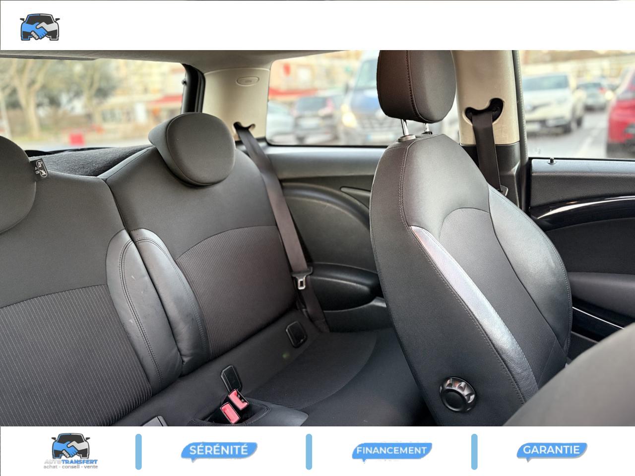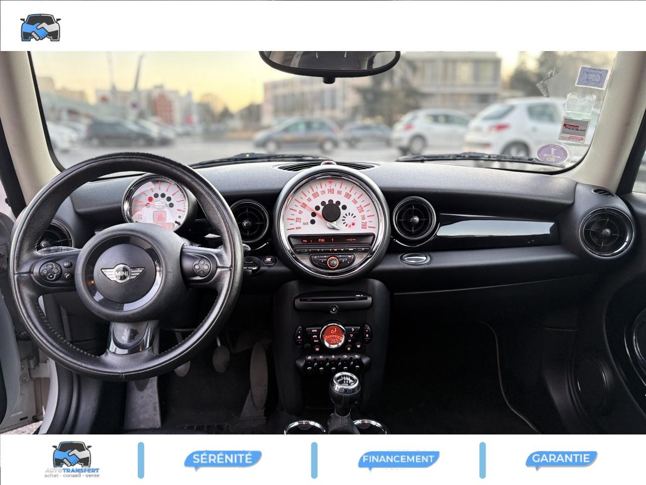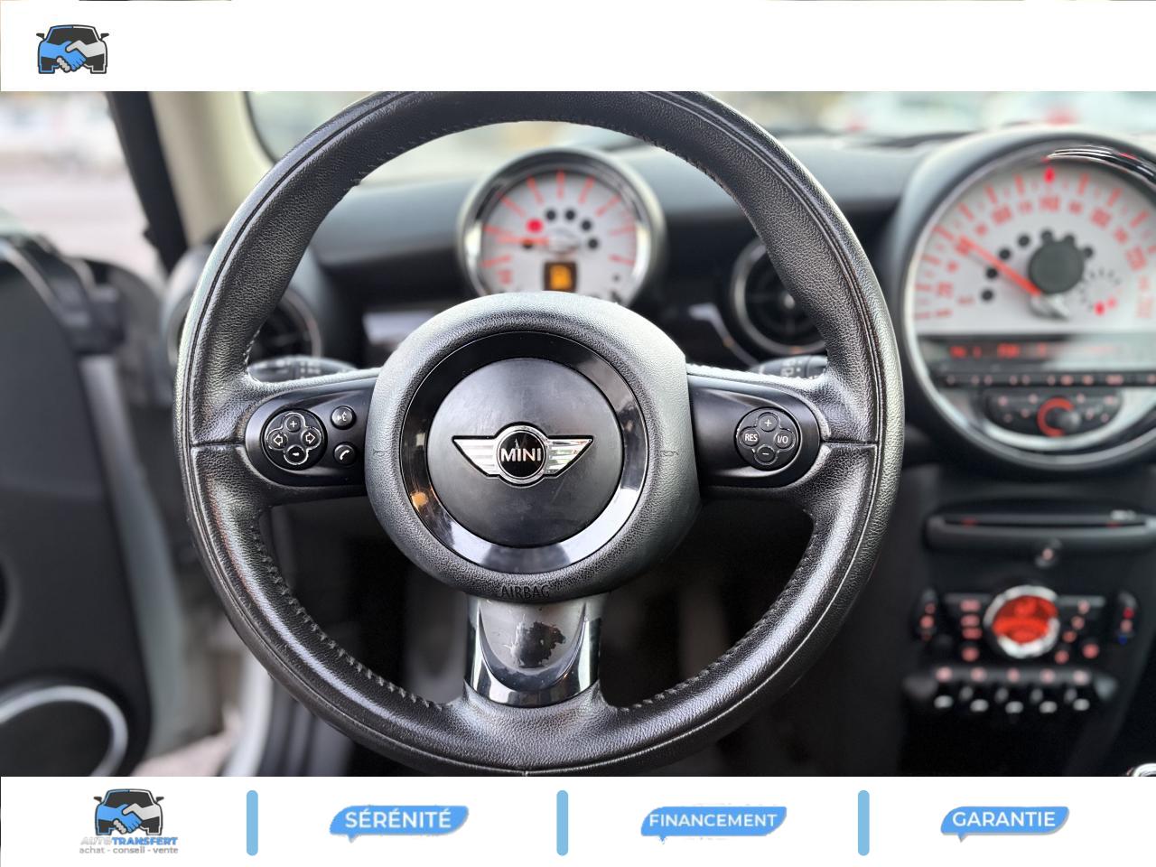 2 clés radiocommandées6 AirbagsABS (Antiblocage de roues)Anti-démarrage électronique EWS IVAutoradio MINI CD avec prise AUX-IN et 6 haut-parleurs et compatibilité MP3Boîte de vitesses manuelle 6 rapportsBouton de démarrage “Start/Stop”Calandre au contour chromé avec lamelles chroméesClimatisation manuelleContrôle de freinage en courbe CBCContrôle Dynamique de la Stabilité DSC, y compris assistant de démarrage en côteDirection à assistance électriqueDossiers de banquette arrière rabattables 50/50Ecrous antivolFeux arrière à technologie DELFeux de stop dynamiquesFixations ISOFIX aux places arrièreFonction d'arrêt et de redémarrage automatique du moteurIndicateur de changement de rapportIndicateur de perte de pression des pneumatiques (RPA)Inserts décoratifs "Fine White Silver"Jantes en alliage léger 15'' design "5-Star Spooler"Lève-vitres et rétroviseurs extérieurs électriquesMINI Mobility System et cricOrdinateur de bordOuïes latérales noires avec répétiteurs de clignotants orange intégrésPare-chocs avant et arrière dans la couleur de la carrosseriePoignée de hayon chroméePoignées de portes chroméesPorte-gobelets à l'avant (x2) et à l'arrièrePrise 12V entre les porte-gobelets avantProjecteurs avant et feux arrière au contour chroméSellerie tissu "Cosmos"Siège conducteur réglable en hauteurSortie d'échappement simple, droite et chroméeSystème d'accès aux places arrière Easy-EntrySystème de récupération de l'énergie au freinageToit et coques de rétroviseurs de couleur blanche ou noireTriangle de présignalisation avec kit de premiers secoursVerrouillage centralisé des portes, du coffre et de la trappe à essenceVitres teintéesVolant gainé cuir 2 branches
