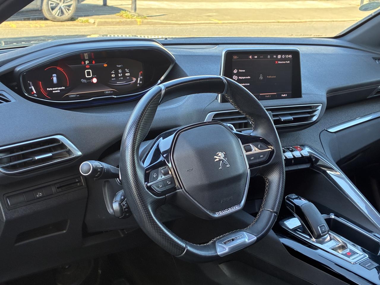 ABS avec répartiteur électronique de freinage (REF) et aide au freinage d'urgence (AFU)Accès et démarrage mains-libresAide graphique et sonore au stationnement arrièreAir conditionné automatique bi-zone avec aérateurs aux places arrièreAirbags frontaux conducteur et passager adaptatifs (airbag passager déconnectable)Airbags latéraux conducteur et passager avantAirbags rideaux de tête aux places avant et arrièreAppuis-tête à sécurité optimisée réglables en hauteur sur les sièges conducteur et passager avant ainsi que sur les places latérales arrièresAvertisseur de temps de conduiteBandeau de pare-choc arrière chroméBanquette rabattable 1/3 - 2/3 (modularité 'Magic Flat' et commandes dans le coffre) avec accoudoir et trappe à skisBarres de toit longitudinales profilées en aluminiumBoîte à gants floquée et éclairéeCalandre GT avec design évolutif chroméCanules d'échappement de style chroméesCommande de verrouillage à distance (deux plips)Commandes de lève-vitres avec inserts chromésContrôle dynamique de stabilité CDS avec antipatinage électronique ASRCoques de rétroviseurs extérieurs Noir Perla NeraDétection de sous-gonflage indirecteDirection assistée électrique, avec colonne de direction réglable en hauteur et profondeur (mécanique)Drive Mode : Choix de 2 modes de conduite (Eco ou Sport)Driver Sport PackEclairage intérieur à LED : plafonniers et rangementsEssuie-glace arrière avec déclenchement automatique en marche arrièreFixations pour trois sièges enfants suivant norme ISOFIX aux places passager avant et latérales arrièreFonction 'Mirror Screen' (Apple Carplay / Android Auto)Frein de stationnement électrique avec aide au démarrage en penteHabitacle et ciel de pavillon Noir MistralHayon mains libres : volet de coffre motorisé avec accès mains libresIndicateur de rapport engagéJoncs de vitres latérales en inoxLève-vitres électriques avant et arrière, séquentiels et antipincementLunette arrière chauffante avec antennes sérigraphiéesMiroirs de courtoisie éclairésNavigation 3D connectée avec reconnaissance vocale, écran tactile capacitif 10" HDPack City 1Pack Eclairage d'ambiancePack VisibilitéPassages de roues rapportés noirsPédalier et repose-pied conducteur en aluminiumPeugeot i-Cockpit : combiné tête haute numérique haute qualité d'affichage, écran tactile capacitif 10" HD et volant compact multi-fonctionsPlafonnier avec spots de lecture avant (x2) et arrière (x2)Planche de bord surpiquéePrise USB (dans la zone connectique)Projecteurs 'Peugeot Full LED Technology' avec correction automatique de site, fonction Eclairage Virage Statique,'Foggy Mode' et feux diurnes à LED prolongés dans les projecteursRadio avec fonction DAB (Radio Numérique Terrestre), bi-tuner compatible MP3 et connectivité Bluetooth (audio streaming, kit mains libres), avec commandes au volant, 6 HP, écran tactile capacitif 10" HDRétroviseur intérieur à position nuit automatique, sans encadrementRétroviseurs extérieurs électriques et dégivrants, rabattables électriquement avec éclairage d'accueil à LEDSécurité enfant électrique des vitres arrièreSellerie TEP & Alcantara MistralSeuils de portes avant en inoxToggle Switches' chromés (touches 'piano' d'activation des fonctions de l'écran tactile)Toit 'Black Diamond' (toit Noir Perla Nera)Verrouillage automatique de tous les ouvrants en roulantVitres latérales et lunette arrière surteintéesVolant cuir fleur perforé avec bagues chrome acier et badge GT
