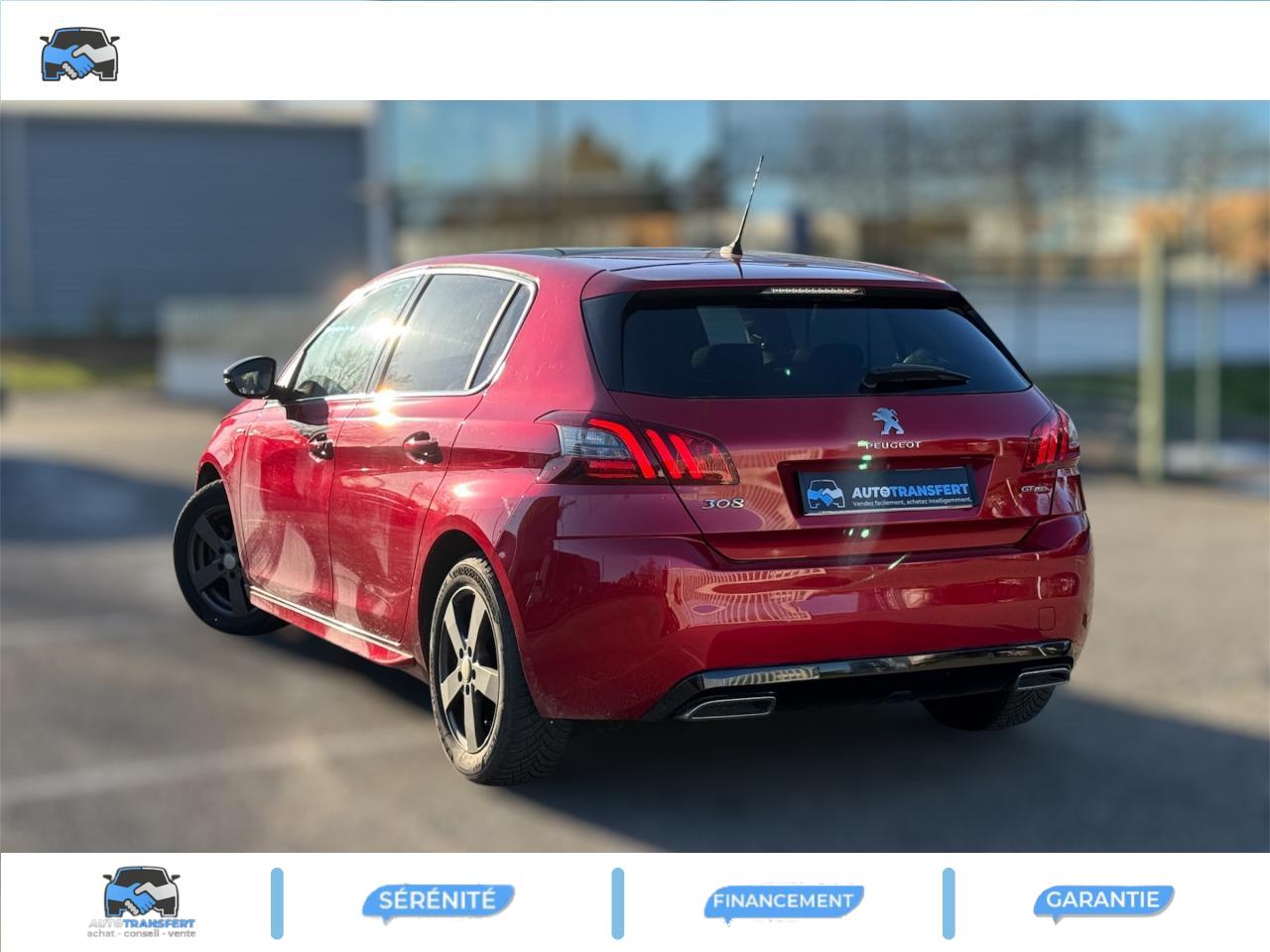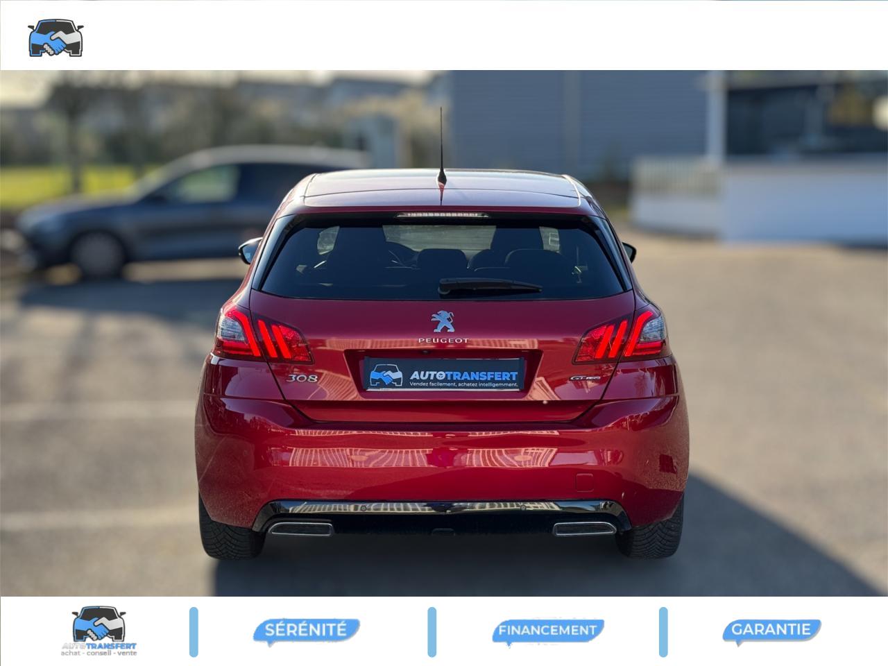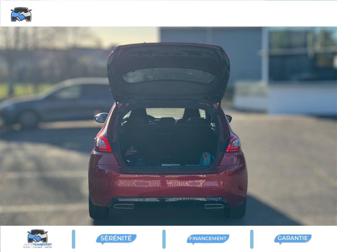 Accès et démarrage mains libres - inclut la prise USB en rang 2 et un plip supplémentaireAccoudoir central avant avec rangementAide graphique et sonore au stationnement arrièreAide graphique et sonore au stationnement avantAir conditionné automatique bi-zone (avec filtre à charbon actif, anti-odeurs)Airbags frontaux conducteur et passager adaptatifs (passager neutralisable), latéraux avant et rideaux avant et arrièreAllumage automatique des feux de détresseAssistance au freinage d'urgenceBadge GT Line sur les ailes avant et le pare-chocs arrièreBanquette arrière rabattable 1/3 - 2/3 avec dossier rabattable, assise fixeCommande de verrouillage à distance (deux plips)Enjoliveurs latéraux de bas de caisseKit de dépannage pneumatique (anneau de remorquage, compresseur et flacon de produit de colmatage)Lève-vitres électriques arrière à fonctions séquentielle et anti-pincementLève-vitres électriques avant à commande séquentielle et anti-pincementLunette arrière chauffantePEUGEOT Connect : Navigation connectée 3D avec reconnaissance vocale - Cartographie Europe avec connexion automatique et permanente aux services de Navigation connectée, SOS et Assistance, TéléservicesPommeau de levier de vitesses et frein à main en cuirPrise USBProjecteurs 'Peugeot Full LED Technology'Régulateur et limiteur de vitesseVisiopark 1 : caméra de recul avec restitution sur l'écran tactile d'une vue arrière, et d'une vue de dessus de l'environnement arrière du véhiculeVitres latérales et lunette arrière surteintéesVolant réglable en hauteur et en profondeur (mécanique)Volant spécifique, cuir pleine fleur avec surpiqûres rouges