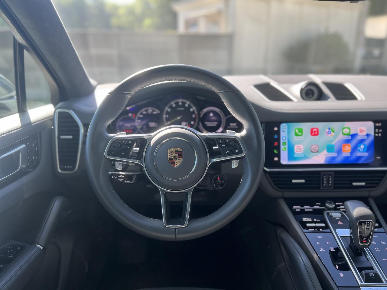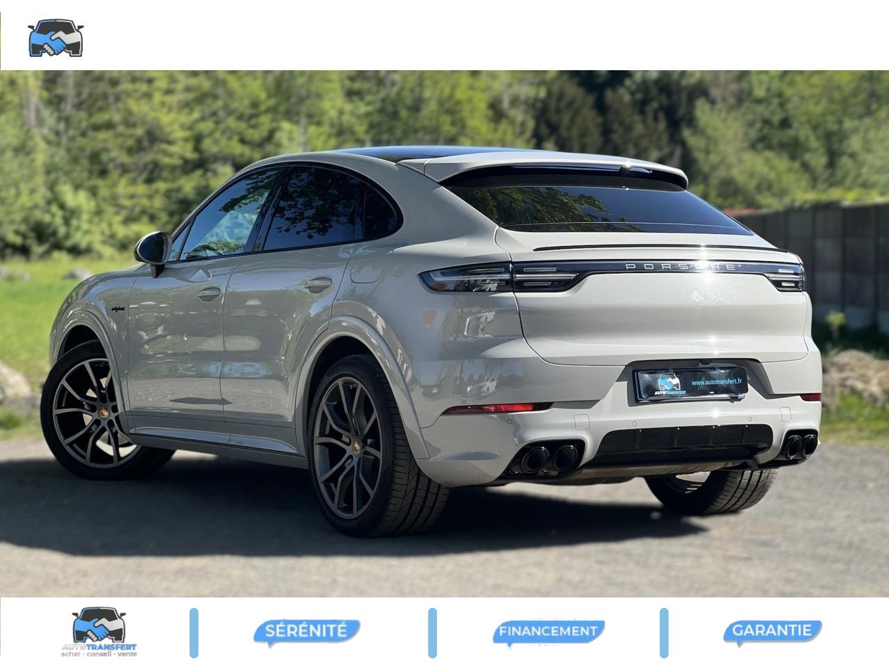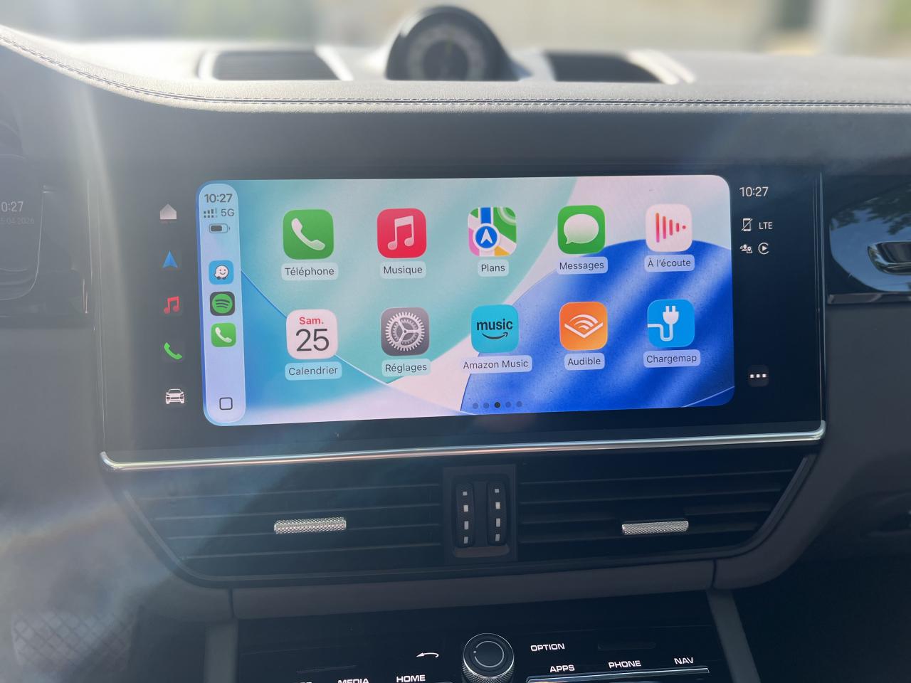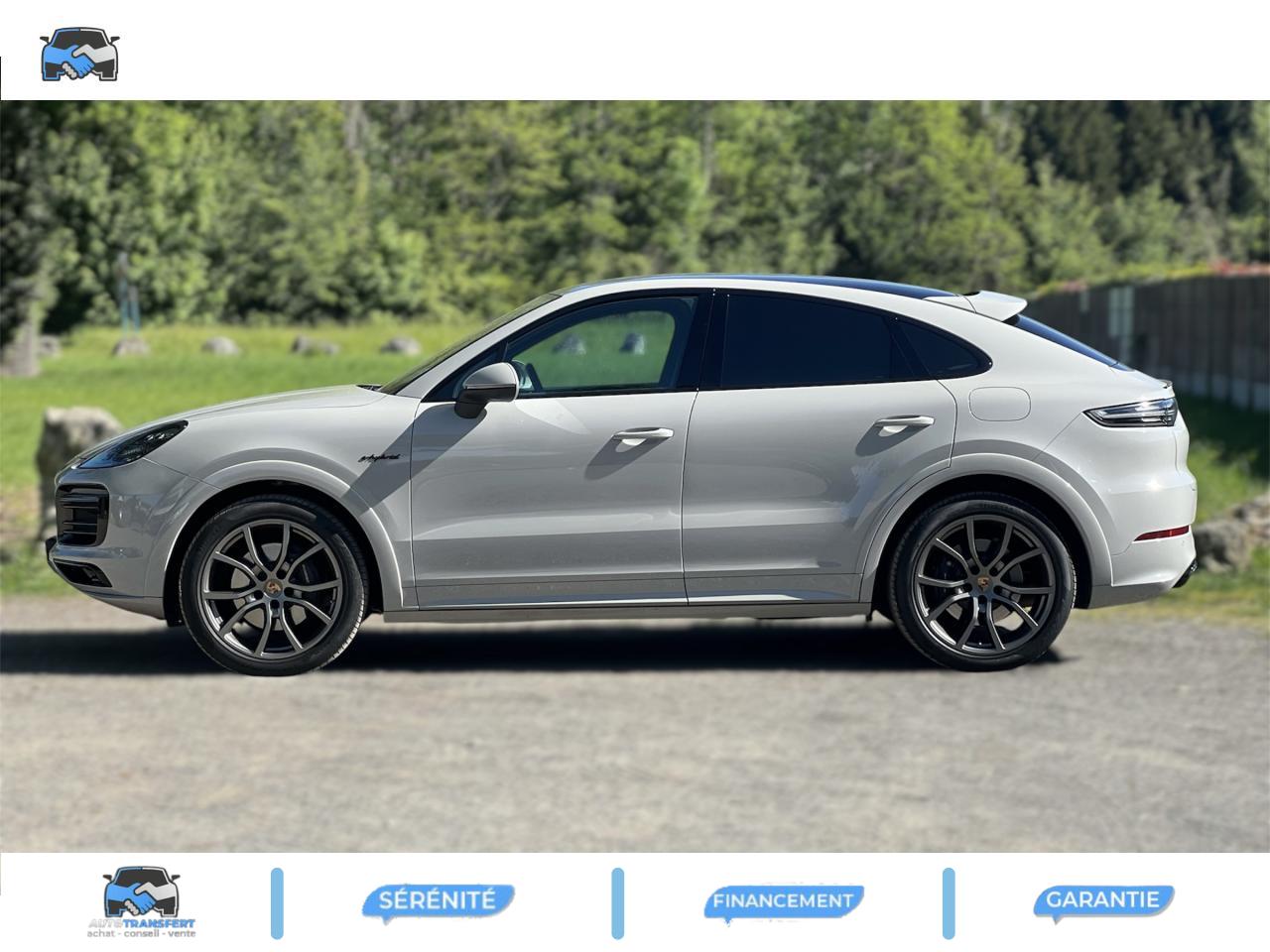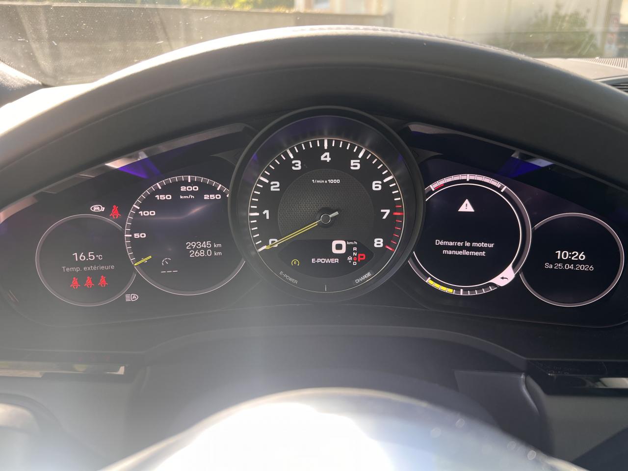 2 doubles sorties d’échappement, sur les côtés gauche et droit, acier brosséÉlectronique de puissance, batterie lithium-ion d’une capacité énergétique de 14 kWh et accessoires moteur électriques (compresseur de climatisation et servofrein électrique)Étriers fixes monobloc en aluminium à 6 pistons à l'avant et 4 pistons à l'arrière2 ports USB de chargement dans la console centrale arrière2 ports USB de chargement et de connexion dans le coffre de rangement de la console centrale avant4 places4 portes avec protection anti-encastrement latérale intégréeAccoudoir central AR avec 2 porte-gobelets, réglage longitudinalAir Curtains dans les passages de rouesAirbag genoux côté conducteur et passagerAirbags grand volume pour le conducteur et le passagerAirbags latéraux avant (siège avant)Airbags rideauxAlarme et double verrouillageAllumage automatique des feux en cas d'ouverture/fermeture du véhiculeApple CarPlayAssistance à la descente (Porsche Hill Control, PHC)Assistance parking avant et arrière avec caméra de reculAvertisseur de freinage d'urgenceBac de rangement dans la console centraleBaguettes de seuil de porte en Acier spécial avec monogramme du modèle à l’avant et à l'arrière : «Cayenne»Batterie allégéeBecquet arrière avec troisième feu de stop à LEDBecquet de toit arrière de couleur carrosserieBloc moteur en aluminiumBlocs optiques avant avec feux de position et clignotants à conducteurs de lumière à technologie LEDBoîte à gants réfrigéréeBoîte de vitesse Tiptronic S 8 rapportsBouclier avant avec prises d’air de refroidissement intégréesCâble de charge pour prise domestiqueCâble secteur permettant d’établir la connexion entre la prise industrielle rouge (400 V, 32 A, 5 broches) et l’unité de commandeCapot avant actifCapteur de pluieCapteur de retournementCarrosserie élargie à l'arrièreCarrosserie de conception allégée hybride entièrement galvanisée alliant Acier et AluminiumCarrosserie hybride en aluminium (capot moteur, hayon, portières et ailes)Ceintures de sécurité automatiques à 3 points avec prétensionneurs pyrotechniques à l'avant et à l'arrière, et limiteur d'effort à l'avantChâssis avec suspension à ressort hélicoïdauxChargeur embarqué (3.6 kW)Ciel de toit en tissuClimatisation automatique avec réglage individuel de la température pour le conducteur et le passager, commande automatique du recyclage de l’air avec capteur de qualité de l’air et réglage individuel du débit d’air côtés conducteur eCombiné d’instruments avec 2 écrans haute résolutionCompte-tours analogique central avec fond de compteur Noir, powermètre et aiguille en Vert AcideConcept d’éclairage de l’habitacle à LED : temporisation d’arrêt, éclairage bas d’habitacle avant et arrière, éclairage du cendrier, de la boîte à gants, du démarreurConnect Plus avec module de navigation en ligne, module téléphone LTE avec lecteur de carte SIM et accès Internet sans fil ainsi que Porsche Car Connect incluant de nombreux services Porsche ConnectContrôle de pression des pneus ( TPMS )Contrôle stabilité remorque et mode PSM SPORTContrôle vocalCouvre-bagages souple enroulableCrochet porte-vêtement sur les montants latéraux (gauche/droite)Culasse en aluminiumDéflecteurs (Airblades) avec entrées d’air latéralesDégivrage de lunette arrière avec arrêt automatiqueDémarrage sans cléDétecteur d'humiditéDiamètre des disques de frein de 360 mm à l’avant et 358 mm à l’arrièreDisques de freins avant et arrière ventilésEclairage d'alentourEntourage des vitres en finition noire brillanteEssieu arrière multibras en aluminiumEssieu avant multibras AluminiumEssuie-glace avant à 2 vitesses avec balayage intermittentEtriers de frein couleur Vert AcideFeux arrière à LED avec graphisme tridimensionnel, avec feux stop intégrés 4 points et bandeau lumineuxFeux de jours à DEL 4 pointsFiltre à charbon actifFiltre à particulesFonction Auto-HoldFrein de parking électriqueFrein multi-collisionHayon automatiqueInjection directe d’essence (Direct Fuel Injection, DFI) avec position centrale des injecteursInscription "e-hybrid" sur les ailes avant gauche et droite entourée en Vert AcideInserts des lamelles des entrées d’air en Noir (finition brillante)Jantes Cayenne Design 20 poucesKit de réparation avec compresseur électriqueLarge soubassement caréné aérodynamiqueLimiteur de vitesseMiroirs de courtoisie éclairés conducteur et passagerMode Individual pour la sélection de réglages sportifs personnalisés du véhiculeMode SPORT PLUS avec réglage axé sur les performances pour le moteur, la boîte de vitesse et le châssisMonogramme avec bordure Vert AcideMonogramme du modèle sur le hayon arrière, en couleur ArgentPack intérieur Noir, finition brillantePack Sport ChronoParamètres de personnalisation du conducteurPare-chocs constitué de traverses haute résistance et de 2 éléments de déformation, comportant chacun 2 logements taraudésPhares à LEDPoignées de portes couleur carrosseriePorsche Active Aerodynamics (PAA) avec becquet de toit à déploiement adaptatifPorsche Active Suspension Management (PASM)Porsche Communication Management (PCM) avec module de navigationPorsche Mobile Charger avec support mural, sac de transport et câble de 4,5 mètres de la voiture au chargeurPorsche Traction Management (PTM) : transmission intégrale dynamique avec différentiel central multidisque électroniquePorte-bouteilles dans les contre-portes avant et arrièrePorte-cartesPorte-gobelets doubles à diamètre variable à l'avant et à l'arrièrePré-équipement attelagePré-équipement pour le montage d'un système de transport sur toitPré-climatisationPrise 12 V dans la boîte à gants et le coffrePrise de courant 12 V dans la console centrale avantPrise de rechargeProtection anti-encastrement latérale dans les portièresRégulateur de châssis intégré Porsche 4D Chassis ControlRégu