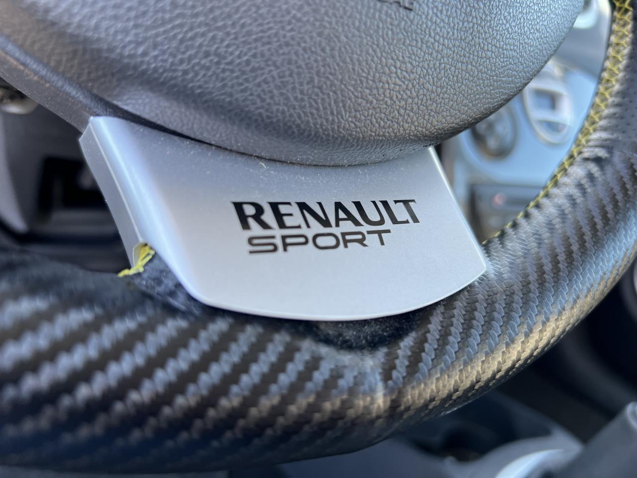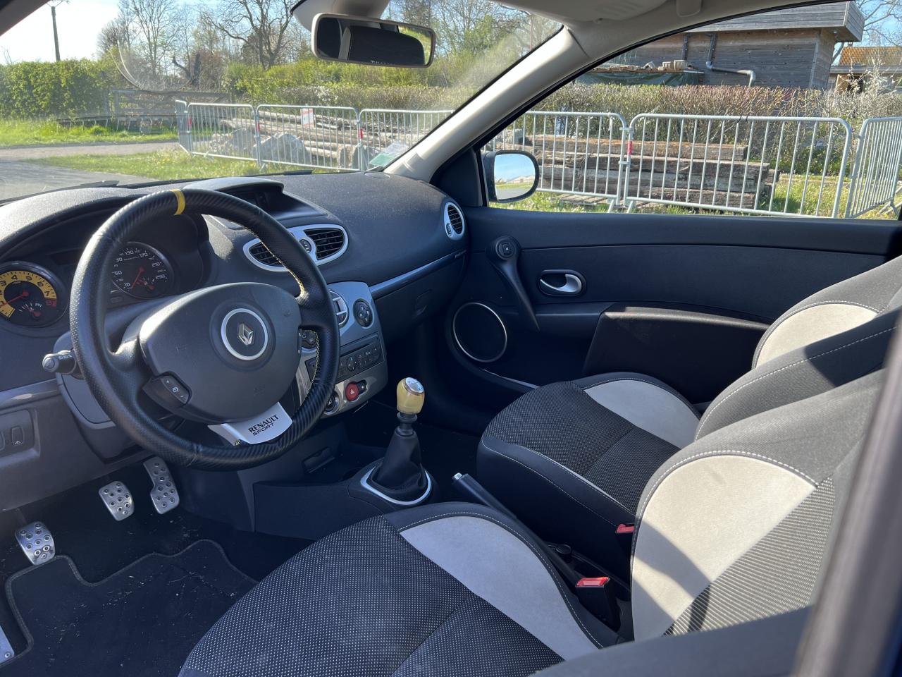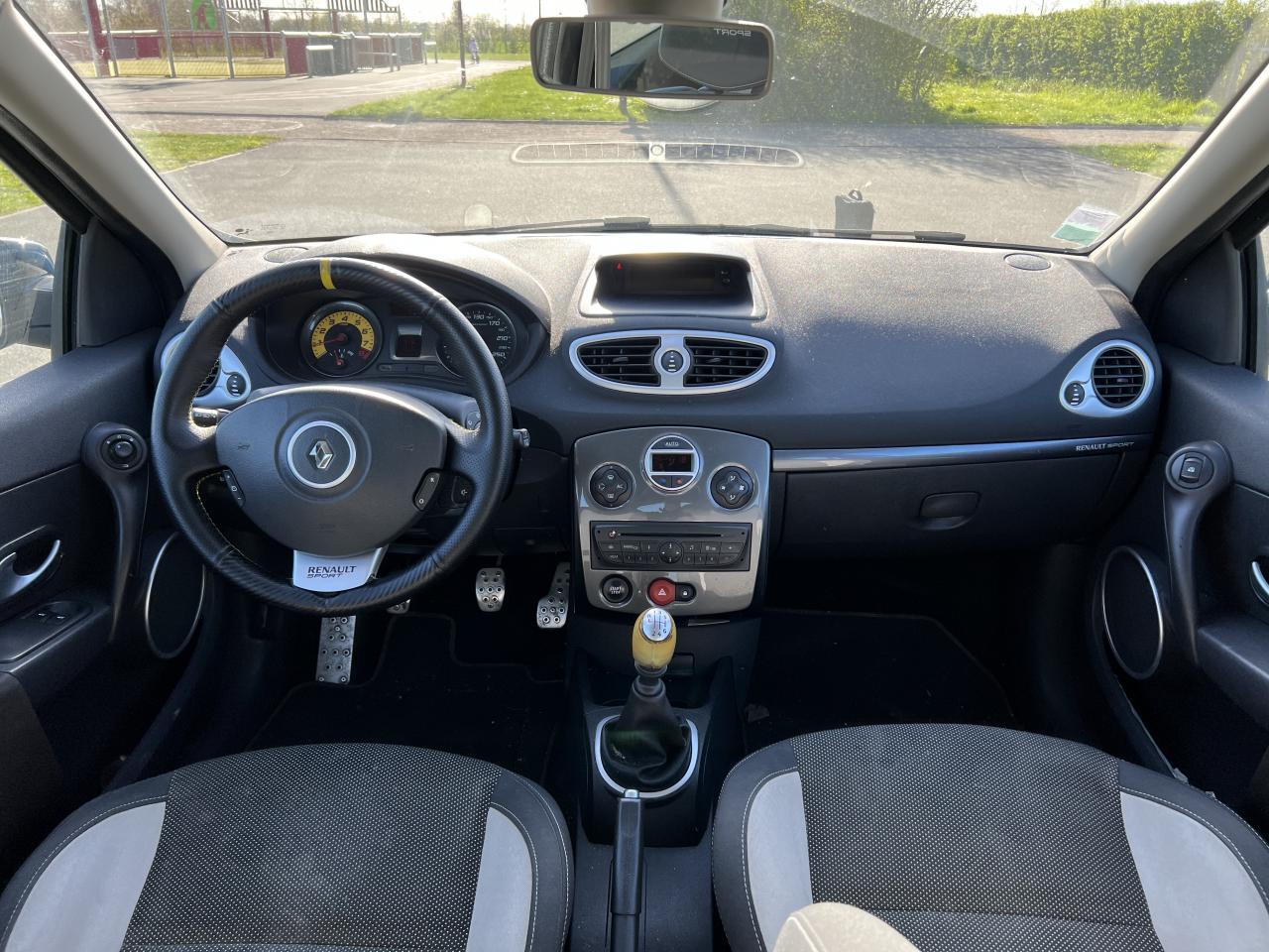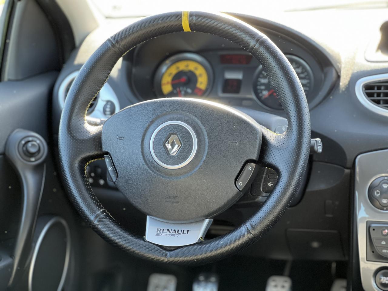 2 appuis-tête arrières « virgule » réglables en hauteur et vérouillables2 spots de lecture conducteur et passager avantABS avec Répartiteur Électronique de Freinage (EBV) sans Assistance au Freinage d'UrgenceAfficheur alphanumérique multifonctions : totaliseur Km, indicateur de maintenance, messages de conseils et d'alerteAfficheur central : date, heure, radioAfficheur température extérieureAirbag antiglissementAirbags frontaux auto-adaptatifs : conducteur (65 l) et passager (130 l)Airbags rideaux de tête avant et arrièreAppuis-tête avant réglables en hauteur « Nouvelle génération »Avertisseur d'oubli de bouclage ceinture conducteurBaguette de planche de bord jauneBandeau de bouclier noir brillantBoîte à gants (9,4 l) réfrigéréeCeinture de sécurité arrière : 3 points à enrouleurs sur les 2 places avec limiteur d'effortCeinture de sécurité avant réglable en hauteur : 3 points à enrouleurs avec prétensionneur et limiteur d'effort intégréChâssis CUP « Renault Sport » et étriers de freins avant rougeClé de décondamnation à distance à insert rabattableClimatisation manuelleCoiffe de planche avec visière intégrée - SlushCommande ouverture extérieure chrome satinéeCommande ouverture intérieure chrome satinéConsole centrale injectée : Carbone FoncéContrôle dynamqiue de trajectoire ESPCoquilles de rétroviseurs noir brillantDiffuseur arrière Noir BrillantDouble canules d'échappement chroméesEclairage de coffreEclairage intérieur temporiséEntourage d'aérateurs chrome satinéEssuie-glace arrière avec déclenchement automatique en marche arrièreFonctionnalité dossier arrière 1/3 2/3, assise fixeGarniture de bas de marche carbone foncé avec marquage Renault SportInhibition manuelle des airbags passager avantJantes alliage 17" AX-L Dark MétalKit de dépannage provisoire de pneumatiquesLève-vitres avant impulsionnel anti-pincement conducteur et éléctrique passagerOrdinateur de bord multifonctionsPatins de pédales en aluminium brosséPommeau de levier de vitesses en croûte de cuirProjecteurs à double optique masque noirProjecteurs antibrouillardProtections latérales : embout de baguette « chrome satiné » marqué « Renault Sport »Radiosat 80w CD MP3 avec prise RCARégulateur et limiteur de vitesseRétroviseurs extérieurs électriques et dégivrant, à miroir asphériqueRétroviseurs extérieurs électriques, dégivrants et rabattables électriquementSellerie Renault Sport jauneSpoiler lame F1 avant Noir BrillantStripping sur pied milieu noirSystème Isofix de siège enfant : aux places arrière latéralesSystème Isofix de siège enfant : sur place passager avantTableau de bord avec cadrans cerclés et fond du compte-tours jaune avec centre noir - aigulles rouges - chiffres blancs - afficheur centralVitres surteintées à l'arrièreVolant réglable en hauteurVolant Sport cuir carbone foncé avec surpiqûre fil gris et point milieu couture jaune
