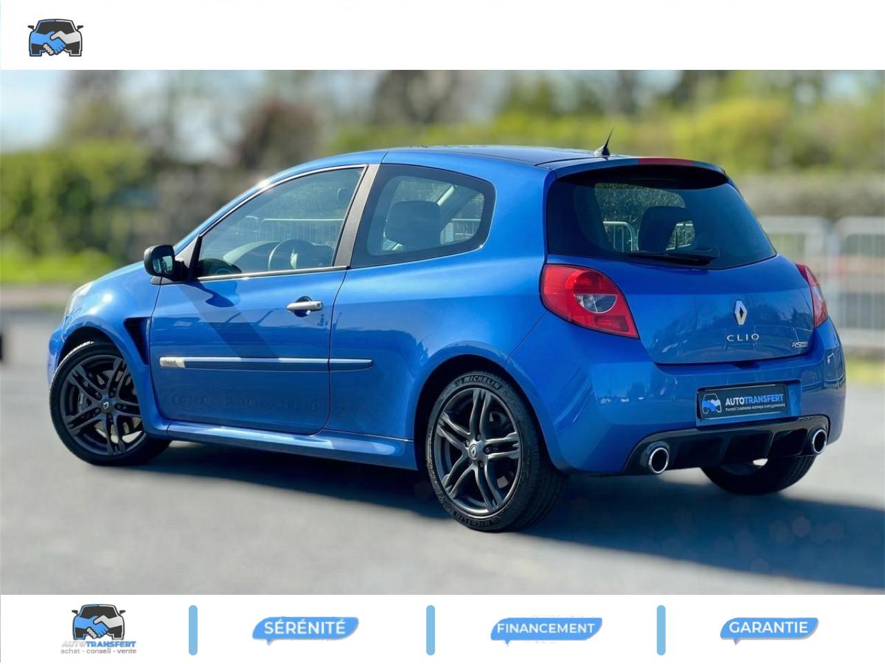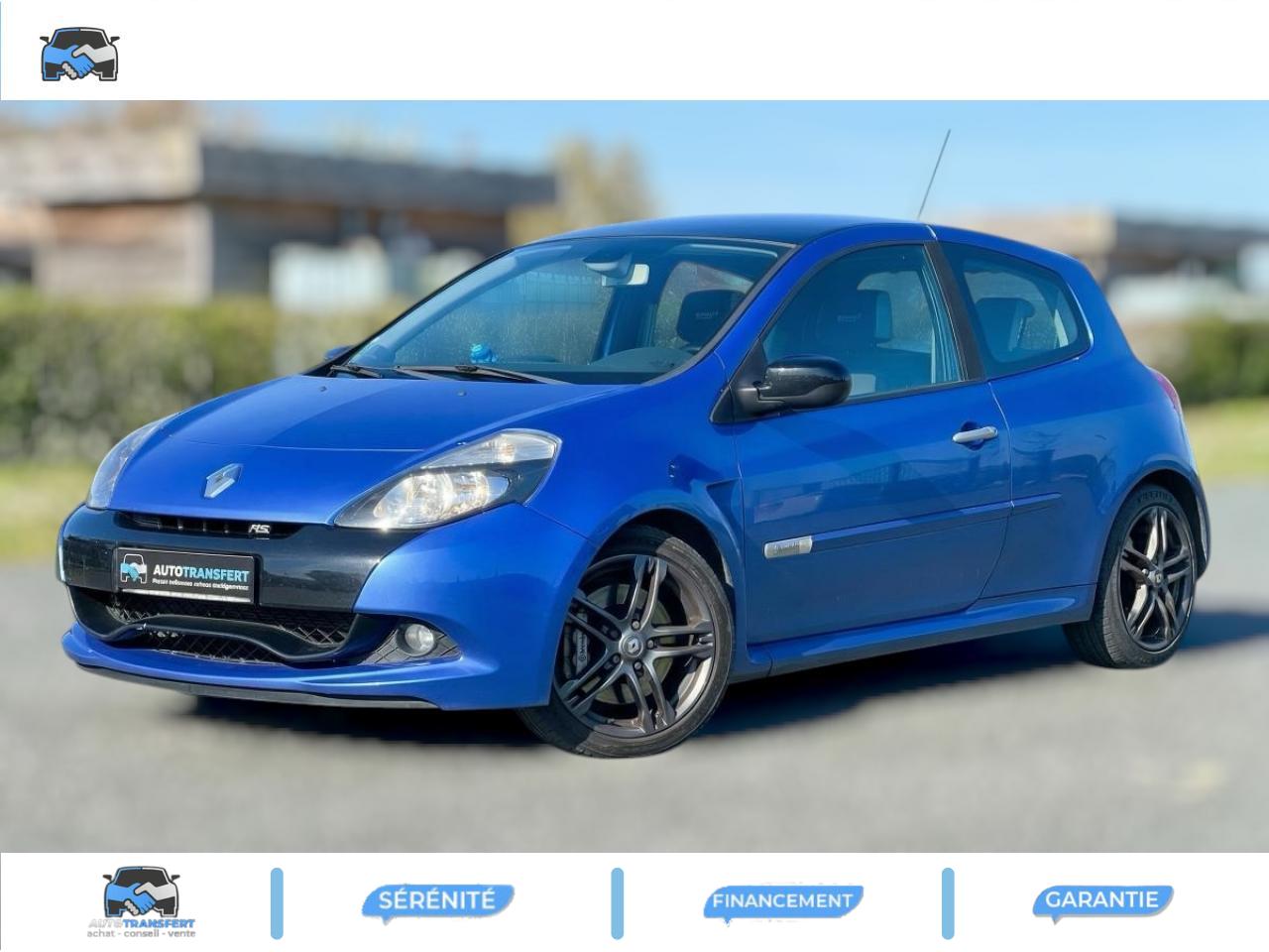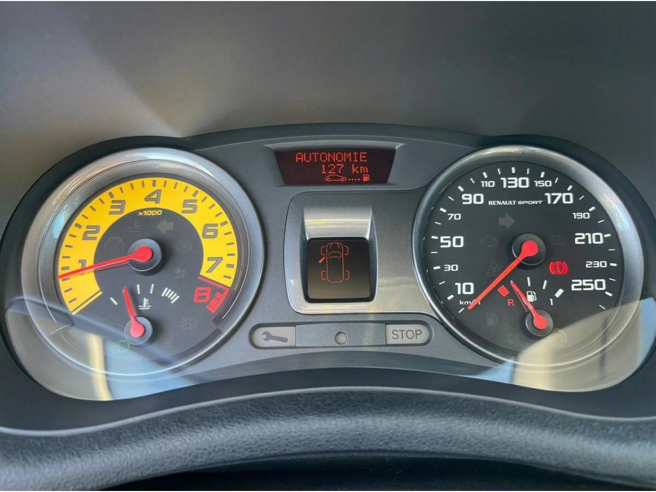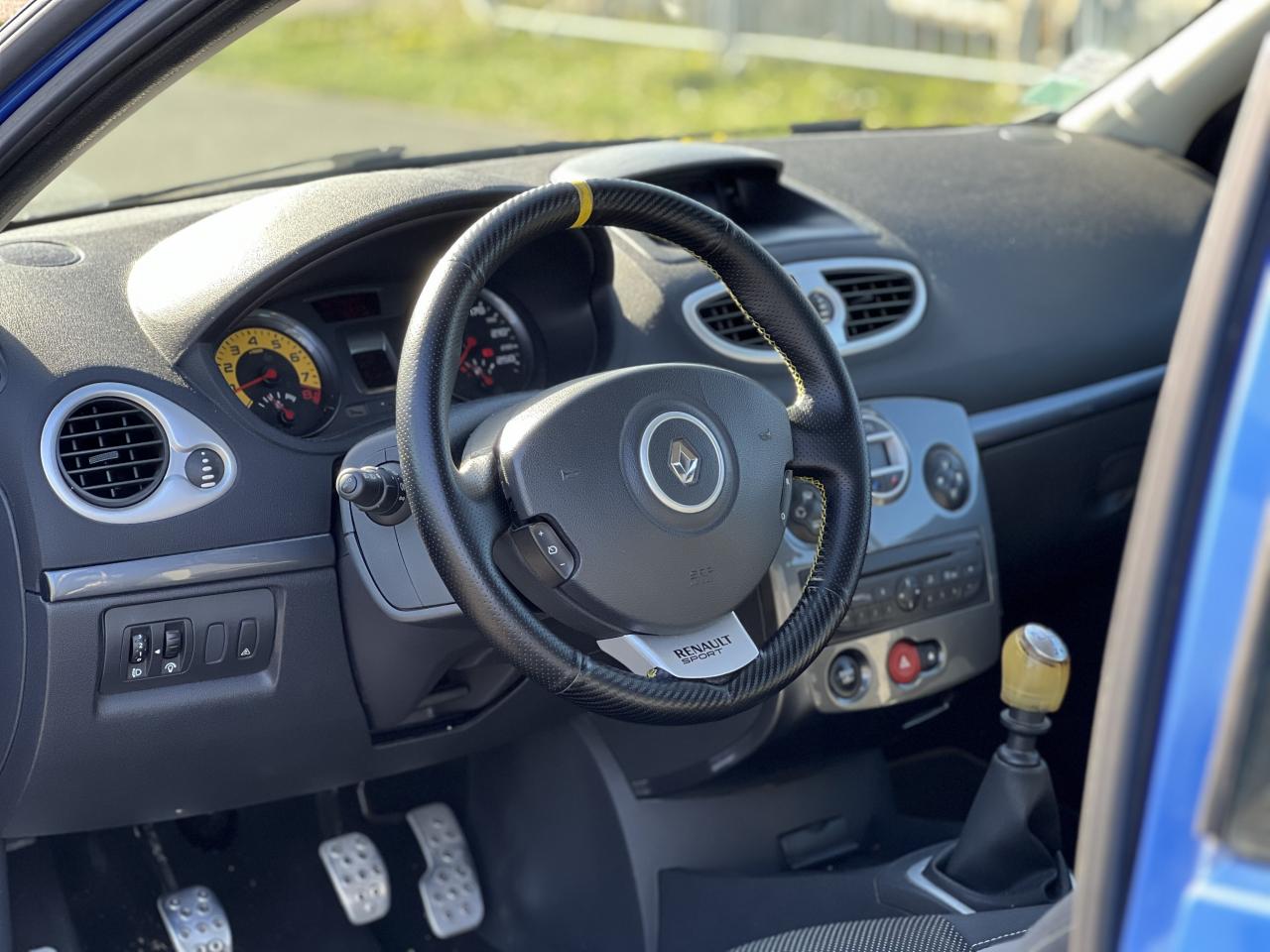 2 appuis-tête arrières « virgule » réglables en hauteur et vérouillables2 spots de lecture conducteur et passager avantABS avec Répartiteur Électronique de Freinage (EBV) sans Assistance au Freinage d'UrgenceAfficheur alphanumérique multifonctions : totaliseur Km, indicateur de maintenance, messages de conseils et d'alerteAfficheur central : date, heure, radioAfficheur température extérieureAirbag antiglissementAirbags frontaux auto-adaptatifs : conducteur (65 l) et passager (130 l)Airbags rideaux de tête avant et arrièreAppuis-tête avant réglables en hauteur « Nouvelle génération »Avertisseur d'oubli de bouclage ceinture conducteurBaguette de planche de bord jauneBandeau de bouclier noir brillantBoîte à gants (9,4 l) réfrigéréeCeinture de sécurité arrière : 3 points à enrouleurs sur les 2 places avec limiteur d'effortCeinture de sécurité avant réglable en hauteur : 3 points à enrouleurs avec prétensionneur et limiteur d'effort intégréChâssis CUP « Renault Sport » et étriers de freins avant rougeClé de décondamnation à distance à insert rabattableClimatisation manuelleCoiffe de planche avec visière intégrée - SlushCommande ouverture extérieure chrome satinéeCommande ouverture intérieure chrome satinéConsole centrale injectée : Carbone FoncéContrôle dynamqiue de trajectoire ESPCoquilles de rétroviseurs noir brillantDiffuseur arrière Noir BrillantDouble canules d'échappement chroméesEclairage de coffreEclairage intérieur temporiséEntourage d'aérateurs chrome satinéEssuie-glace arrière avec déclenchement automatique en marche arrièreFonctionnalité dossier arrière 1/3 2/3, assise fixeGarniture de bas de marche carbone foncé avec marquage Renault SportInhibition manuelle des airbags passager avantJantes alliage 17" AX-L Dark MétalKit de dépannage provisoire de pneumatiquesLève-vitres avant impulsionnel anti-pincement conducteur et éléctrique passagerOrdinateur de bord multifonctionsPatins de pédales en aluminium brosséPommeau de levier de vitesses en croûte de cuirProjecteurs à double optique masque noirProjecteurs antibrouillardProtections latérales : embout de baguette « chrome satiné » marqué « Renault Sport »Radiosat 80w CD MP3 avec prise RCARégulateur et limiteur de vitesseRétroviseurs extérieurs électriques et dégivrant, à miroir asphériqueRétroviseurs extérieurs électriques, dégivrants et rabattables électriquementSellerie Renault Sport jauneSpoiler lame F1 avant Noir BrillantStripping sur pied milieu noirSystème Isofix de siège enfant : aux places arrière latéralesSystème Isofix de siège enfant : sur place passager avantTableau de bord avec cadrans cerclés et fond du compte-tours jaune avec centre noir - aigulles rouges - chiffres blancs - afficheur centralVitres surteintées à l'arrièreVolant réglable en hauteurVolant Sport cuir carbone foncé avec surpiqûre fil gris et point milieu couture jaune