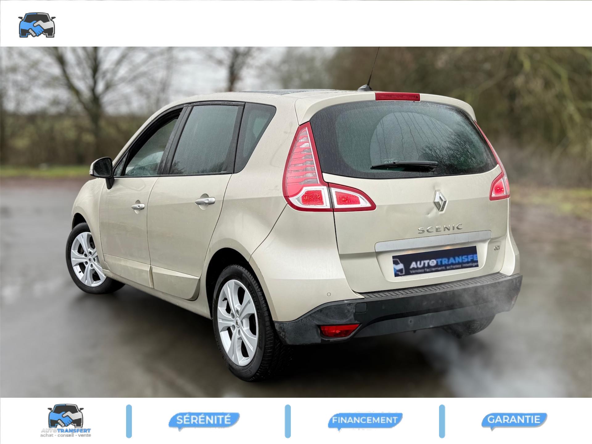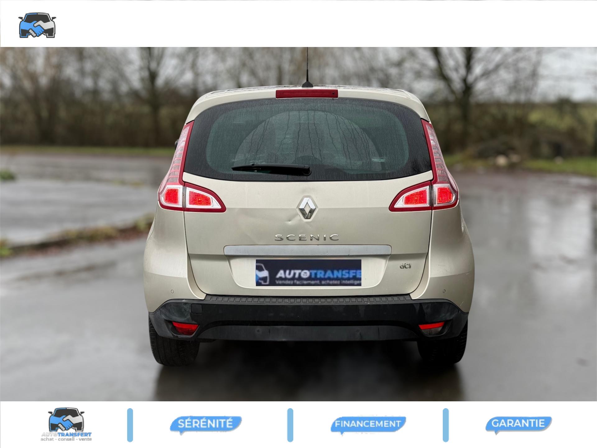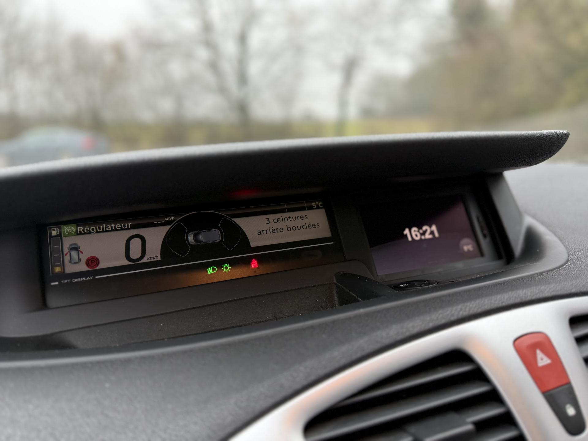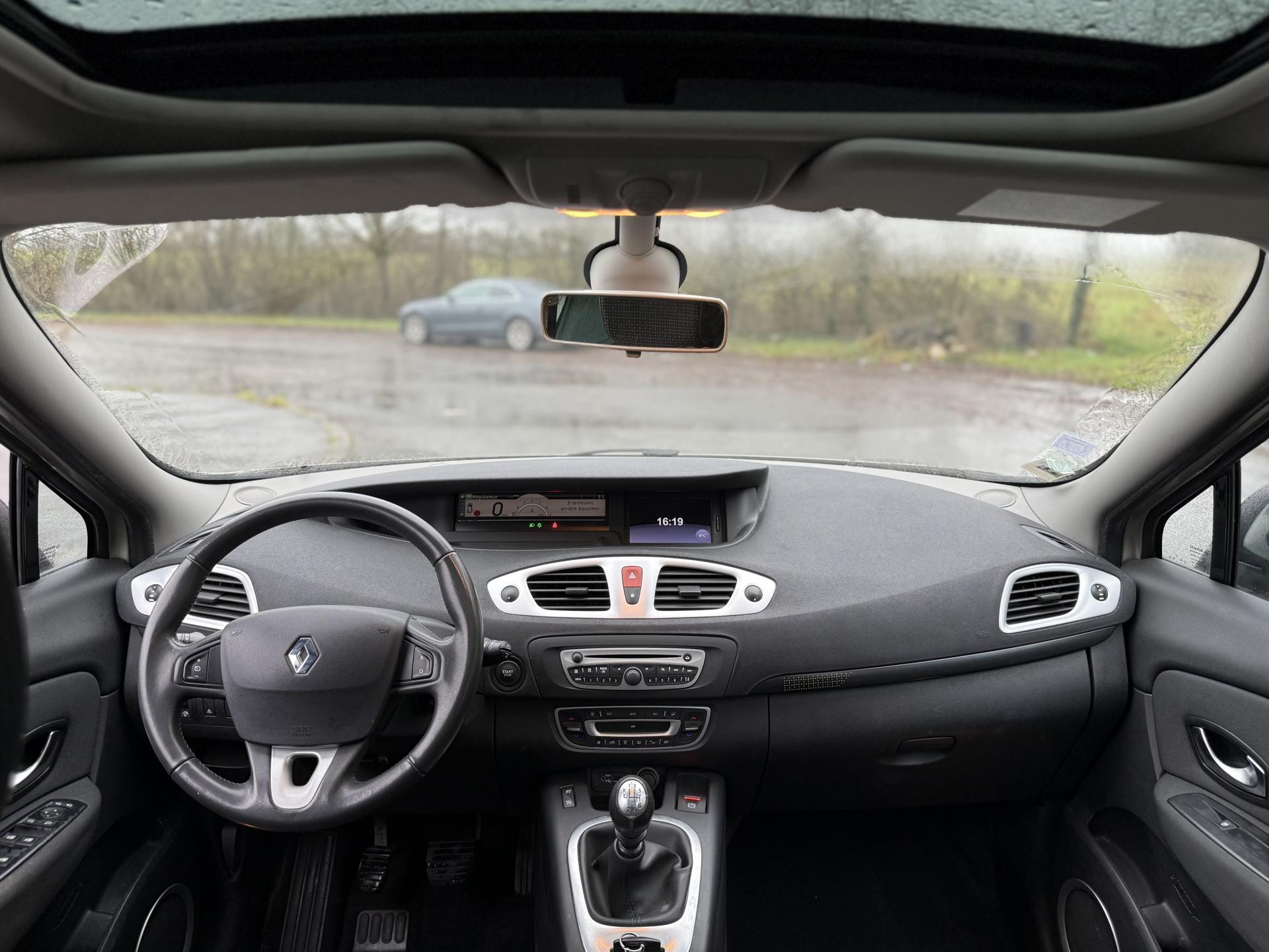 2 sièges de 3è rang, escamotables3 sièges de 2è rang, individuels, extractibles, dossiers rabattables et inclinables, fonction portefeuilleABS avec aide au freinage d'urgenceAide au stationnement arrièreAirbags frontaux conducteur et passager adaptatifs (airbag passager déconnectable)Airbags latéraux thorax/abdomen/bassin conducteur et passager avantAirbags rideaux de têtes aux places avant et arrièreAllumage automatique des feux de détresseAllumage automatique des projecteursAllumage et extinction progressifs de l'éclairage intérieur commandés par la carte RenaultAntidémarrage électronique codé activé par transpondeurAppuis-tête avant à réglage confortAppuis-tête réglables en hauteur à toutes les placesBoîte à gants éclairée et réfrigéréeCache-bagages amovible à positions multiplesCarminat TomTomCarte Renault, accès et démarrage « mains-libres »Ceintures de sécurité avant 3 points avec double prétensionneurs adaptatifs et limiteurs d'effortCeintures de sécurité centrale et latérales arrière 3 points, avec limiteurs d'effortCendrier nomade et allume cigare (prise 12 volts)Climatisation régulée bi-zone, filtre d'habitacle et aérateurs latéraux au rang 2Condamnation automatique des ouvrants en roulantConduits de chauffage au rang 2Console centrale de rangement coulissante avec accoudoir coulissantContrôle dynamique de trajectoire (ESC), fonction antipatinage ASR (déconnectable), contrôle de sous-virage (CSV)Crochets (x4) d'arrimage des bagages dans le coffreDirection à assistance variable électriqueEclairage d'extérieur d' accompagnementEclaireurs de cave et sol avant et arrièreEssuie-glace à déclenchement automatiqueEssuie-glace arrière avec déclenchement automatique en marche arrièreFrein de parking assistéJantes en alliage 16" « Spirale »Kit de réparation de pneusKit mains libres de téléphonie BluetoothLève-vitres avant et arrière électriques, à impulsion avec dispositif anti-pincementMasques de projecteurs noir grand brillantMiroir de conversationMiroirs de courtoisie éclairésMontants de vitres avant et enjoliveurs de pied milieu noir grand brillantOrdinateur de bord (7 fonctions)Pack CityPack Look ScenicPare-soleil latéraux de rang 2Poches aumônières au dos des sièges avant (1 en bas, 2 en haut)Poignées de portes extérieures chrome satiné (si Carte Renault mains-libres)Prise 12 volts rangs 2 et 3 (ou de coffre en version 5 places)Prise 12V dans le coffreProjecteurs antibrouillardRadioSat "3D Sound By Arkamys", Bluetooth, 140w CD MP3, connexion "Plug & Music"RadioSat « 3D Sound By Arkamys », Bluetooth, 140w CD MP3, bornier numérique « Plug & Music »Range-lunettes côté conducteurRecyclage de l'airRégulateur et limiteur de vitesseRétroviseur intérieur électrochromeRétroviseurs extérieurs couleur carrosserieRétroviseurs extérieurs électriques et dégivrantsSellerie « Lilox » chocolatSiège central arrière avec mise en tabletteSiège conducteur à réglage lombaireSiège conducteur réglable en hauteurSiège passager avant rabattableSiège passager réglable en hauteurSpots de lecture conducteur et passager, de rang 2 et de rang 3 (6 en tout)Surtapis en rangs 1 et 2 (chocolat)Système de fixation ISOFIX 3 points pour siège enfant aux 3 places arrière rang 2Système de surveillance de la pression des pneumatiquesTableau de bord à écran couleur personnalisable à technologie TFTTablettes aviation au dos des sièges avantTapis de sol chocolatTémoin d'oubli de ceinture à tous les rangsTiroirs sous les sièges arrièreTiroirs sous les sièges avantTrappes de rangement sous les pieds avant et arrièreVolant et pommeau de levier de vitesse gainés de cuirVolant réglable en hauteur et en profondeur